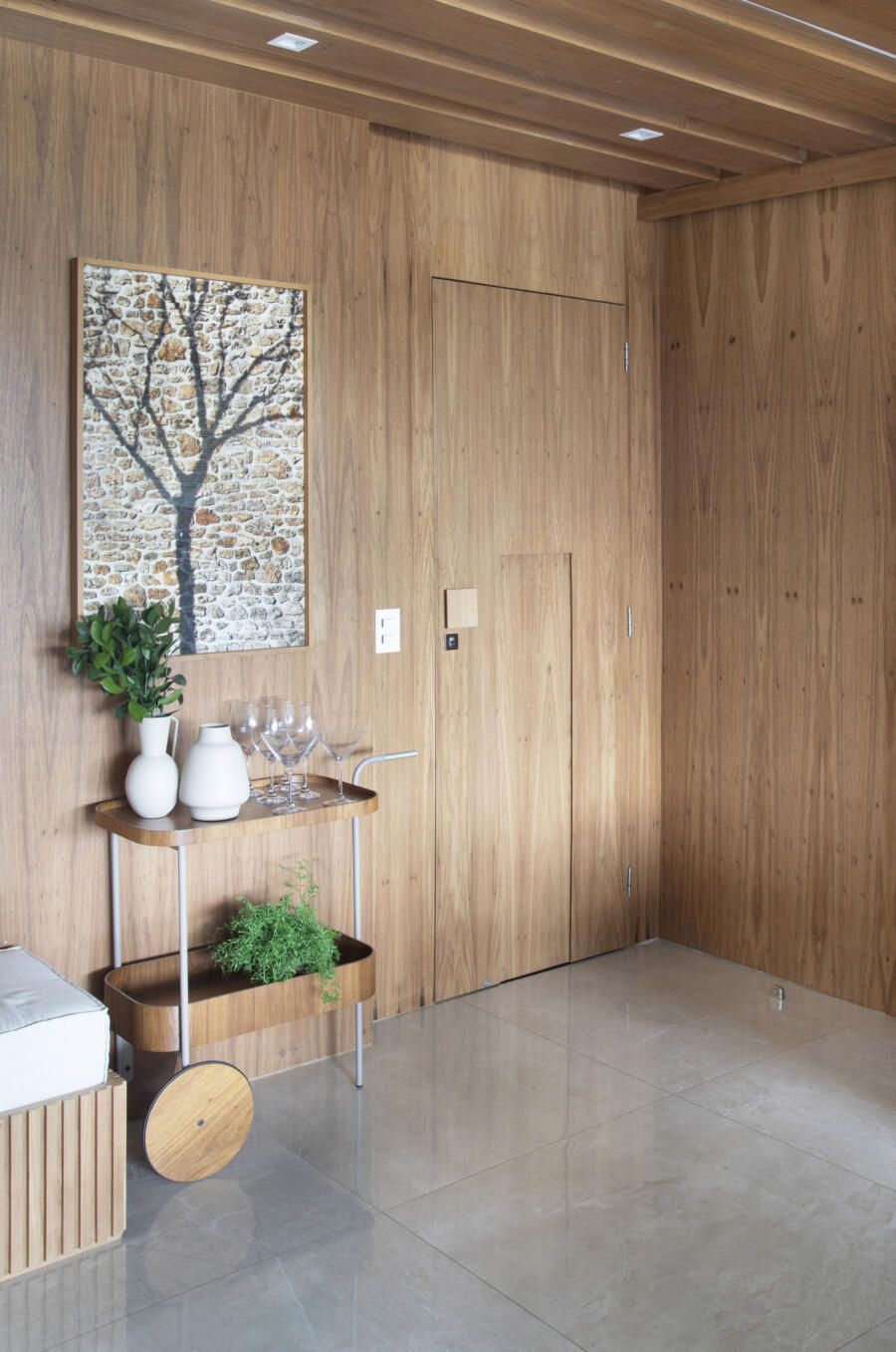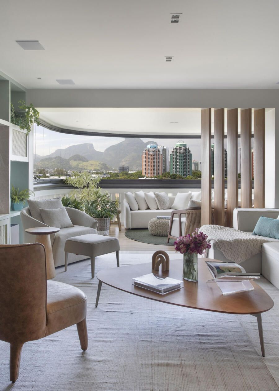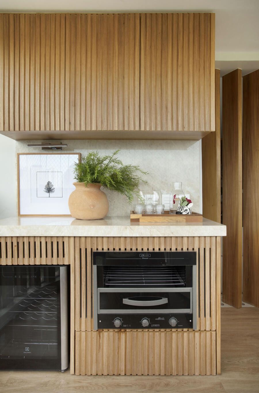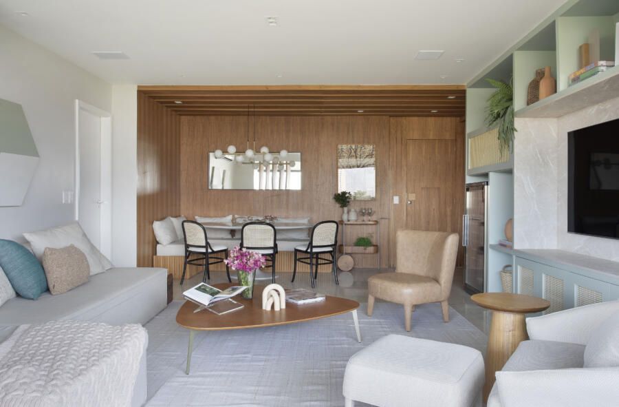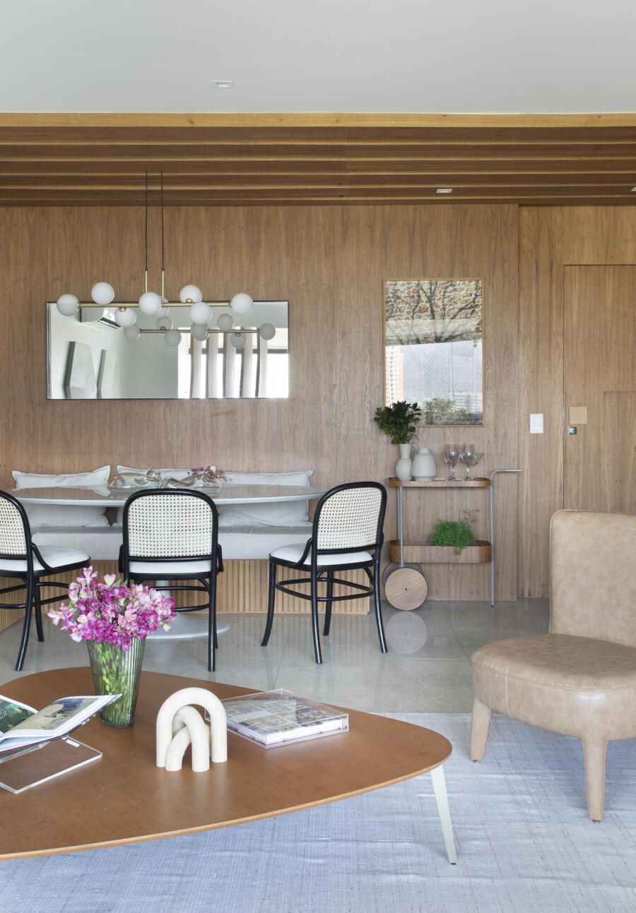 A arquiteta ainda apostou em painéis de freijó lisos para as laterais e ripados do teto, delimitando visualmente o espaço, deixando-o mais acolhedor e mimetizando as portas de entrada e acesso à cozinha. Brises verticais na lateral do sofá da sala de estar também foram a solução encontrada para demarcar o espaço da antiga varanda sem obstruir a vista.