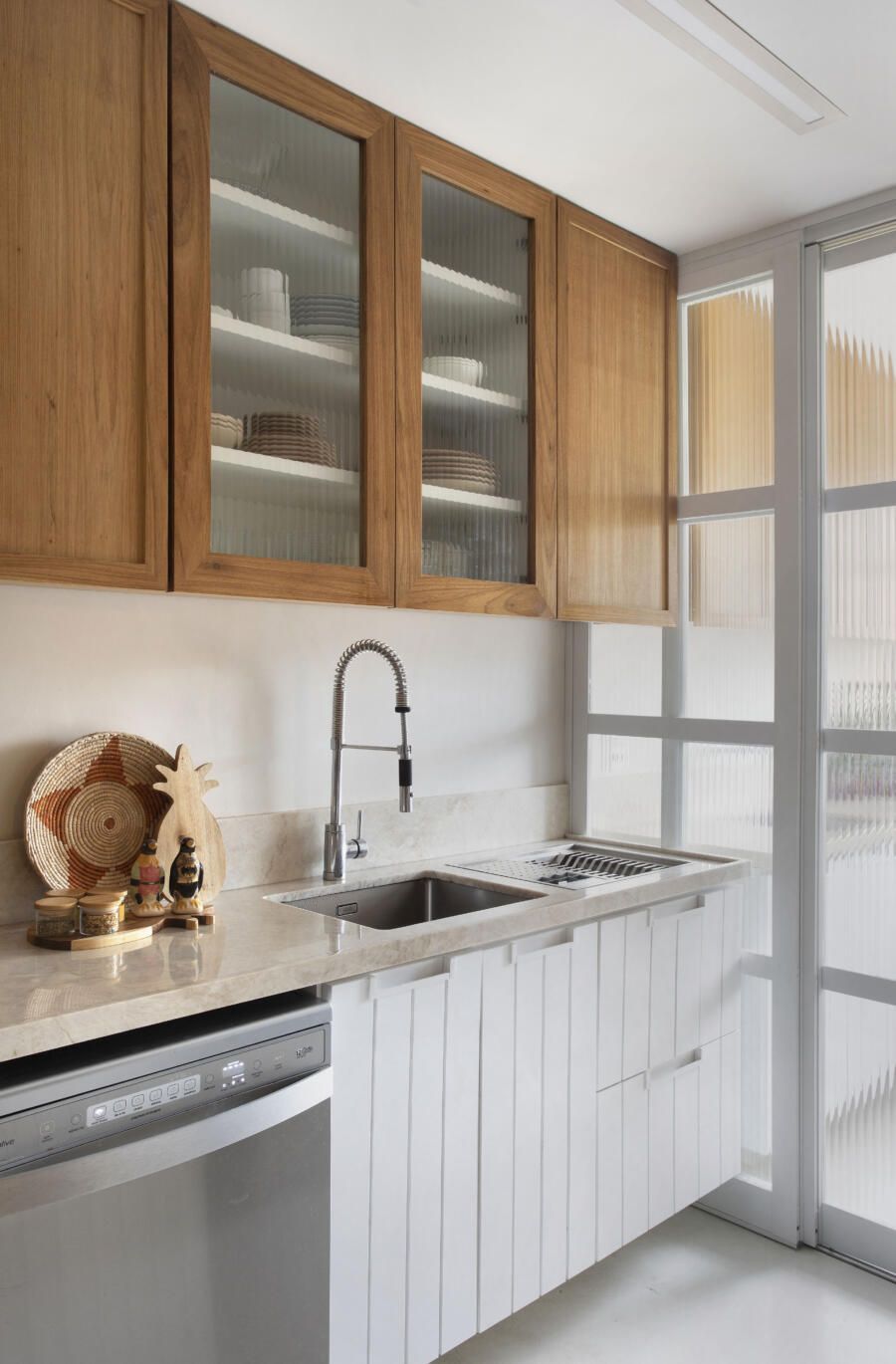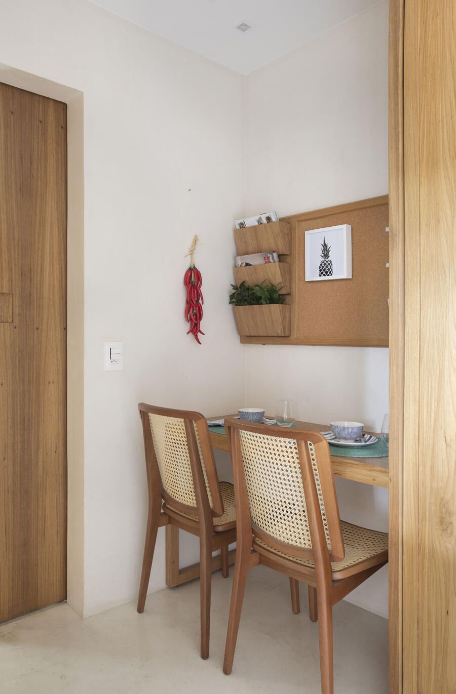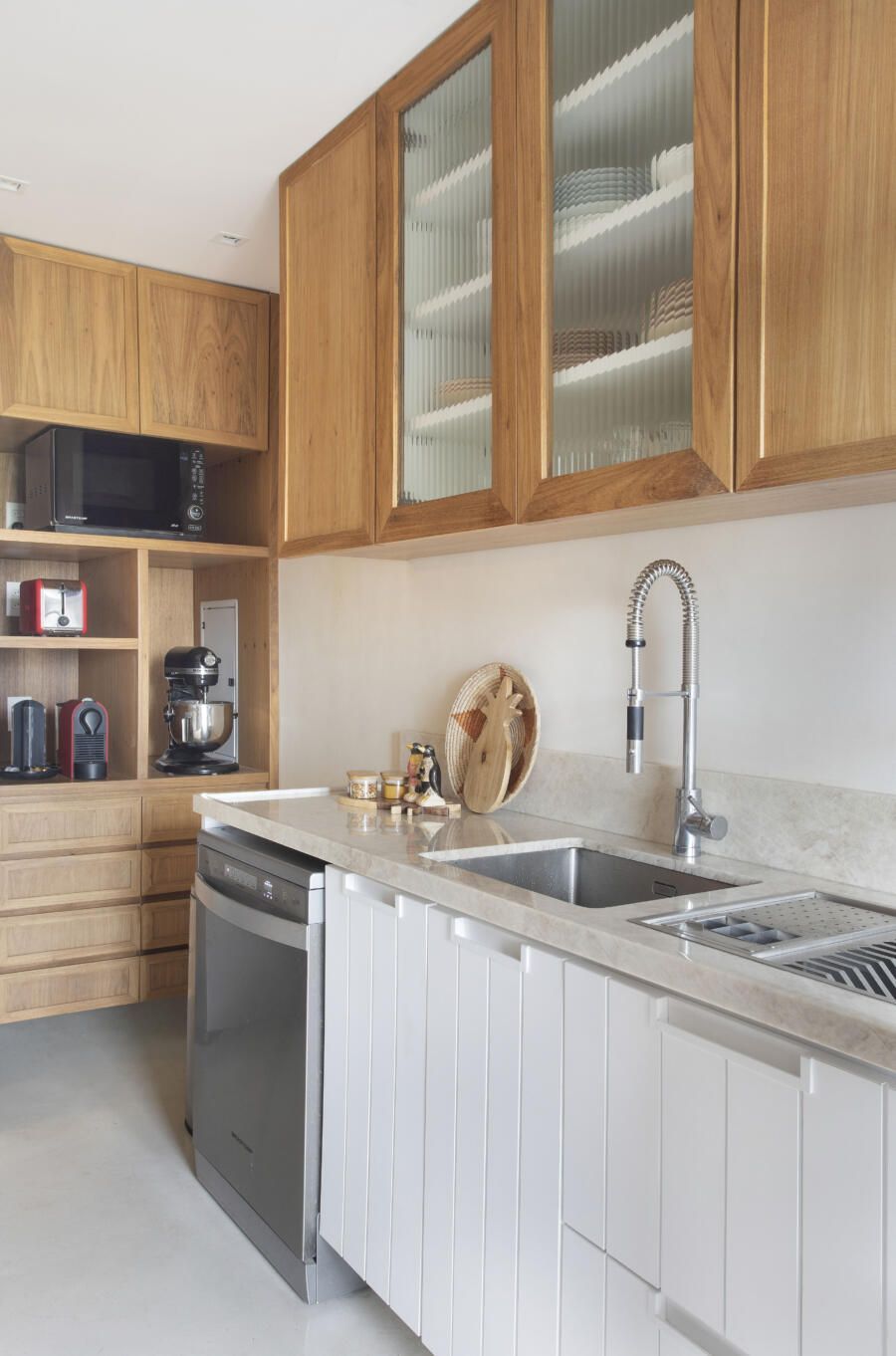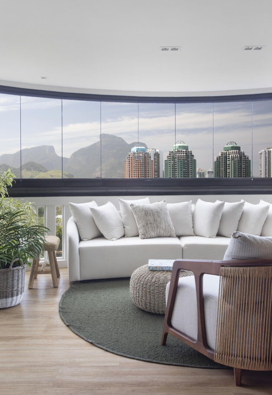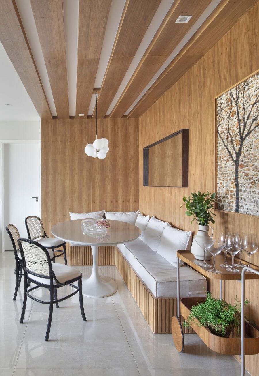 A arquiteta ainda apostou em painéis de freijó lisos para as laterais e ripados do teto, delimitando visualmente o espaço, deixando-o mais acolhedor e mimetizando as portas de entrada e acesso à cozinha. Brises verticais na lateral do sofá da sala de estar também foram a solução encontrada para demarcar o espaço da antiga varanda sem obstruir a vista.