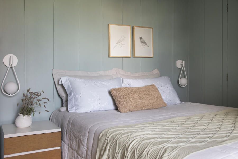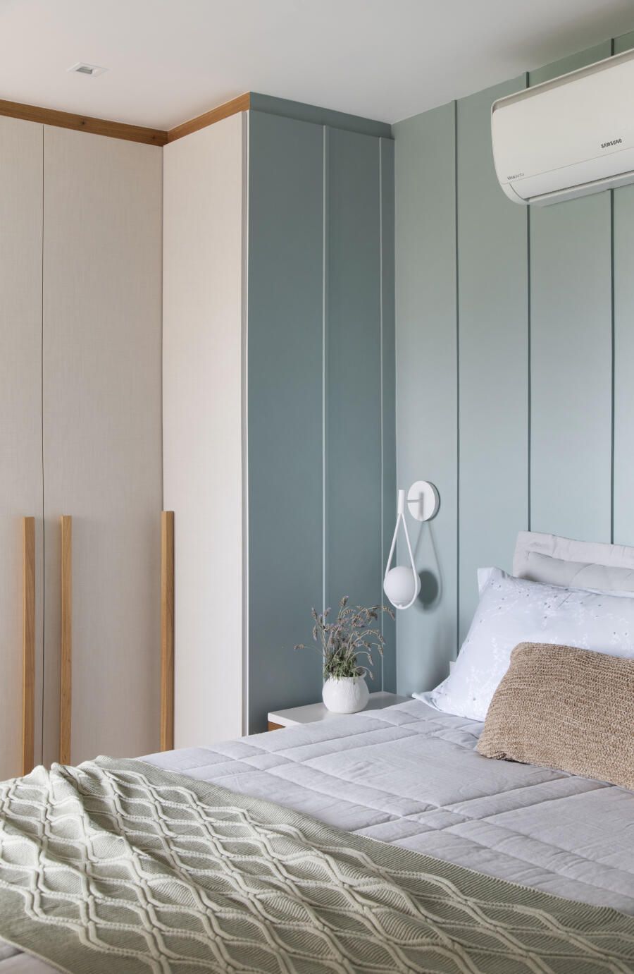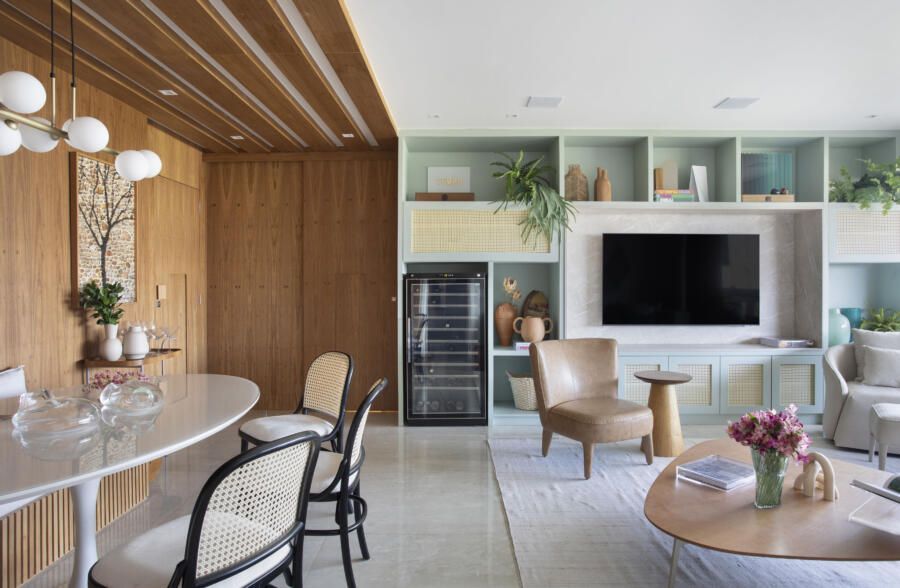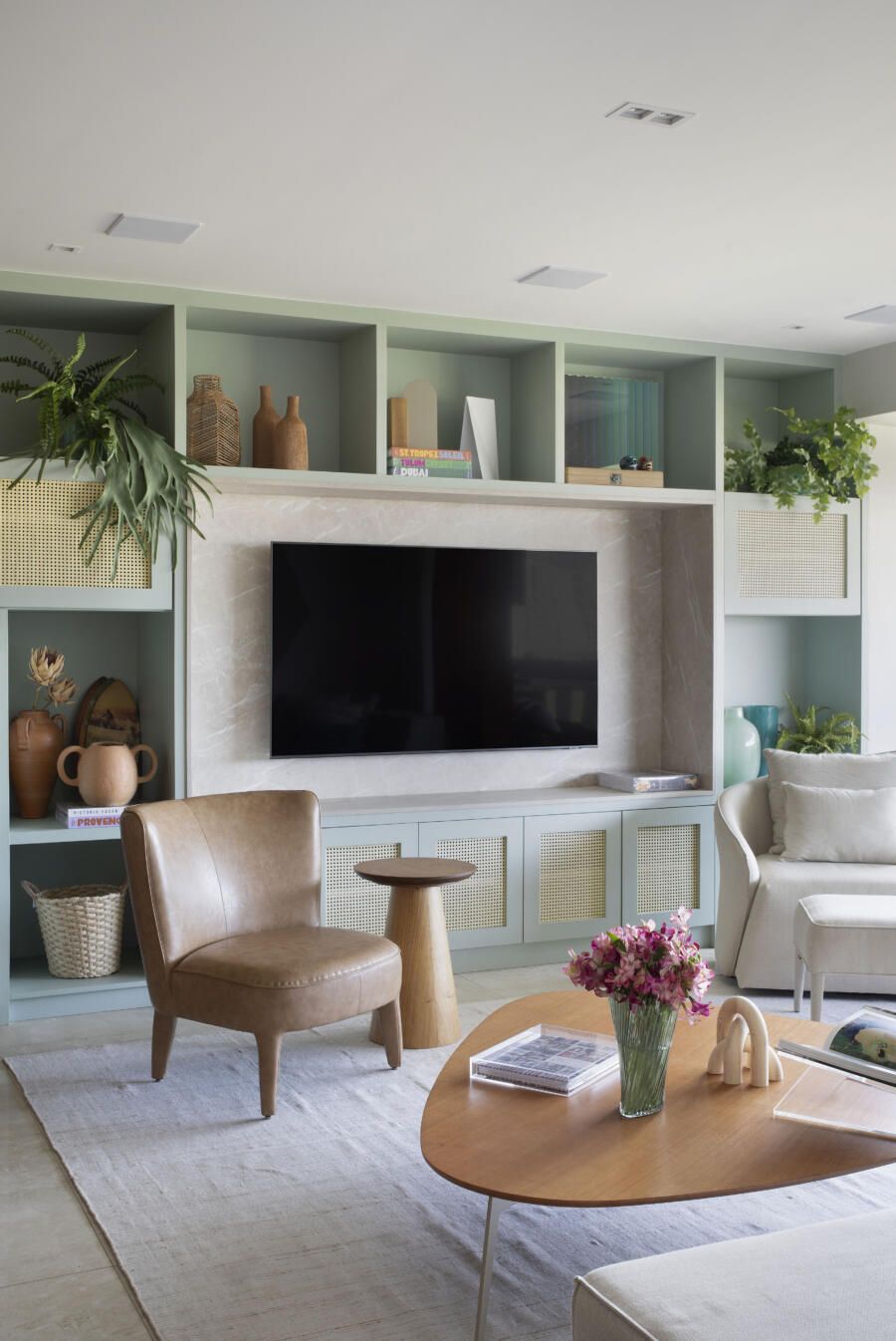 “Inicialmente, o Thiago mostrou como referência um projeto do nosso escritório que era bem neutro e claro, e sinalizou que não queria cores. Depois, buscamos inspiração na icônica pedra preciosa verde Tiffany, para pintar a estante da sala, só que num tom mais clarinho, e a partir daí definimos os demais acabamentos.”