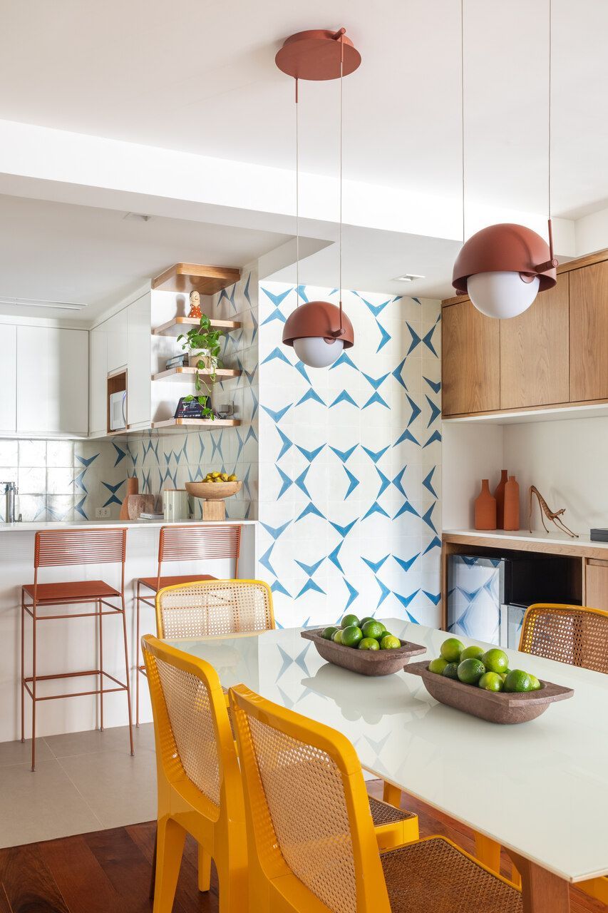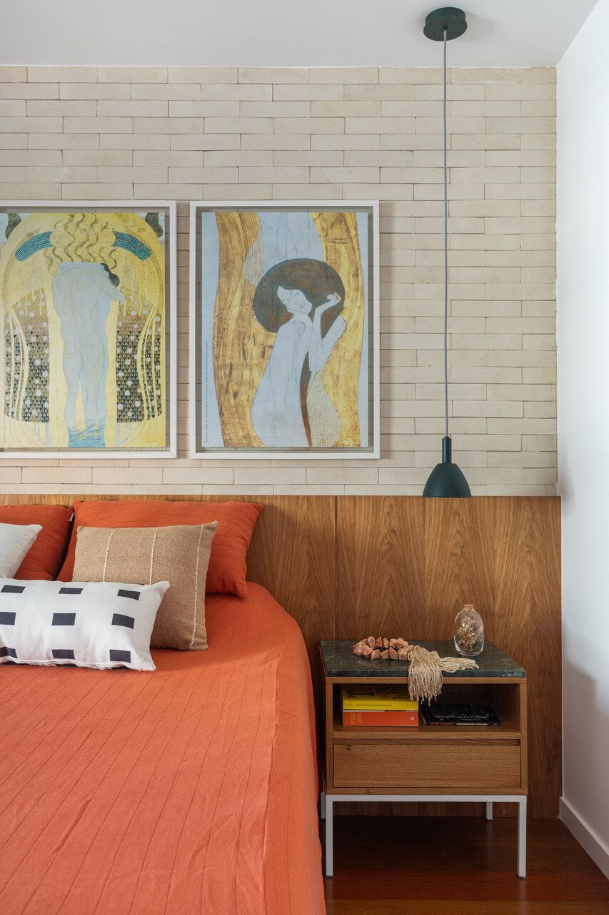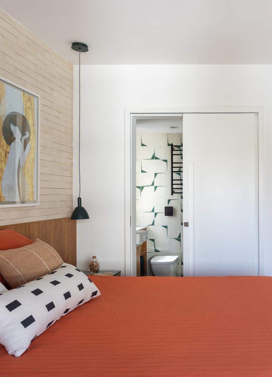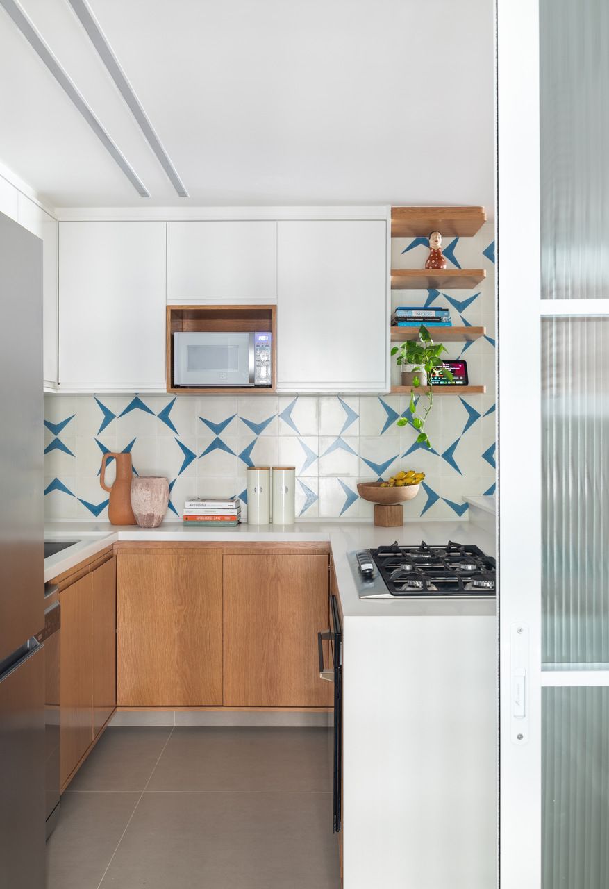 Revestimos a parede atrás da cama do casal com tijolinho cimentício em tom areia e a parede do escritório com tijolinho em tom terracota. Já na cozinha, como o piso é de porcelanato cinza claro, as bancadas são de quartzo branco, os armários superiores são brancos e os inferiores em carvalho americano, ousamos nas paredes, que ganharam ladrilhos hidráulicos com estampa off white e azul, sem que o resultado final pesasse visualmente.