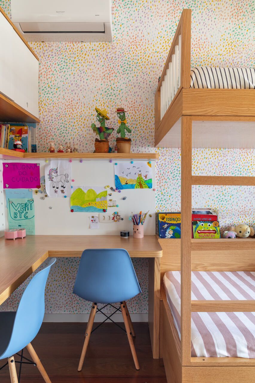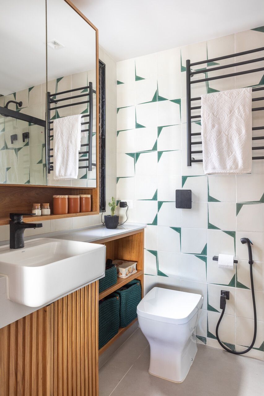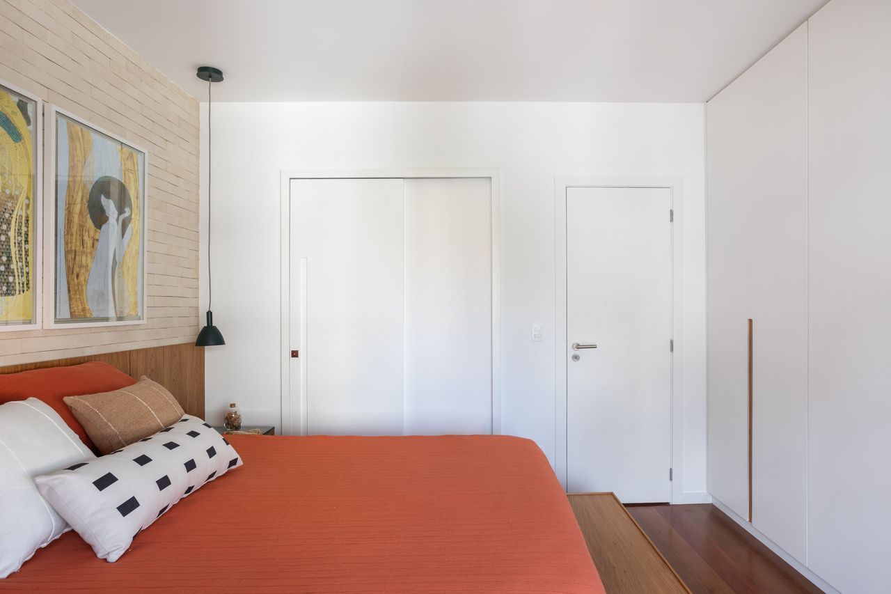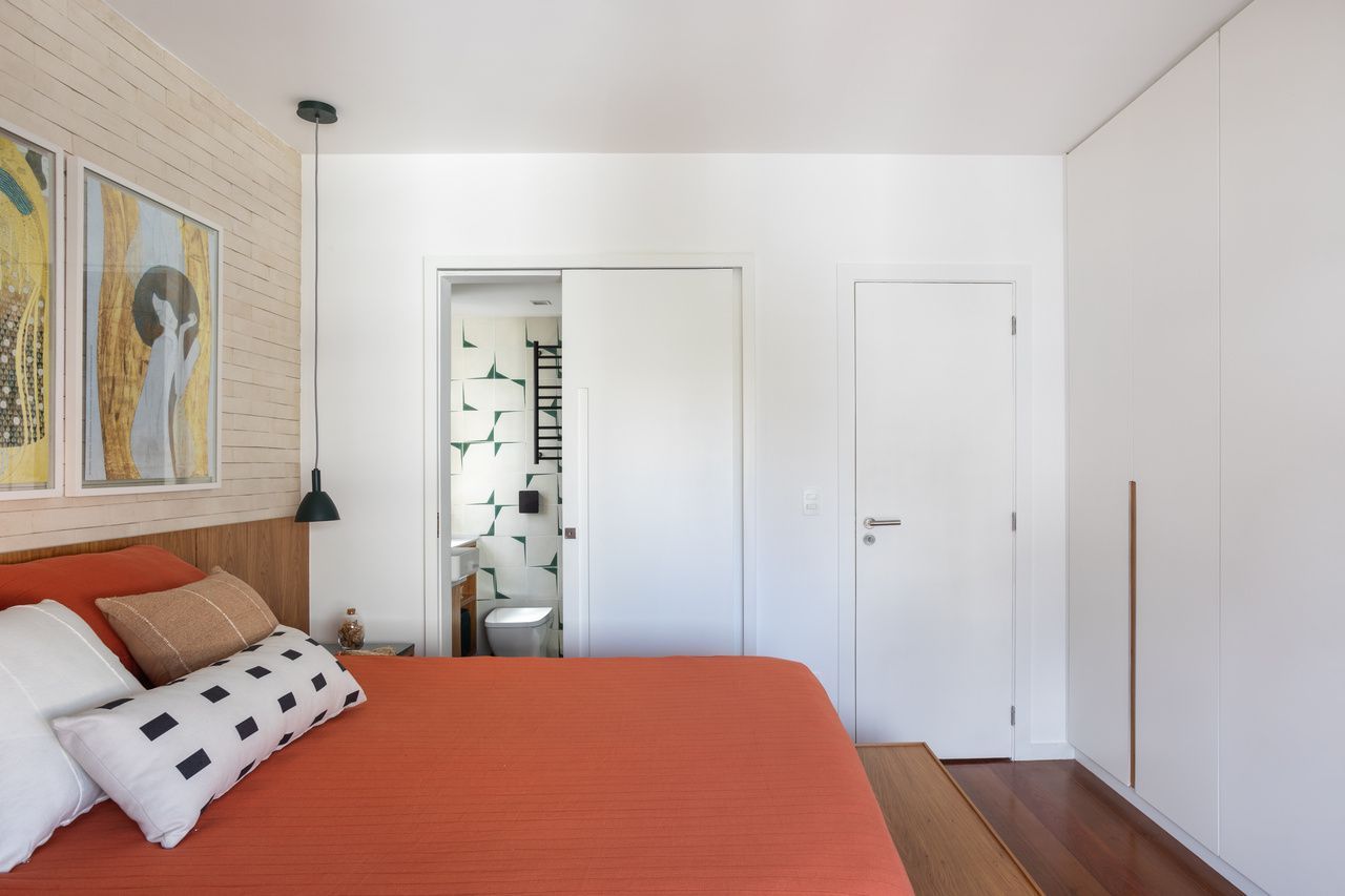 Revestimos a parede atrás da cama do casal com tijolinho cimentício em tom areia e a parede do escritório com tijolinho em tom terracota. Já na cozinha, como o piso é de porcelanato cinza claro, as bancadas são de quartzo branco, os armários superiores são brancos e os inferiores em carvalho americano, ousamos nas paredes, que ganharam ladrilhos hidráulicos com estampa off white e azul, sem que o resultado final pesasse visualmente.