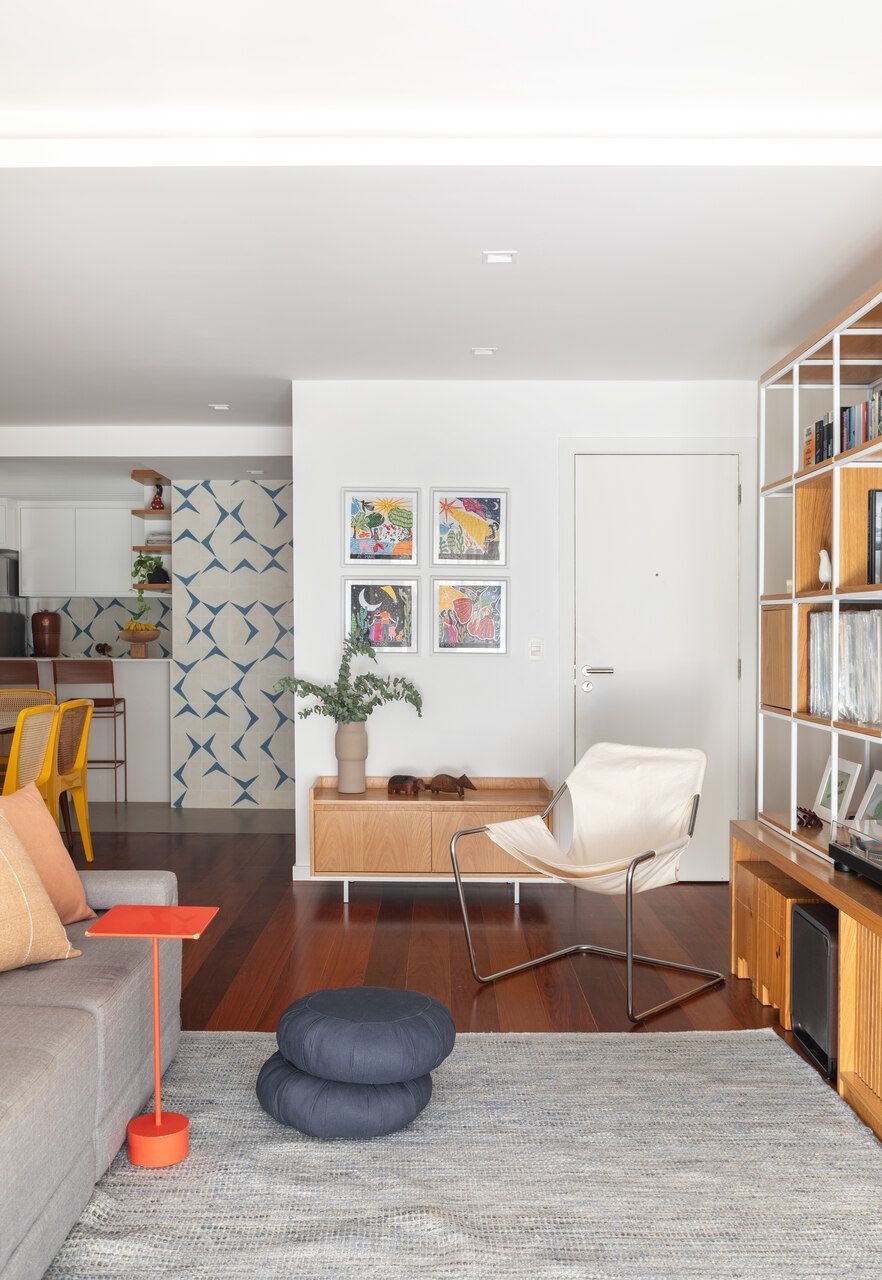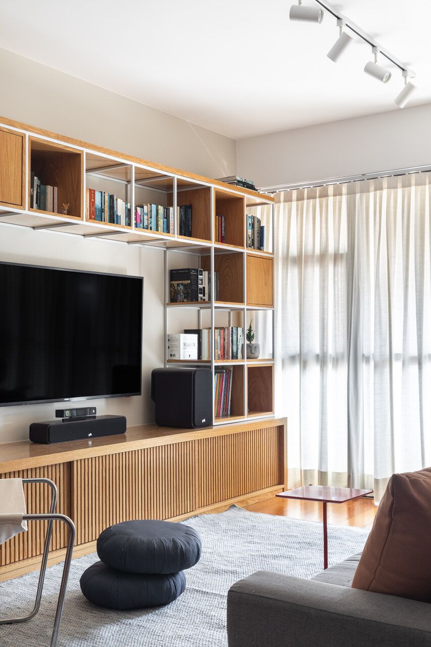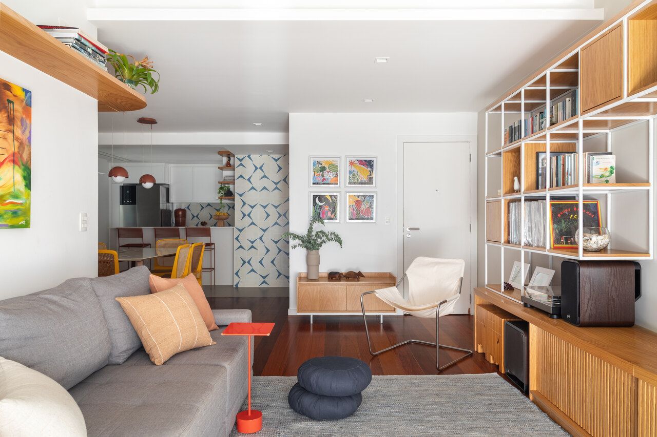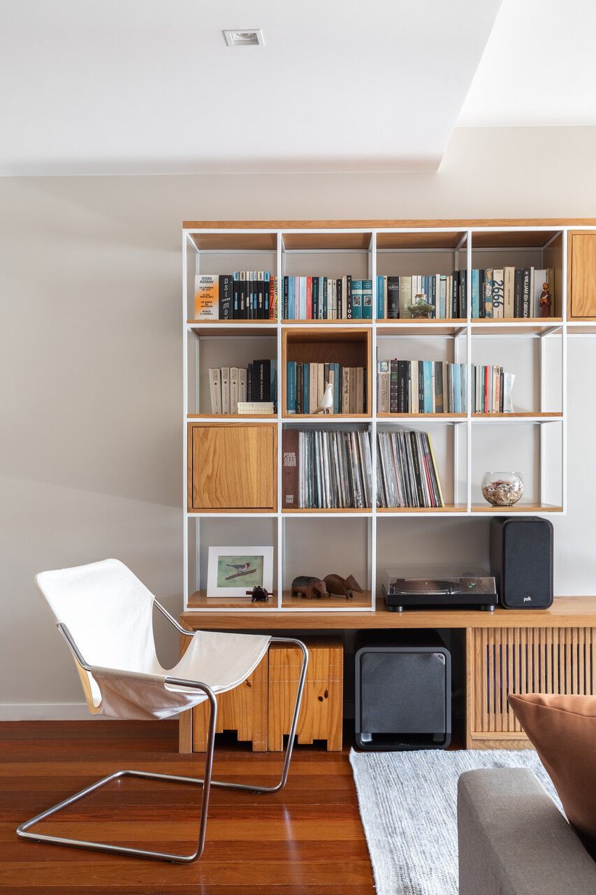 Segundo as arquitetas, no geral, os novos proprietários queriam um apartamento com a cozinha integrada à sala para aumentar a sensação de amplitude nesses espaços e um cômodo com função de escritório, já que ambos trabalham em casa em alguns dias da semana. Como eles tinham muitos livros e discos de vinil, pediram também uma estante grande na sala para armazenar e organizar todo o acervo, além de um espaço de destaque para expor seus violões.