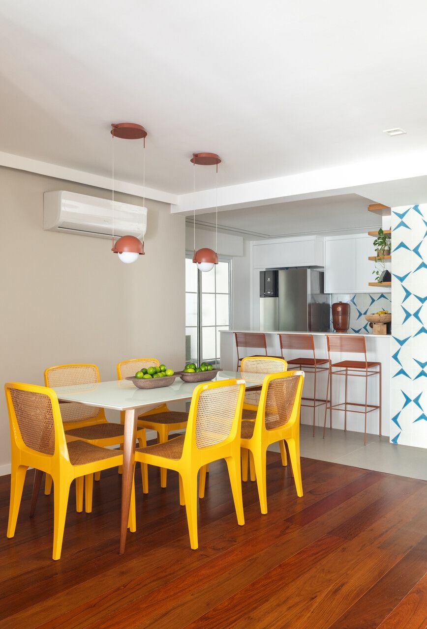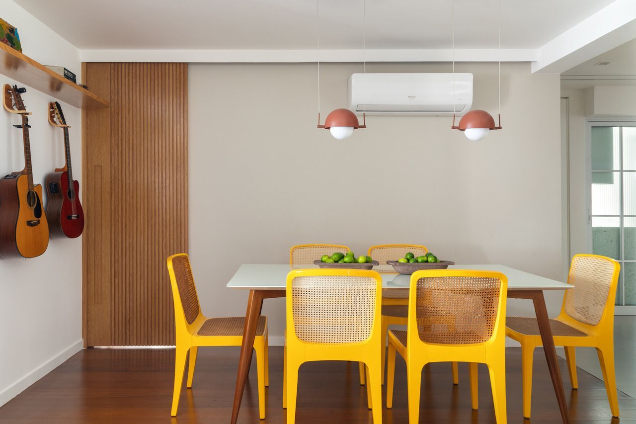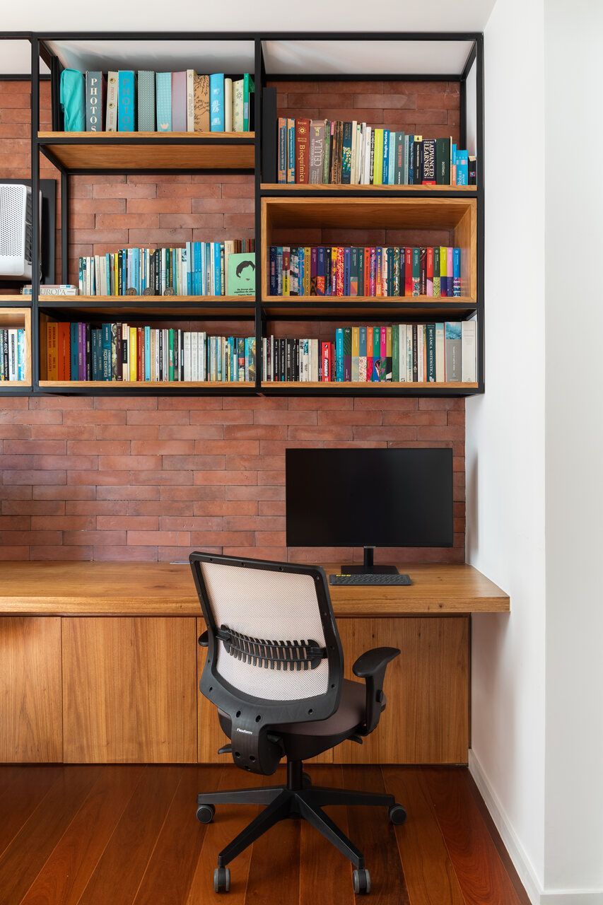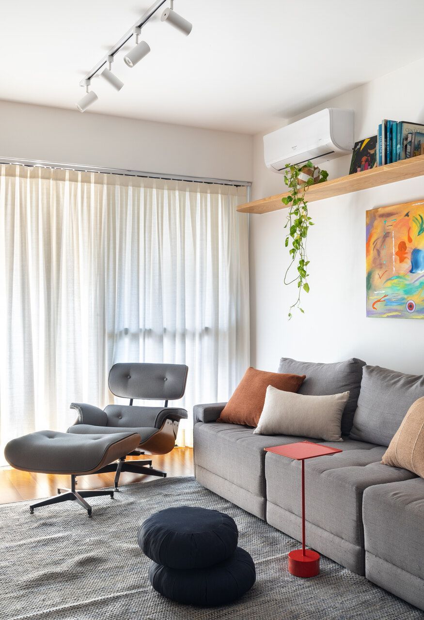 Segundo as arquitetas, no geral, os novos proprietários queriam um apartamento com a cozinha integrada à sala para aumentar a sensação de amplitude nesses espaços e um cômodo com função de escritório, já que ambos trabalham em casa em alguns dias da semana. Como eles tinham muitos livros e discos de vinil, pediram também uma estante grande na sala para armazenar e organizar todo o acervo, além de um espaço de destaque para expor seus violões.