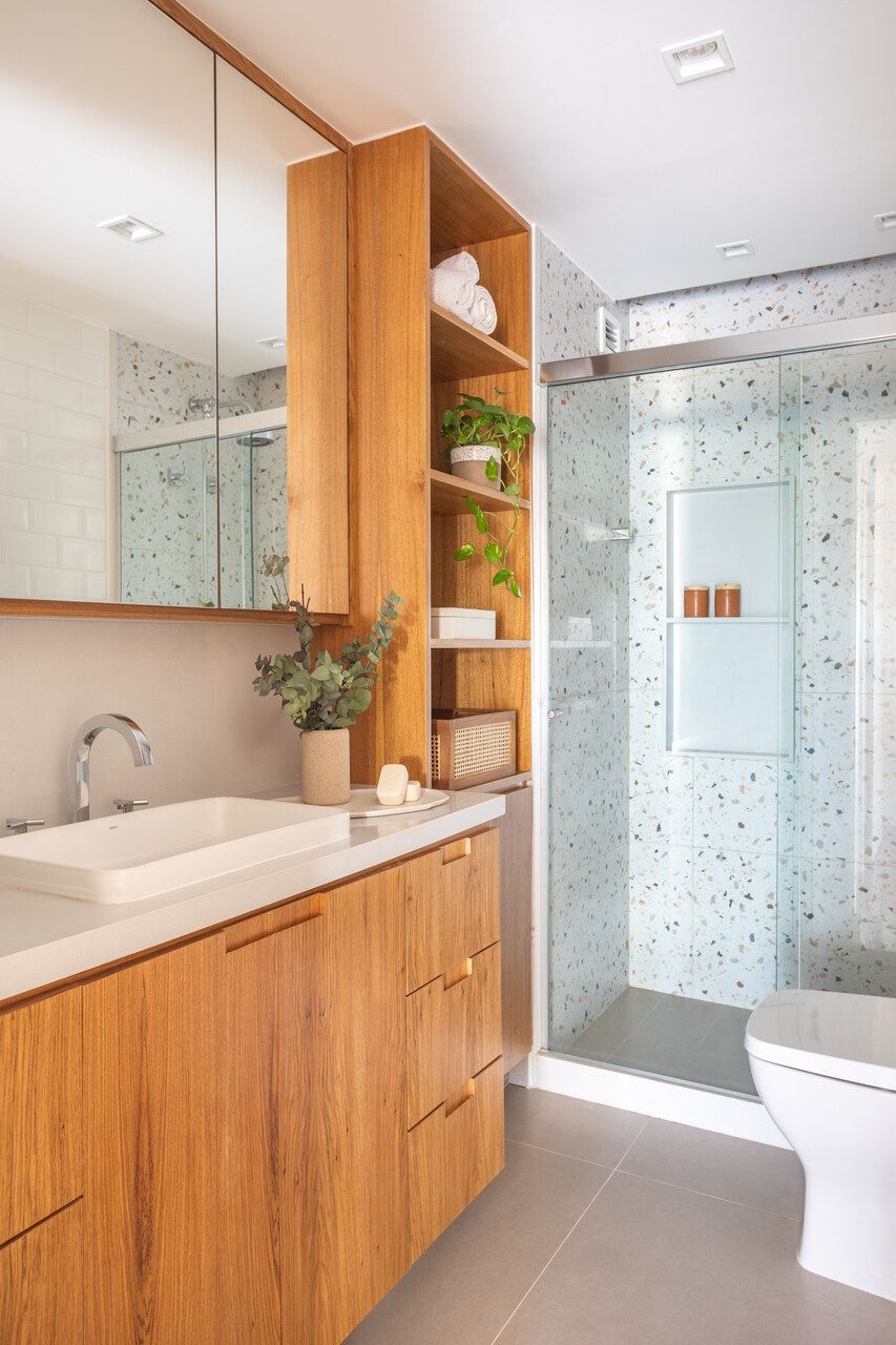 Entre as principais modificações na planta do imóvel, a parede que separava a cozinha da sala foi eliminada para integrar os espaços e, como consequência, a porta de serviço do apartamento perdeu a função e foi fechada. Além disso, o layout do banheiro da suíte foi reformulado com a troca da posição da porta.