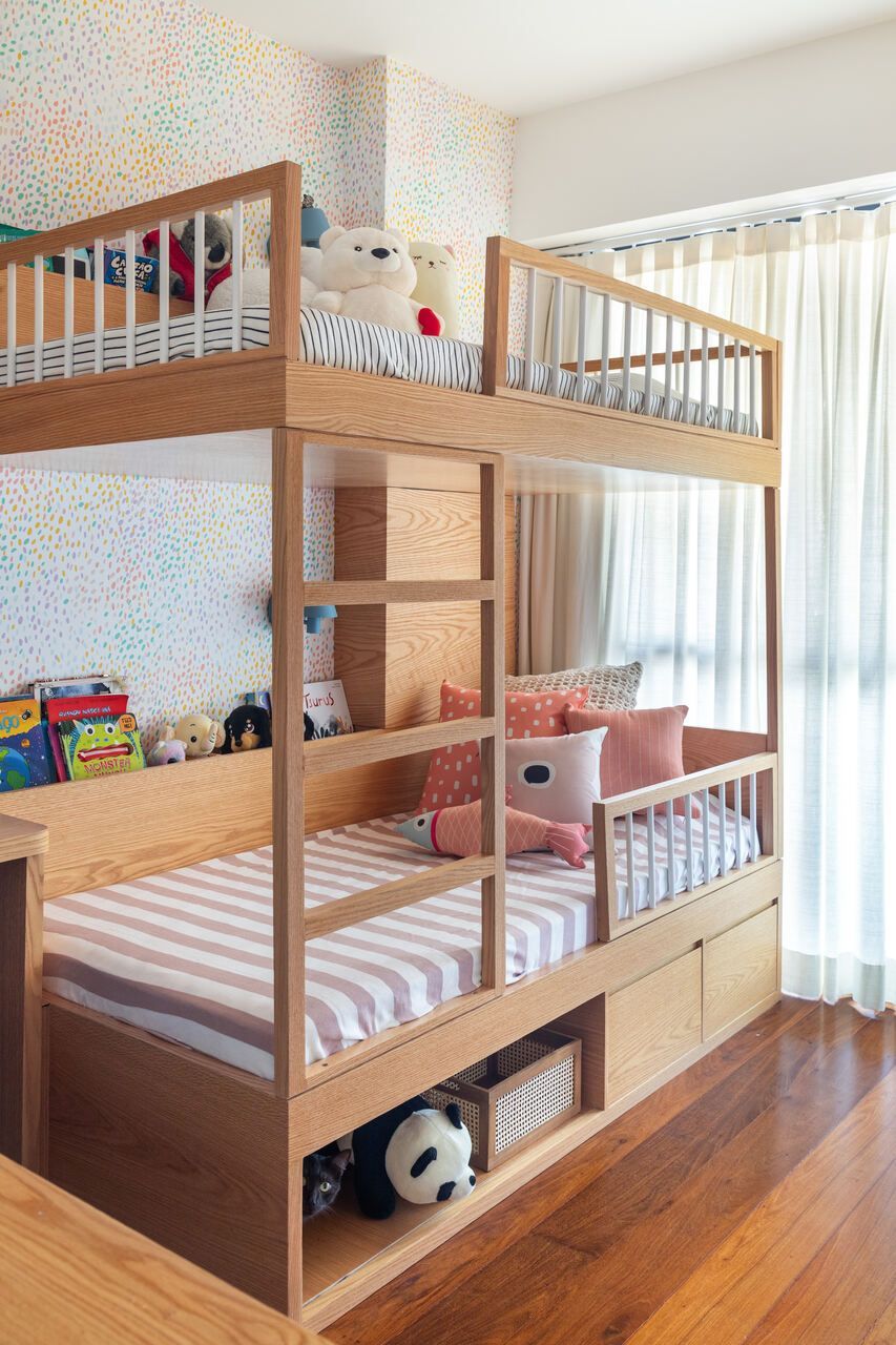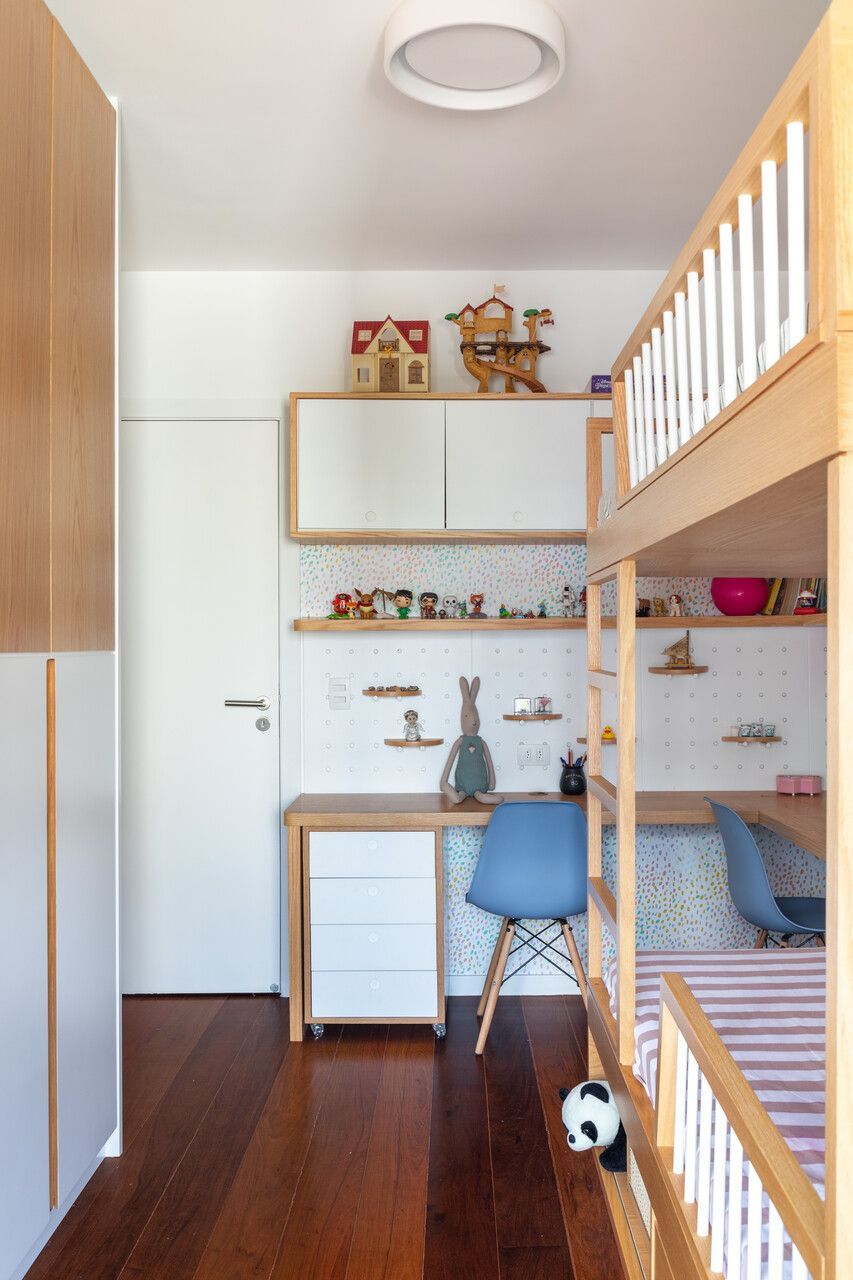 Com exceção do piso original em tábua corrida de madeira, que foi restaurado e mantido, trocamos todos os revestimentos da cozinha e dos banheiros, repintamos paredes e tetos e desenhamos marcenarias para cada ambiente.