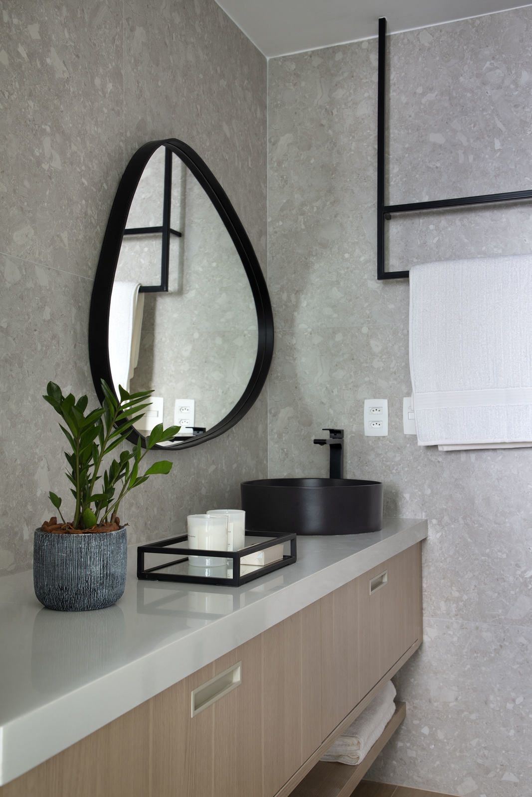 “Uma grande mudança foi a abertura total da sala para a varanda para integrar os ambientes de estar e jantar e o novo espaço gourmet. Sem dúvida, esta solução trouxe mais conforto, amplitude e luz natural para todos os espaços. Além disso, pensando na funcionalidade e na iluminação, demolimos o quarto de serviço, que não era necessário para os clientes, para melhor integrar a sala e a cozinha. E também removemos o lavabo da planta original para ampliar o espaço da sala, já que as visitas podem usar o banheiro social do apartamento.”