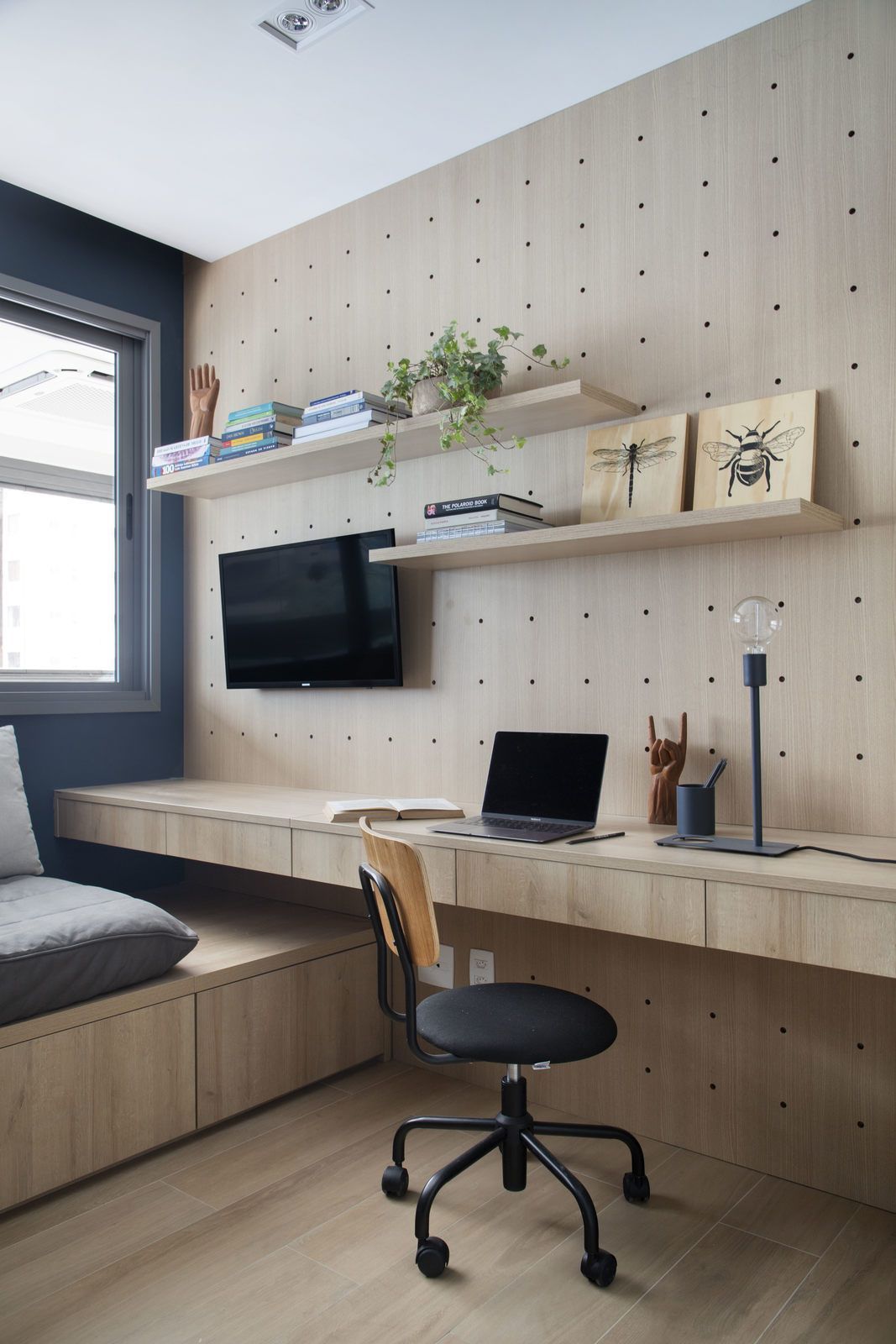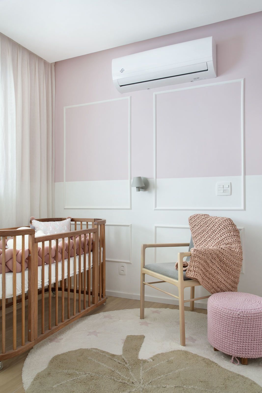 “A planta original do apartamento tinha quatro quartos. Por conta disso, optamos por anexar o quarto vizinho à suíte do casal com o objetivo de criar um closet e aumentar a área da suíte como um todo. Na suíte do casal, o painel de marcenaria ripada com design curvo e acabamento em laca branca é o ponto focal do ambiente. Além de mimetizar a porta de acesso ao banheiro, este recurso deixou o espaço mais homogêneo, fluido, minimalista, leve e sofisticado. Já no quarto do filho mais velho, vale destacar o desenho personalizado de astronauta aplicado sobre o painel escuro e o painel perfurado atrás da bancada de estudos. Por fim, no quarto da bebê o destaque fica por conta da parede bicolor com molduras que simulam boiseries e deixaram o ambiente divertido e elegante ao mesmo tempo.”