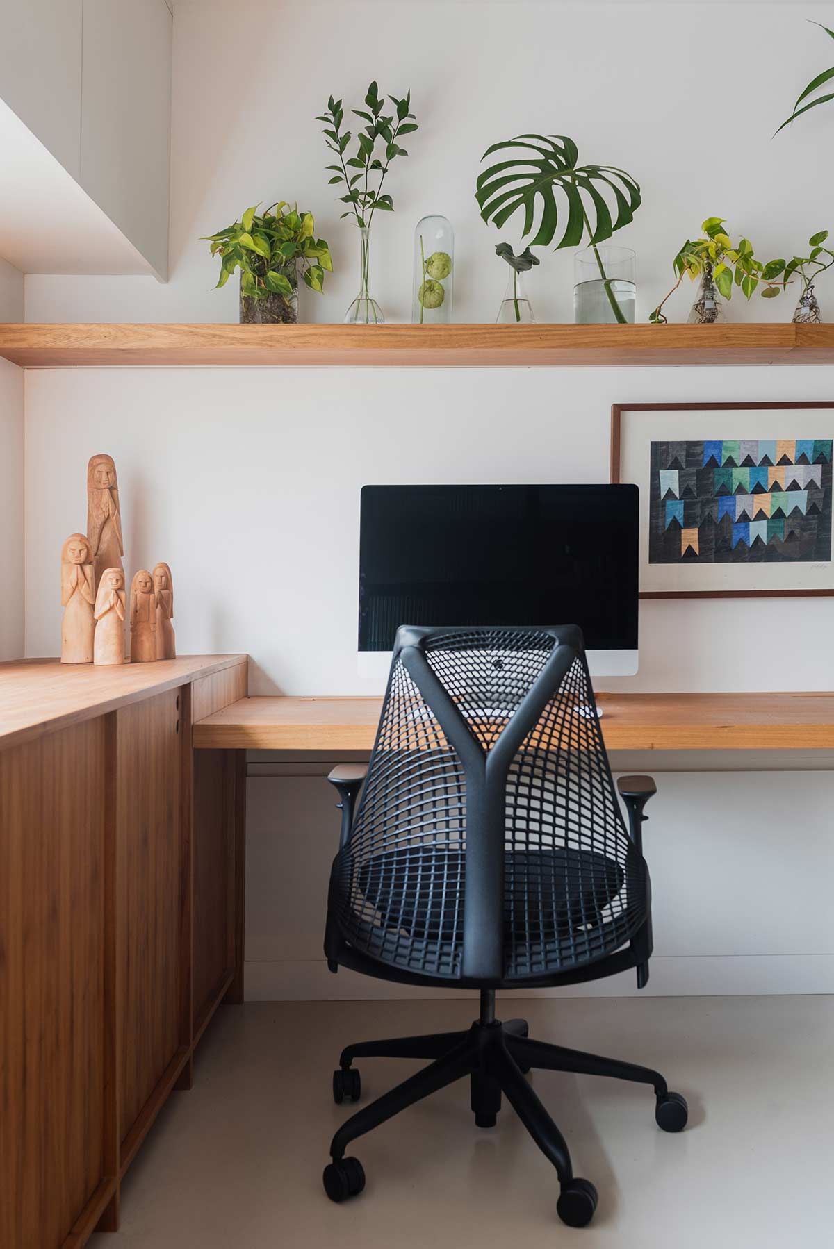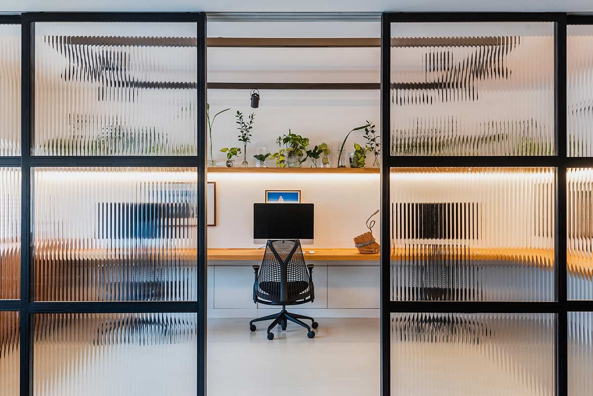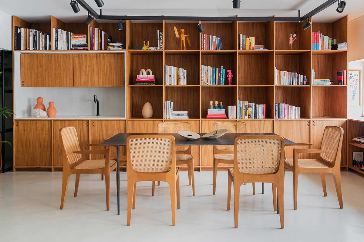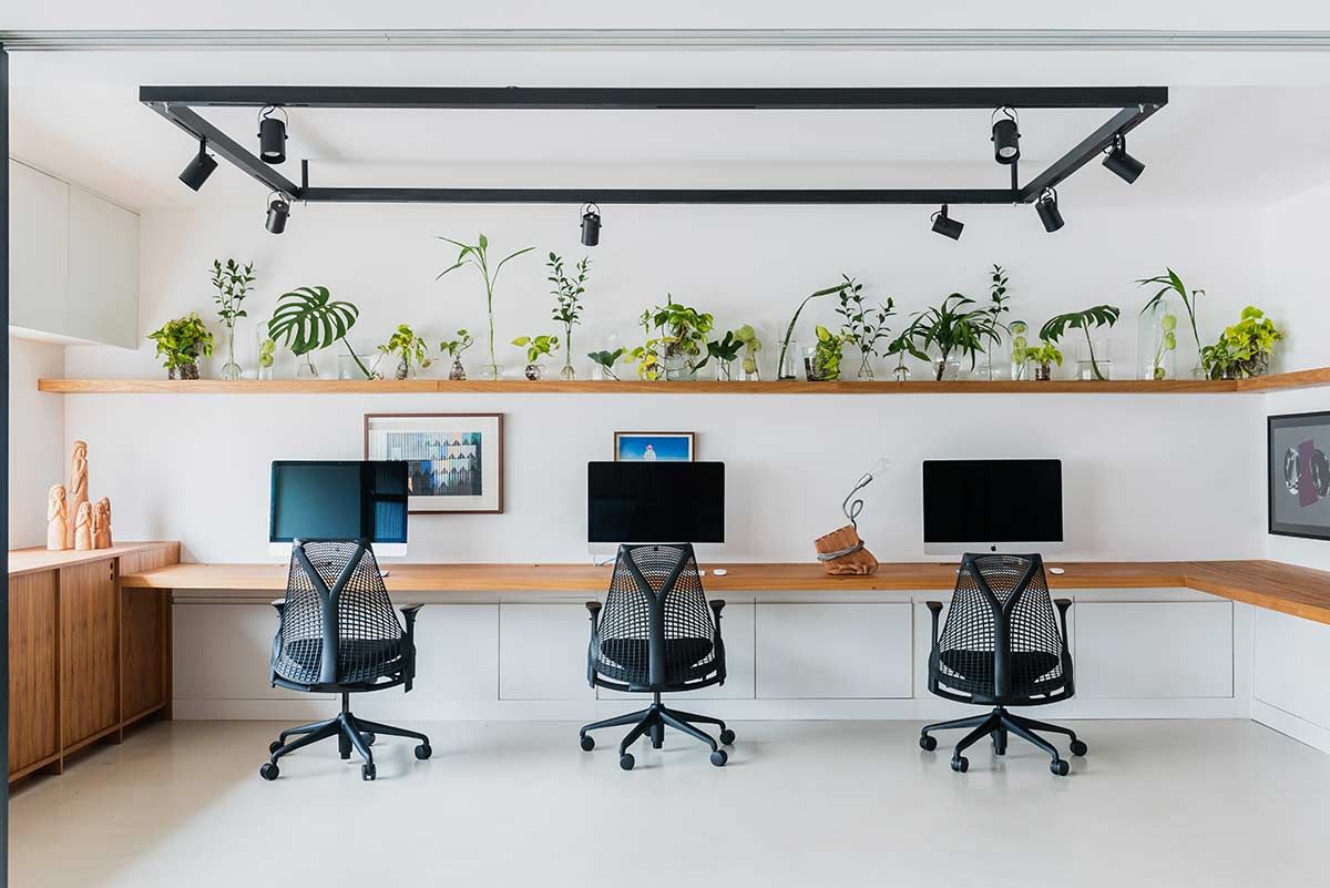A madeira natural freijó aparece em momentos importantes, como na estante com uma mini copa que ocupa toda a extensão da sala de reunião. No ambiente de trabalho, as cadeiras ergométricas e as plantas inspiram a criação, e as divisórias em ferro e vidro canelado permitem a entrada de luz e união com os outros espaços, mesmo quando fechadas.