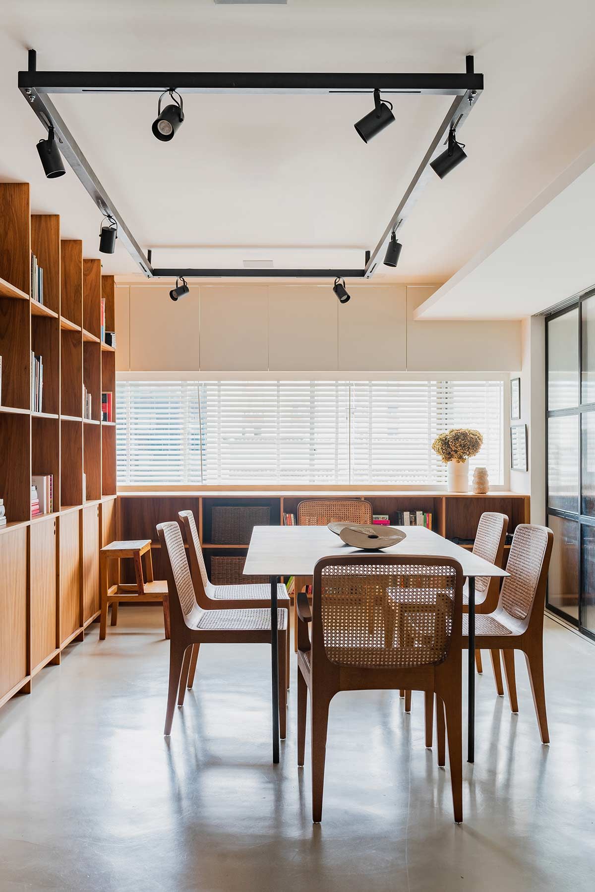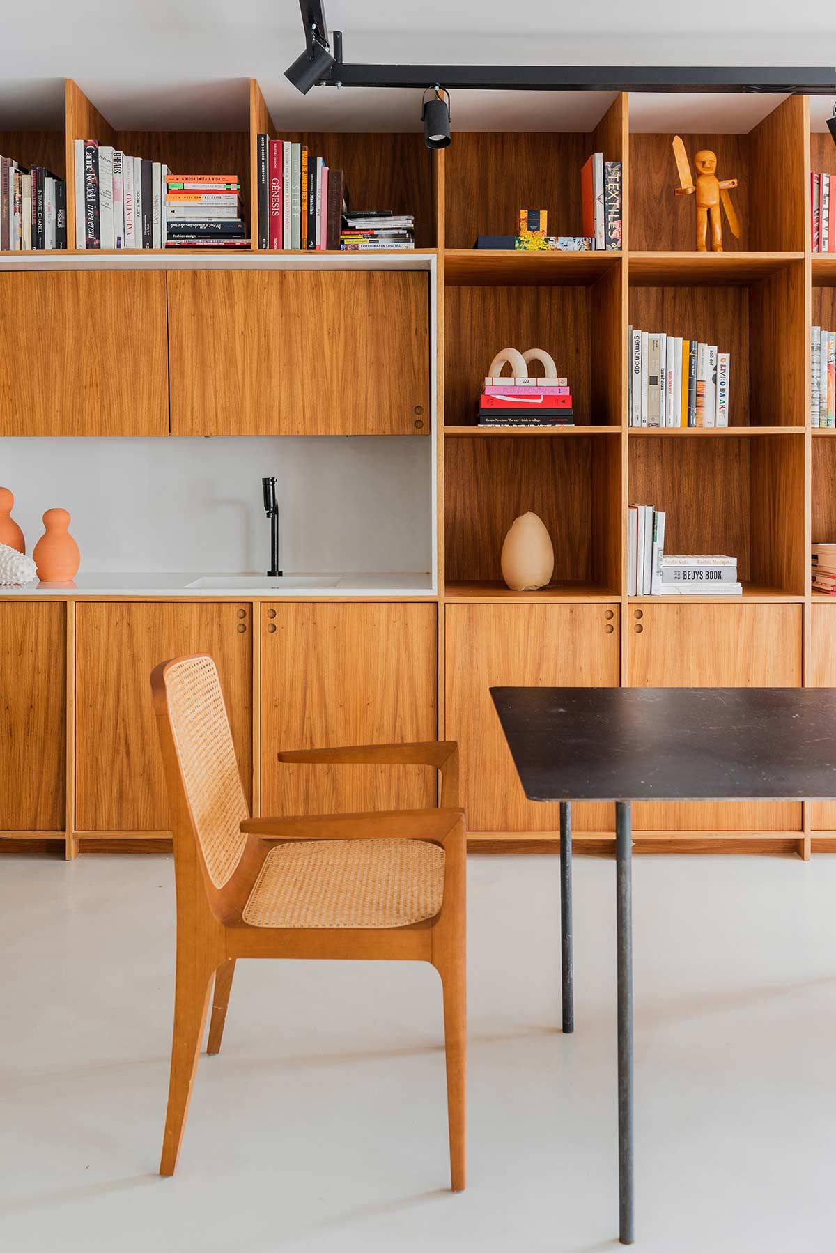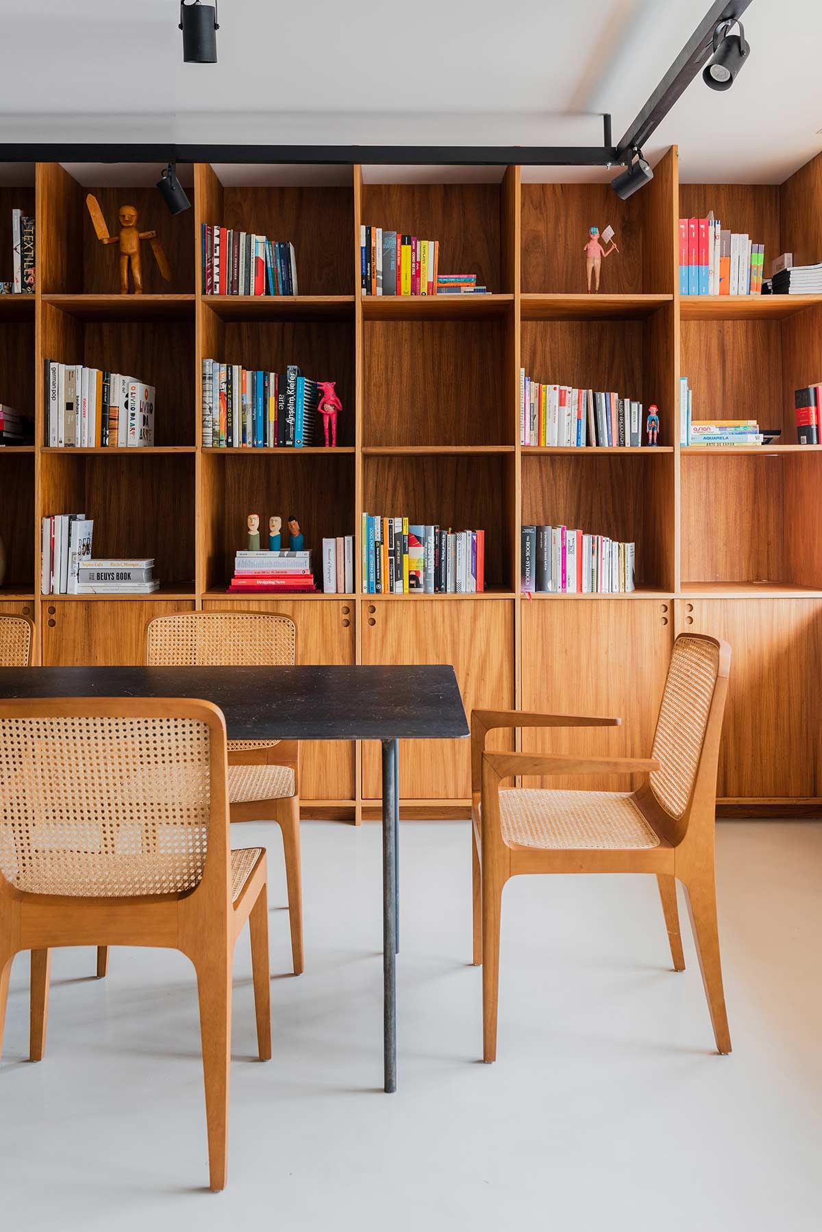 A madeira natural freijó aparece em momentos importantes, como na estante com uma mini copa que ocupa toda a extensão da sala de reunião. No ambiente de trabalho, as cadeiras ergométricas e as plantas inspiram a criação, e as divisórias em ferro e vidro canelado permitem a entrada de luz e união com os outros espaços, mesmo quando fechadas.