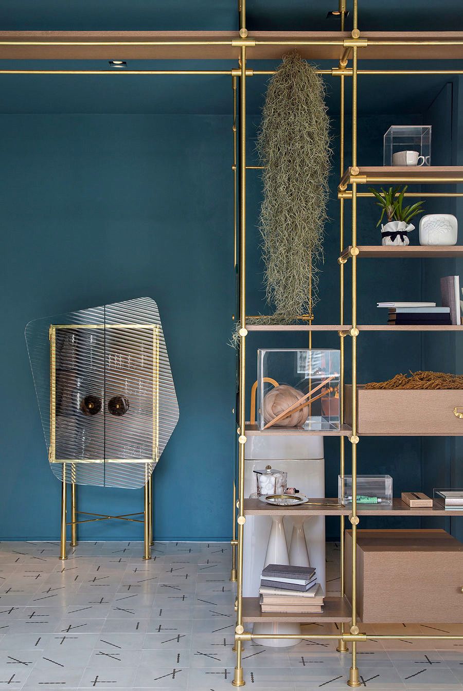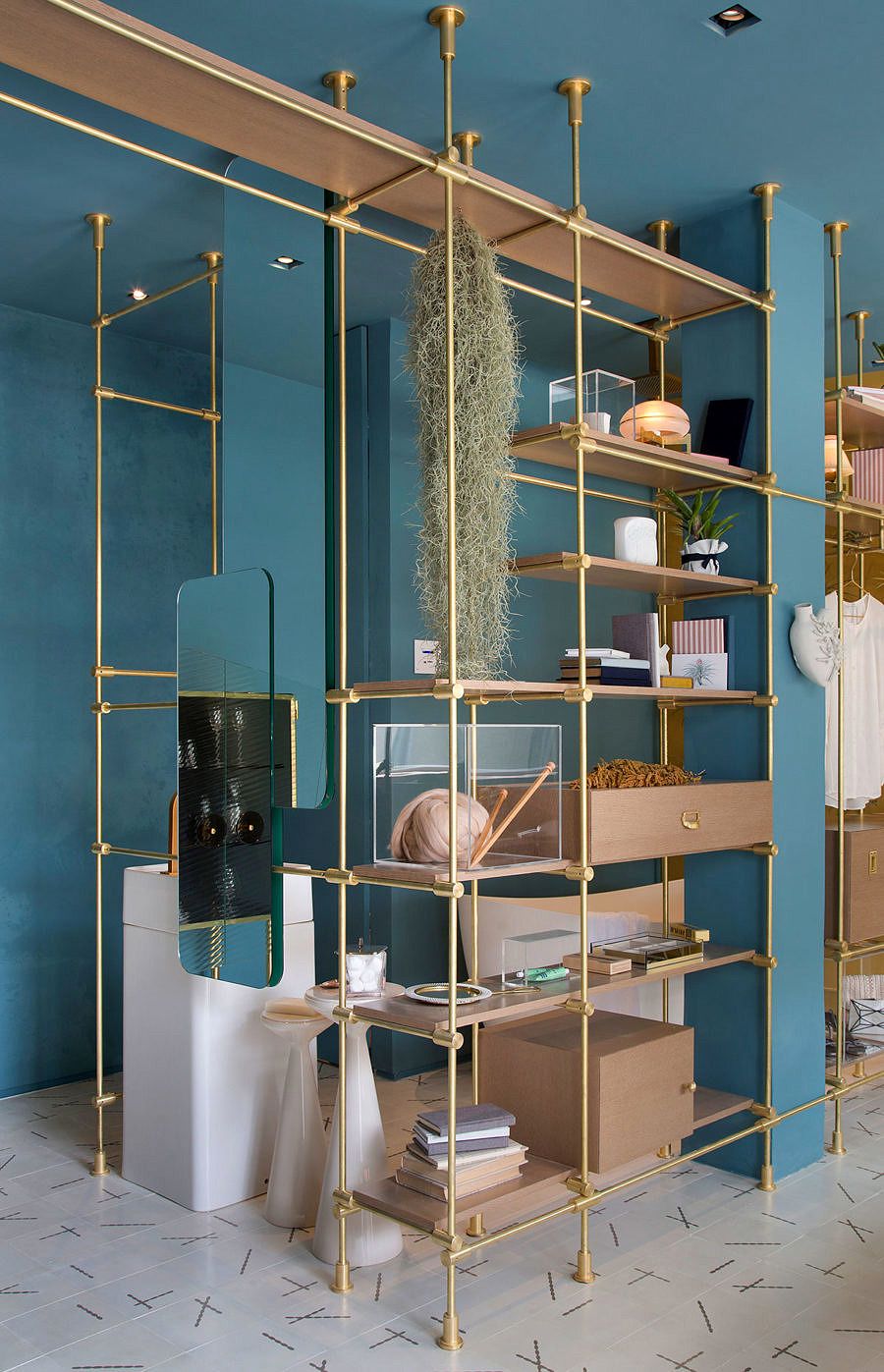 O ambiente é mais sentimental, com elementos que refletem momentos da vida da moradora. A trama inspira e compõe todo o projeto e pode ser vista facilmente em todo o local: no ladrilho hidráulico, desenhado pela própria designer e que traz o desenho de uma costura; na estante, também assinada por Melina, que abraça todo o ambiente, tornando-se uma das peças-chaves da decoração e até nas caixas de acrílico, que conta toda a trajetória da moradora por meio dos seus objetos pessoais, como uma xícara antiga, um novelo, fotos, sapatos, bolsas, entre outros itens.