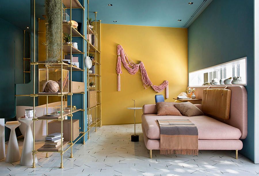 O ambiente assinado pela designer Melina Romano para a CASACOR São Paulo é um loft completo, com cozinha, banheiro, quarto e sala. É ao mesmo tempo, funcional e integrado, com um sofá desenhado pela designer que também pode ser utilizado como cama, cadeiras e bancos que caminham livremente no espaço e uma mesa, ao lado da estante, que funciona como uma divisória.