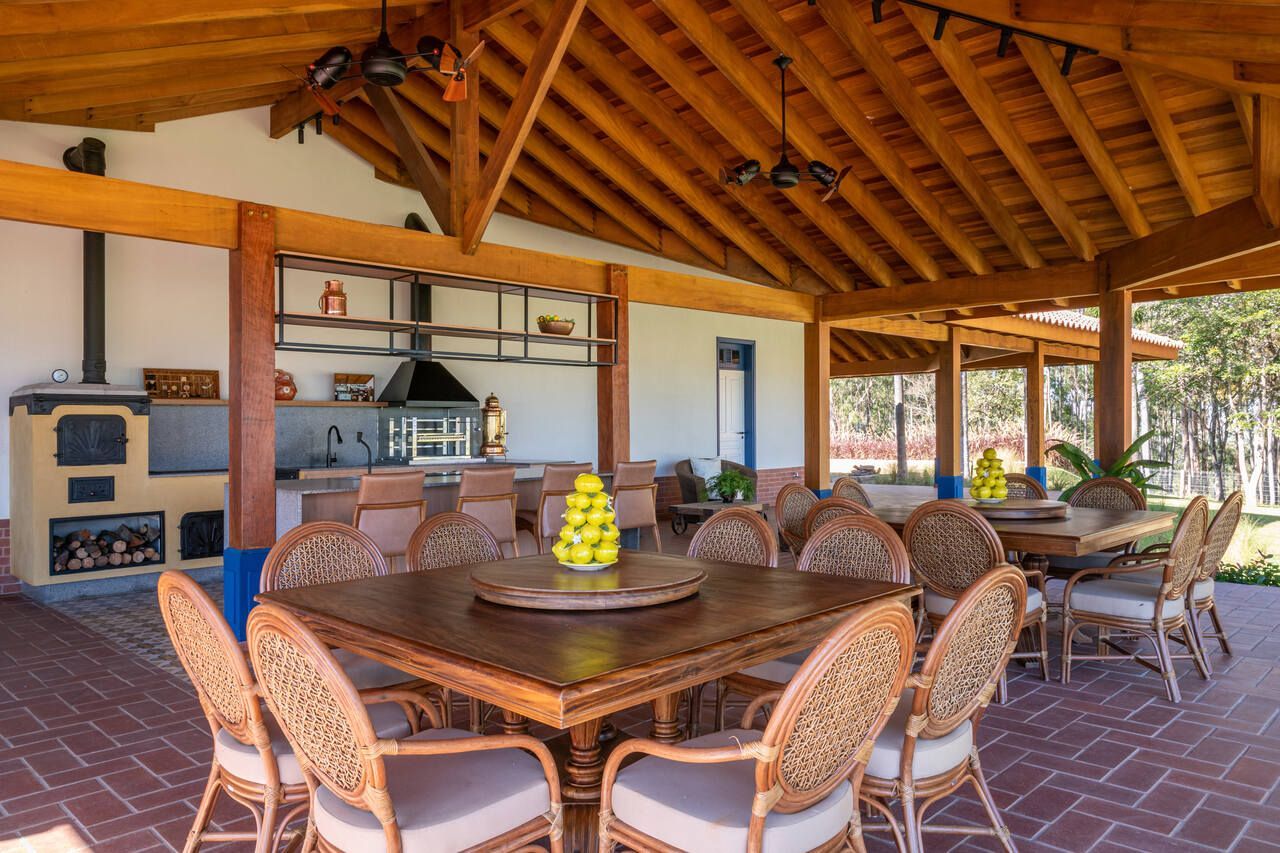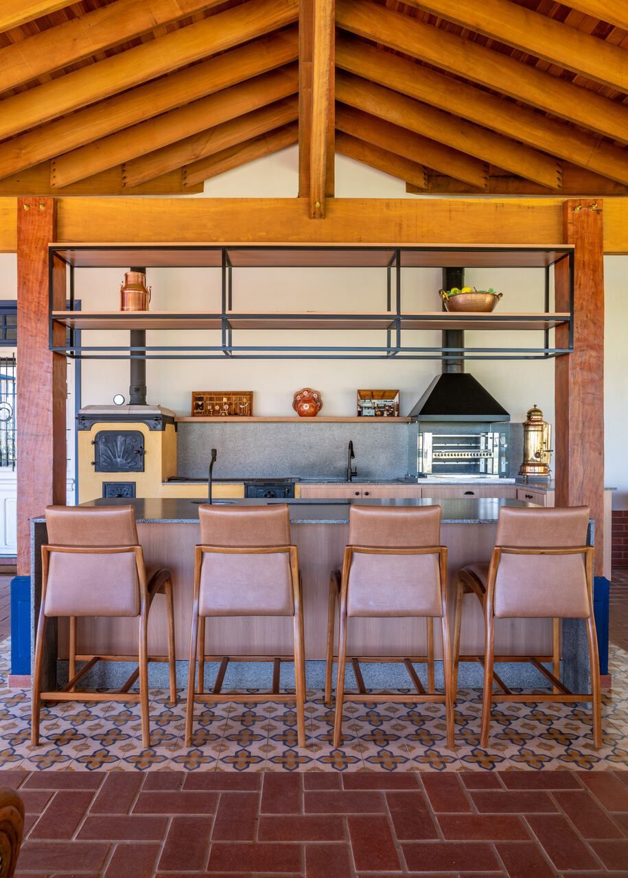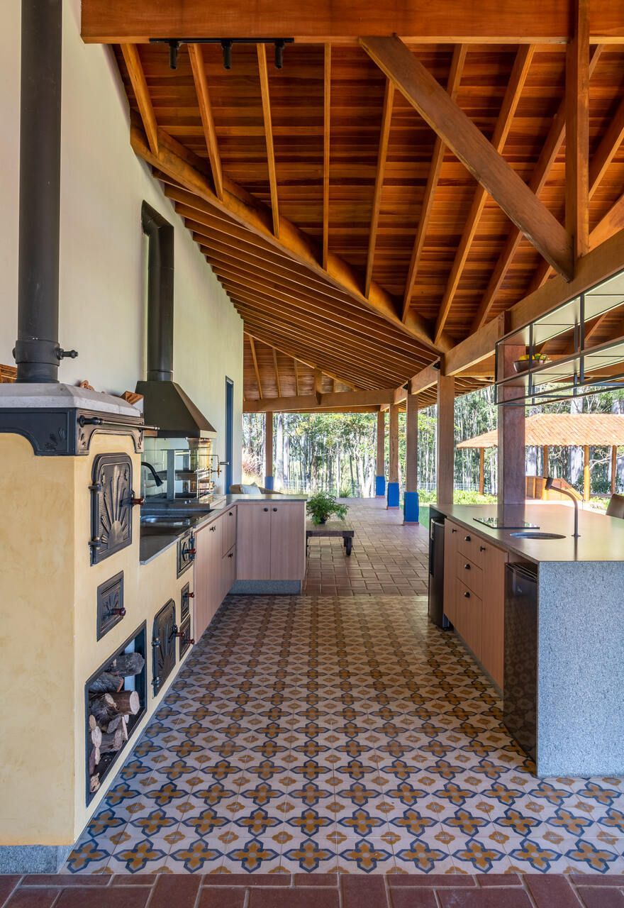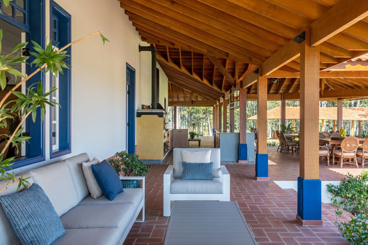 Após uma ampliação passou de 440m² para os atuais 800m² e uma reforma completa, a fazenda ganhou uma nova vida. Detalhes como o assoalho de madeira de demolição nas salas e suítes, tijolo cotto nas varandas e ladrilho hidráulico nas cozinha interna e gourmet externo, adicionaram charme à residência.