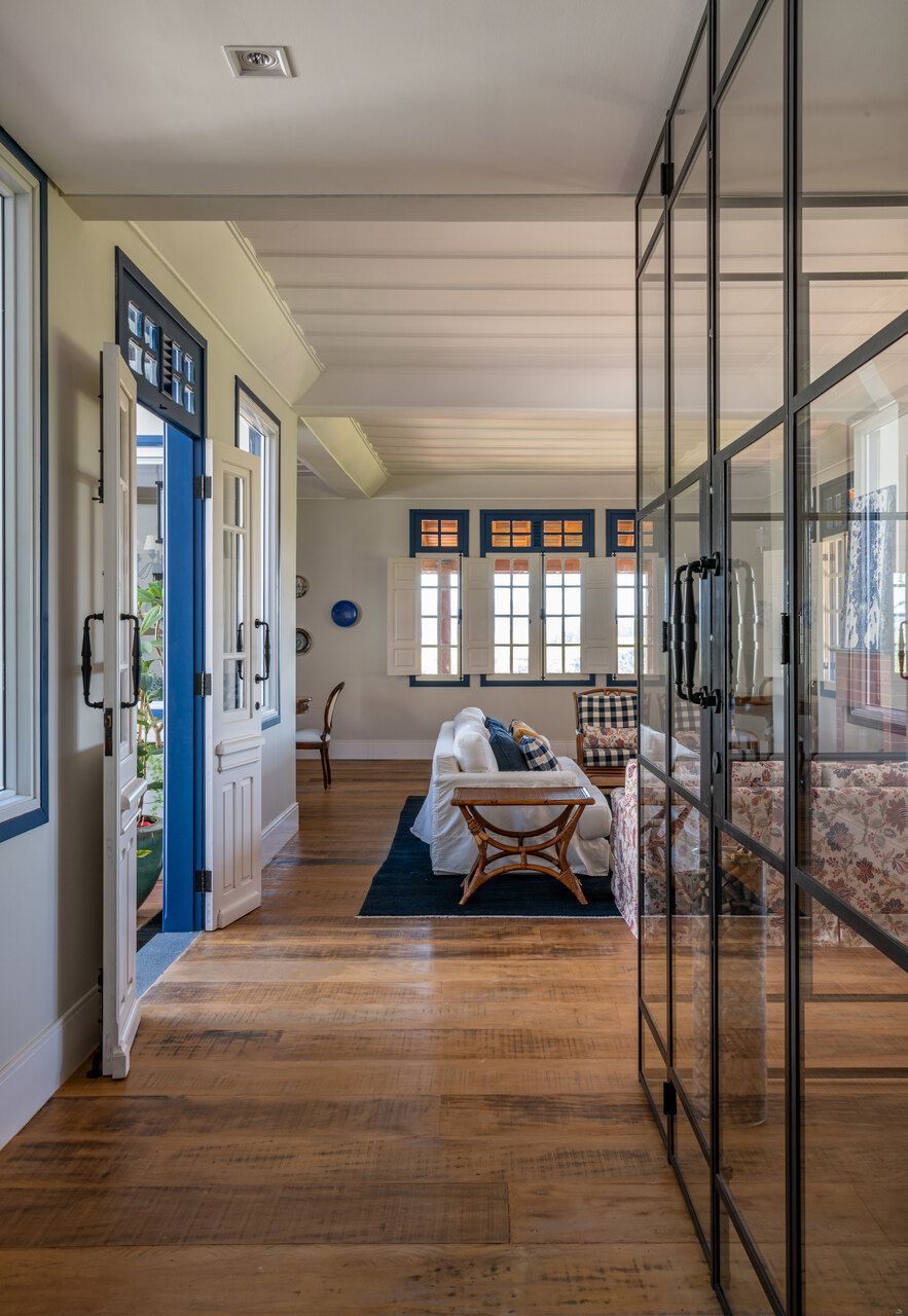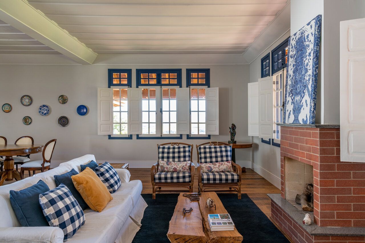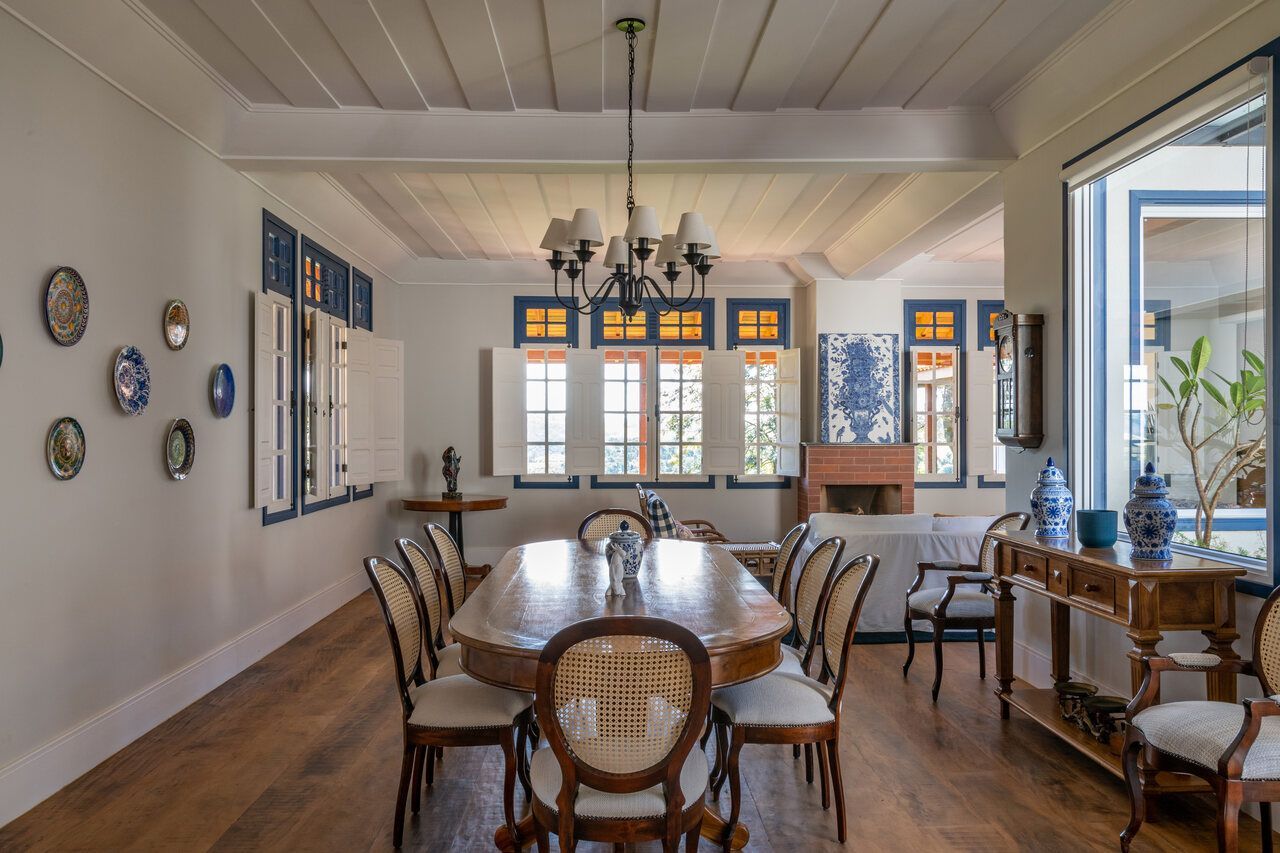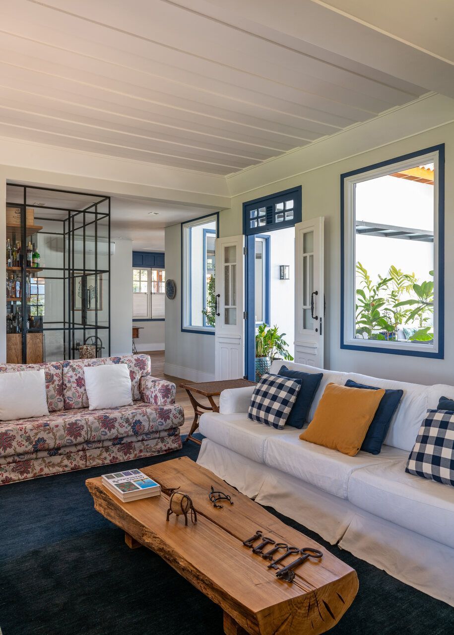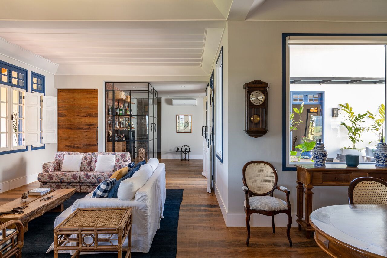 O destaque vai para os apliques de gesso no forro da sala e as portas de correr de madeira de demolição. Com um pátio interno que possibilita o uso em dias mais frios e uma vista para o Paredão, a propriedade se tornou um refúgio acolhedor, após 16 meses de reforma e ampliação.