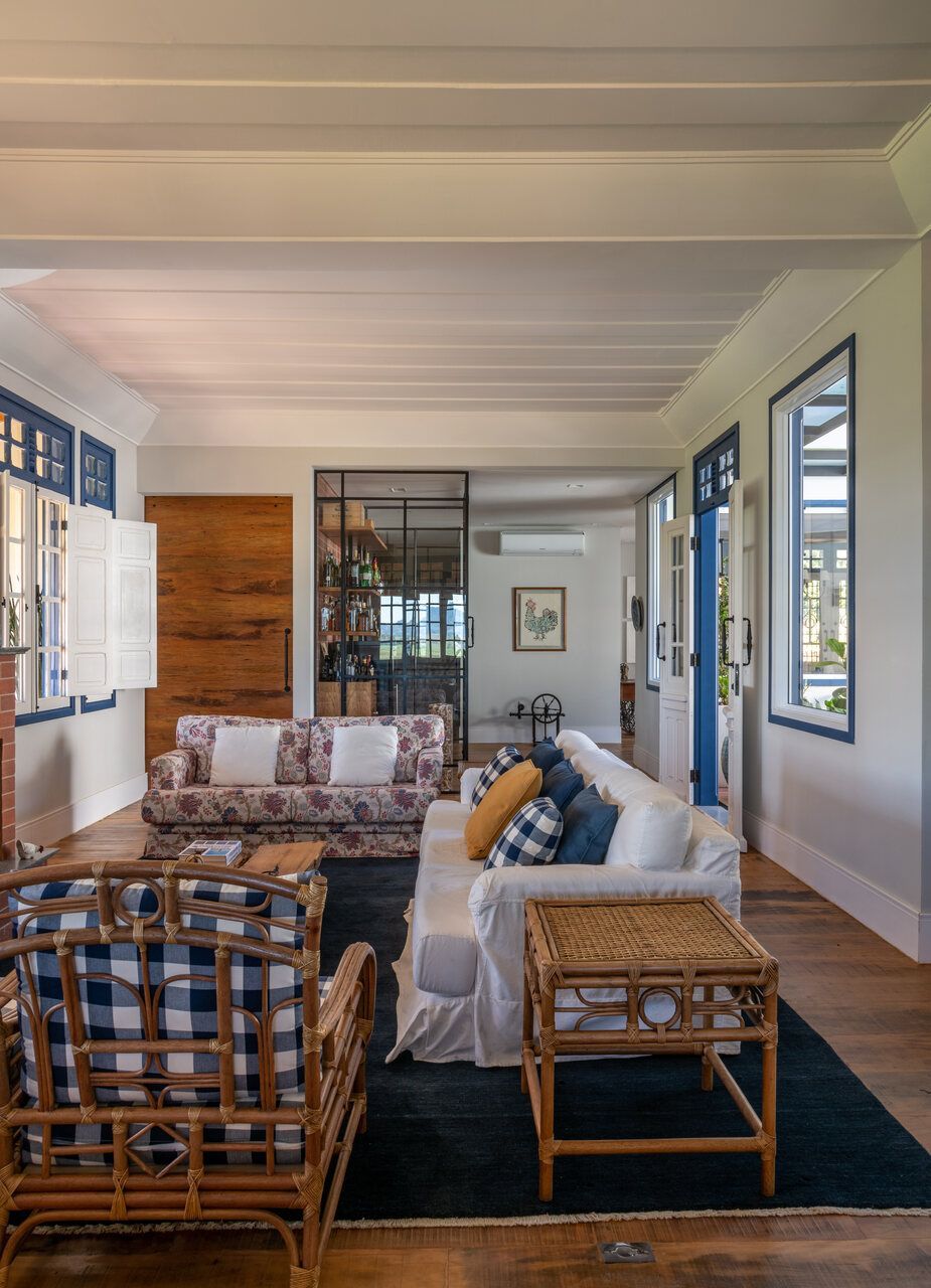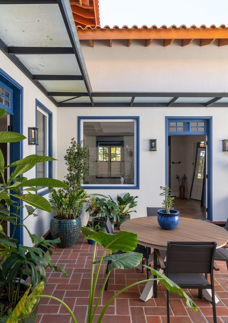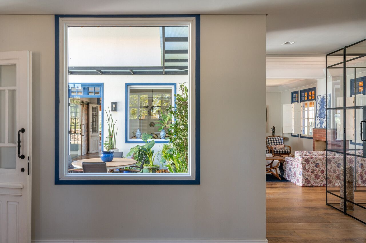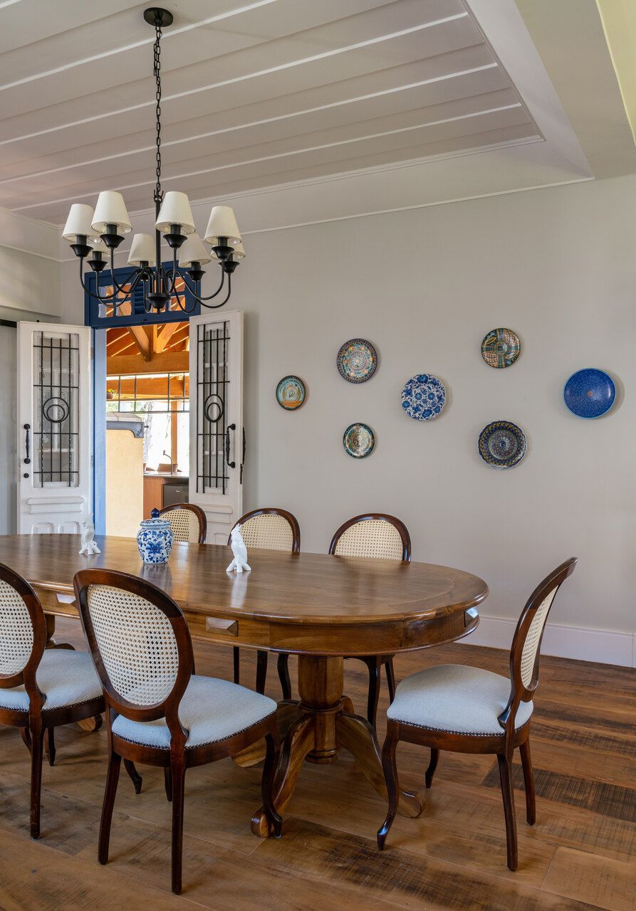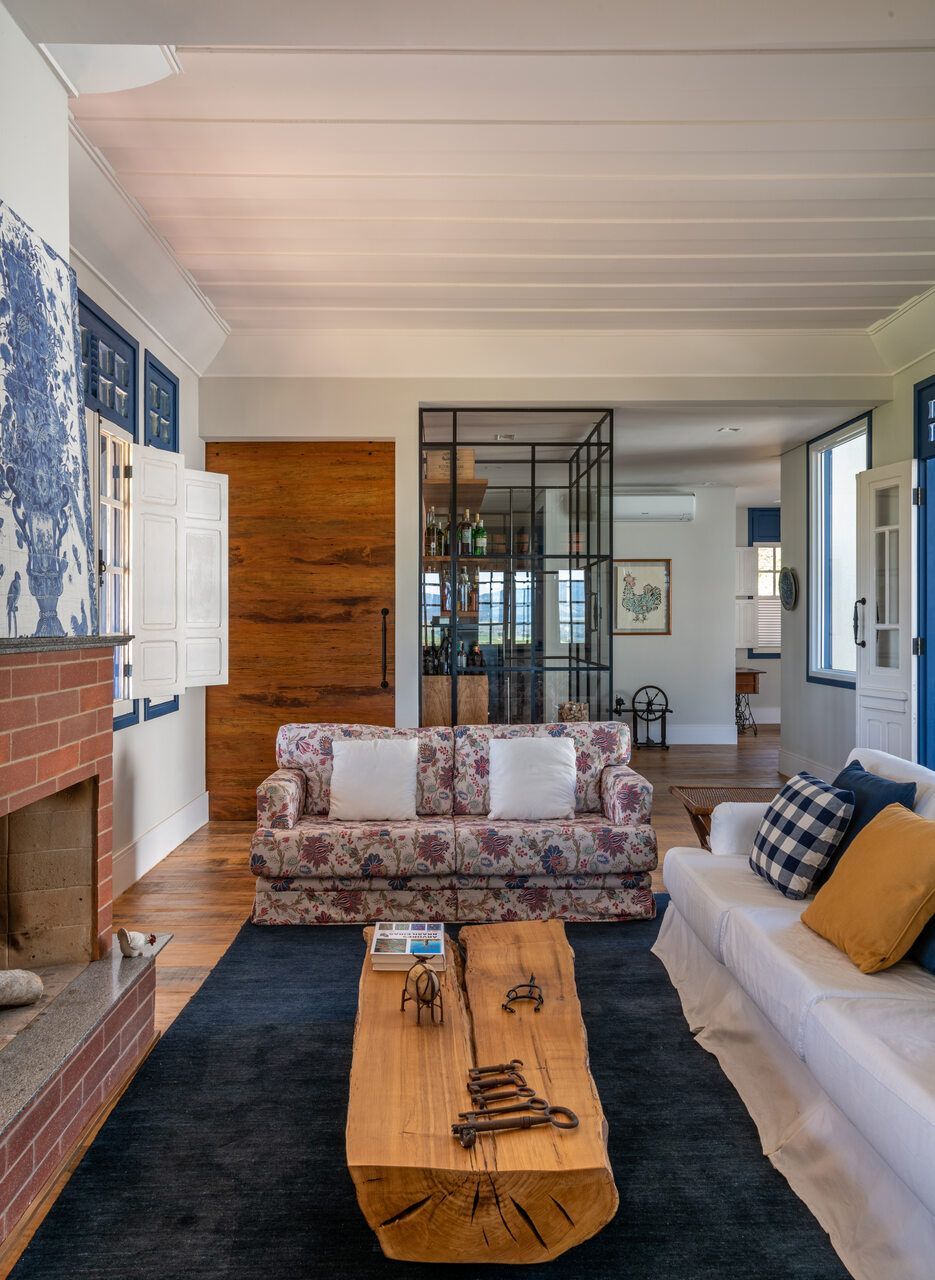 O destaque vai para os apliques de gesso no forro da sala e as portas de correr de madeira de demolição. Com um pátio interno que possibilita o uso em dias mais frios e uma vista para o Paredão, a propriedade se tornou um refúgio acolhedor, após 16 meses de reforma e ampliação.