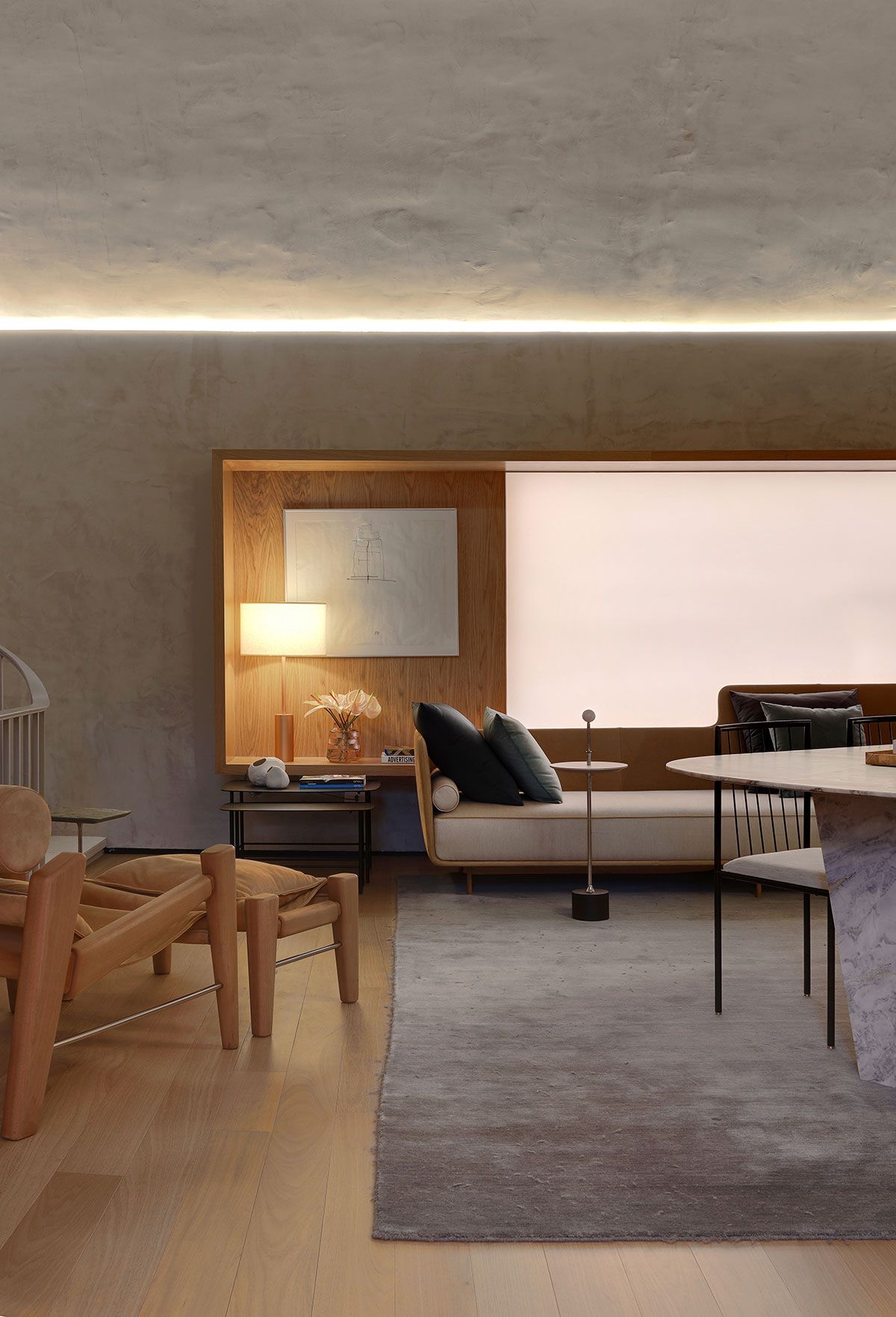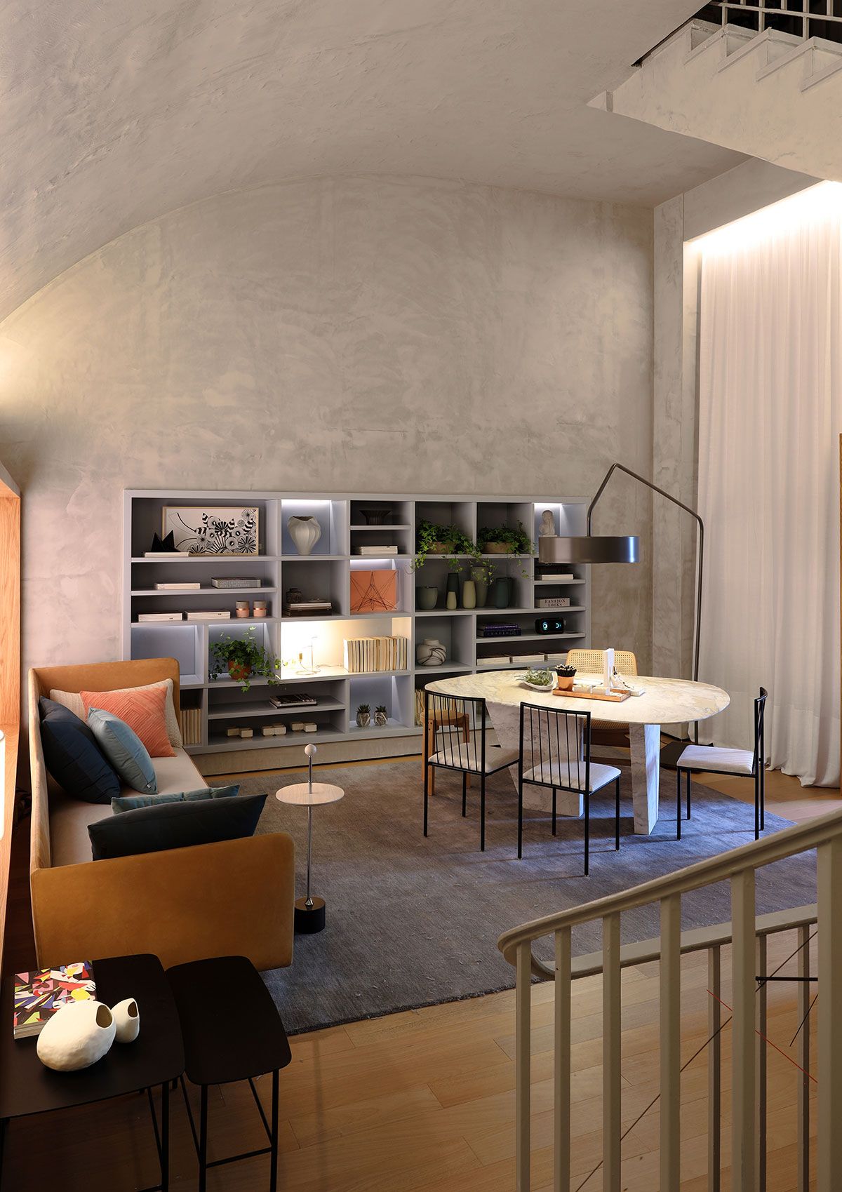 Como ponto de partida, a profissional usou o projeto arquitetônico da estrutura existente no próprio Jockey: o teto curvo original da edificação foi mantido e recebeu textura de cimento queimado remetendo às “cascas” de concreto de Oscar Niemeyer.