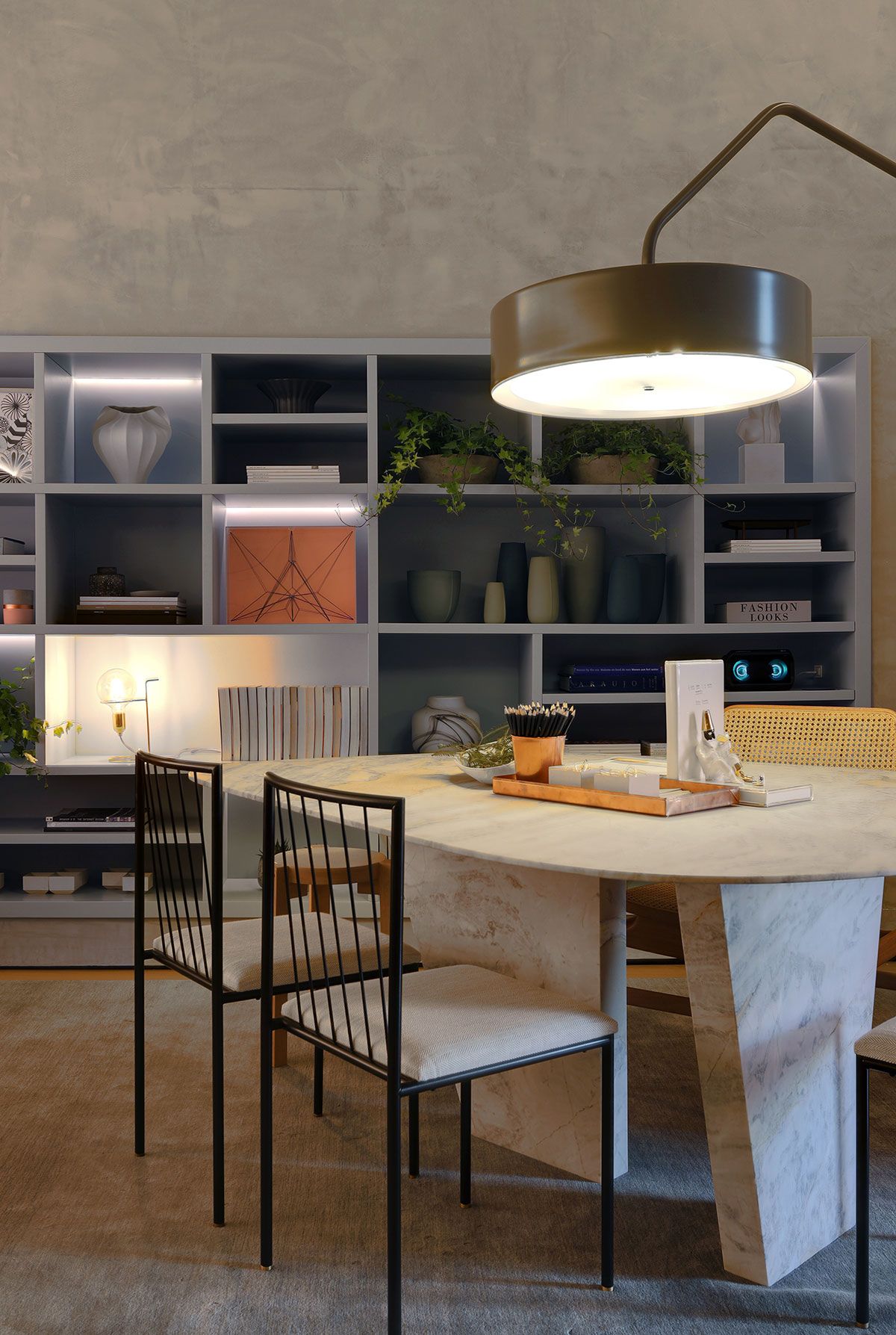 Na decoração do ambiente a mesa projetada pela arquiteta especialmente para a Casacor, sem lados definidos e bordas curvas. As mesas laterais, semi-encaixadas no ‘pórtico aparador’ são leves e podem ser facilmente deslocadas sem a necessidade de retirar peças de decoração.