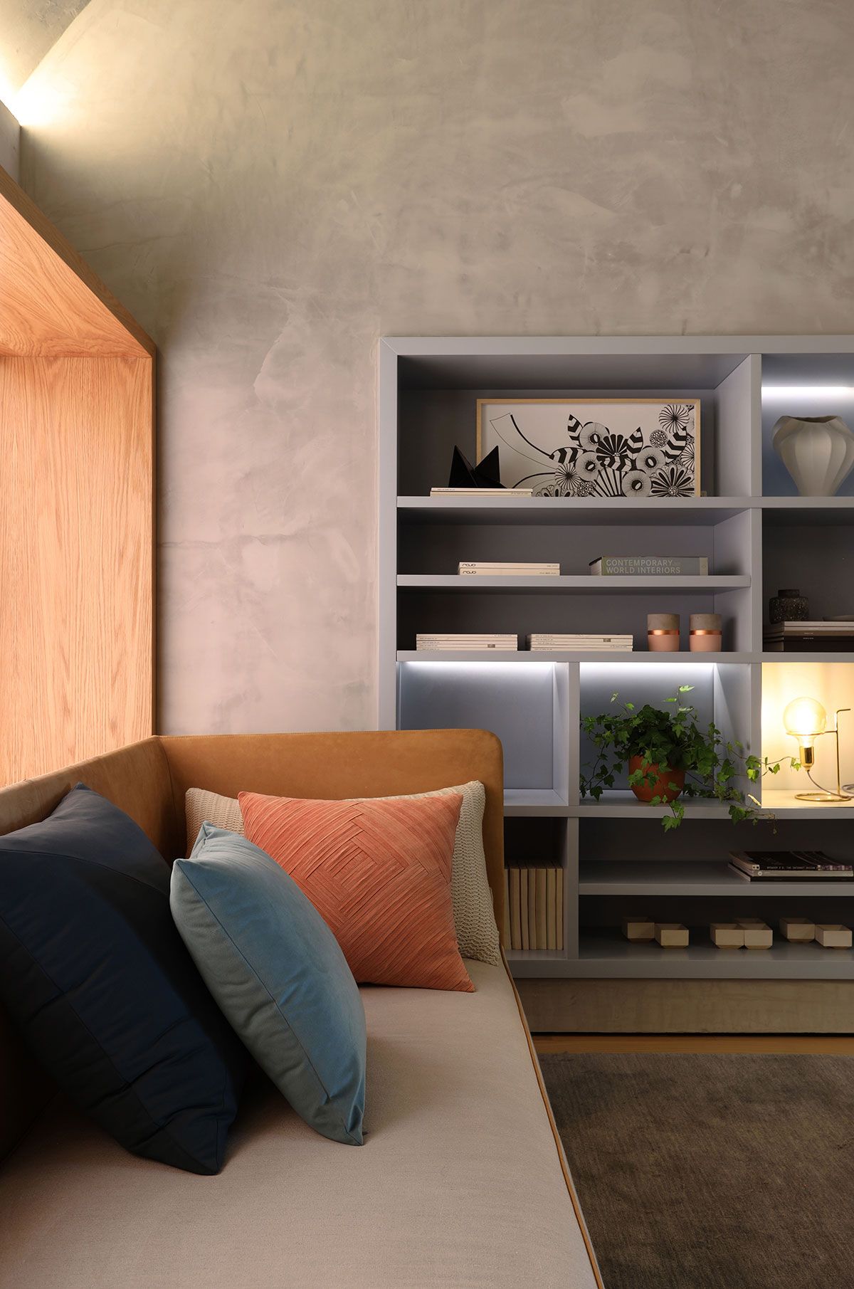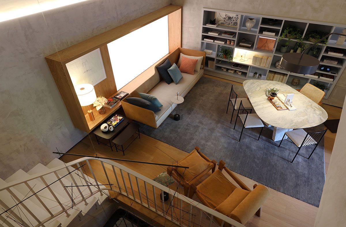 Já na iluminação, Fernanda decidiu não ter um único ponto de luz no teto, uma vez que a estrutura curva é tombada pelo patrimônio histórico e não poderia sofrer intervenções. Desta limitação veio a inspiração: fã de Lina Bo Bardi, a arquiteta imediatamente se recordou da famosa “Casa de Vidro”, e assim, nasceu uma iluminação 100% indireta. O piso todo em madeira da Indusparquet em um tom mais claro, ajuda a iluminar o espaço.