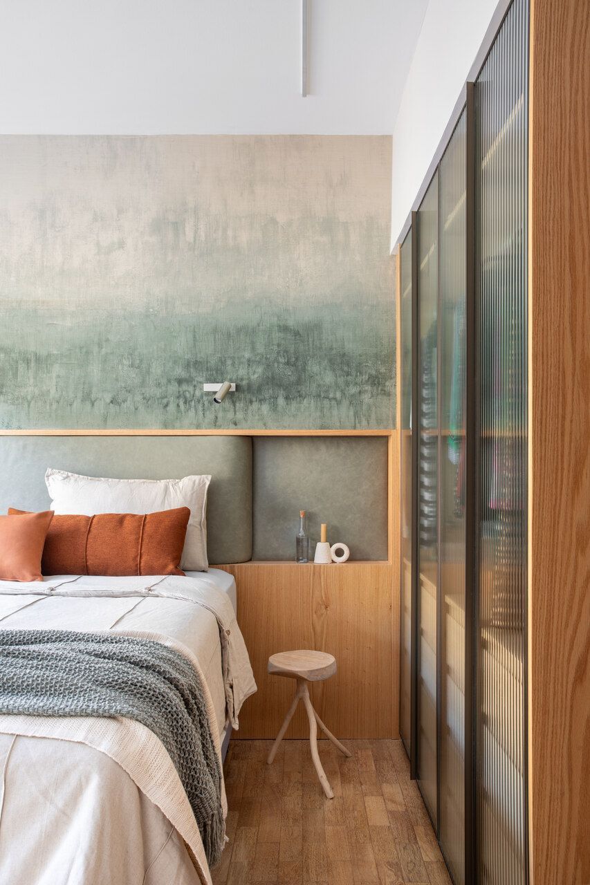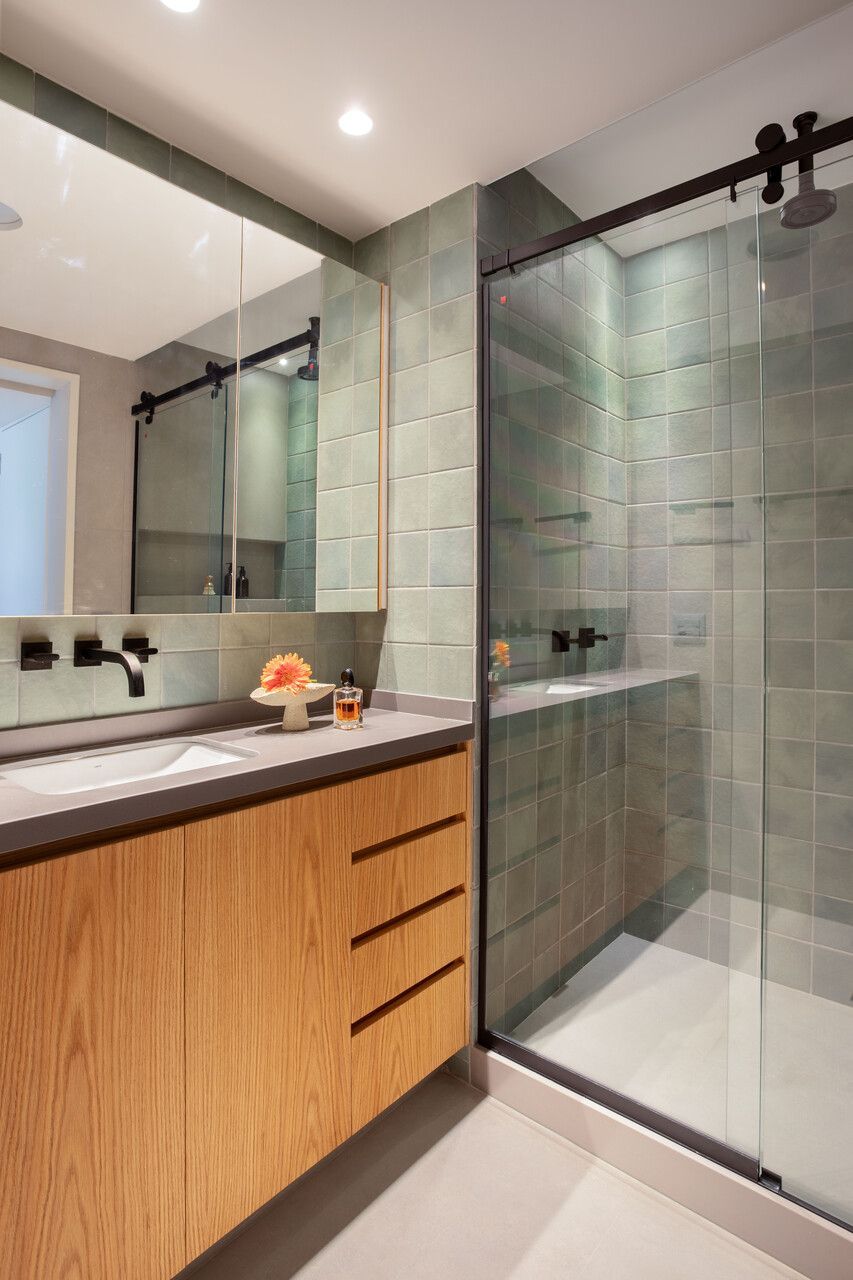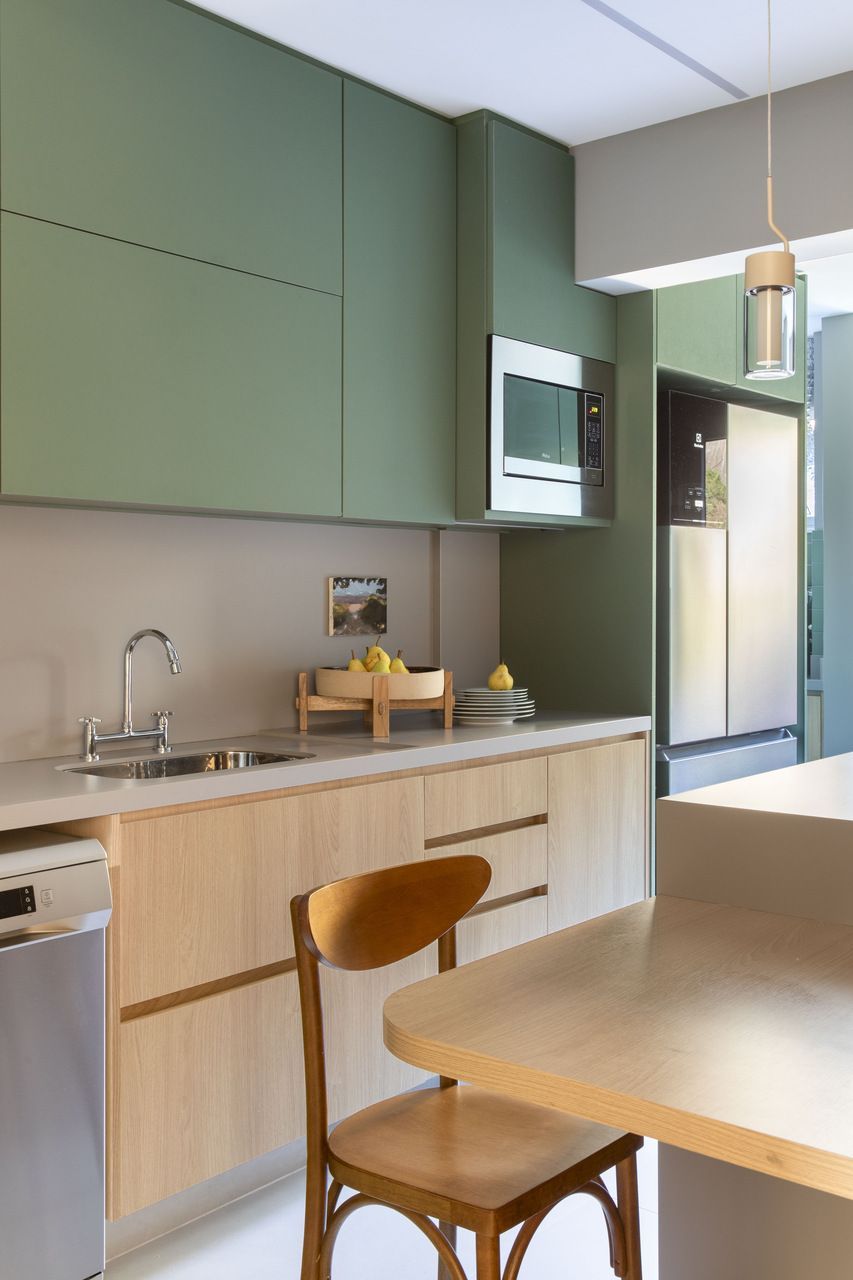 No geral, o projeto buscou criar espaços práticos, funcionais, claros e sem excessos. Para deixá-los mais acolhedores, a arquiteta apostou em marcenarias com acabamento em carvalho natural e acrescentou tons de verde e azul – que são as cores prediletas dos clientes – em todos os cômodos.