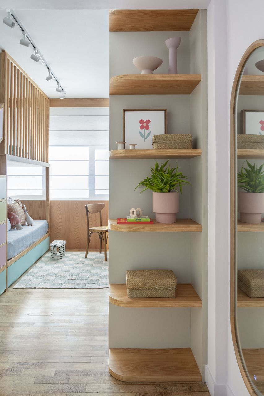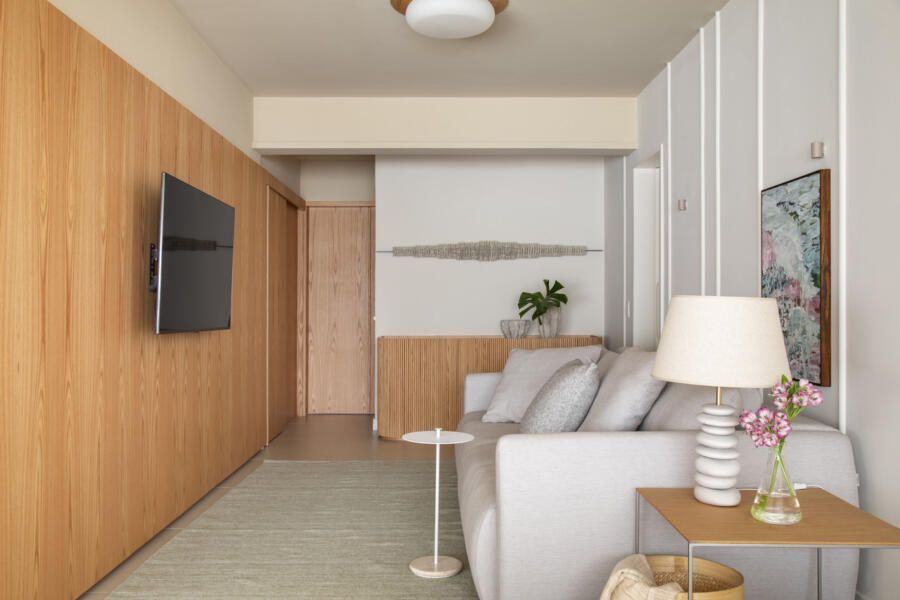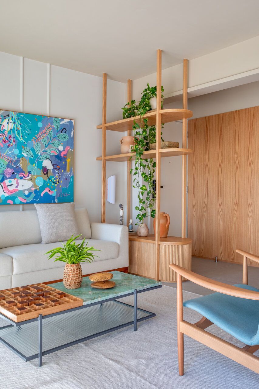 Um destaque no projeto é a marcenaria multiuso com quinas arredondadas, que vai do piso ao teto na entrada da sala, sendo a parte inferior revestida com ripas abauladas de madeira. O mesmo acabamento foi usado no painel de parede que começa no hall de entrada, segue pela sala de tv e adentra a circulação, mimetizando as portas de acesso ao escritório e a cozinha.
