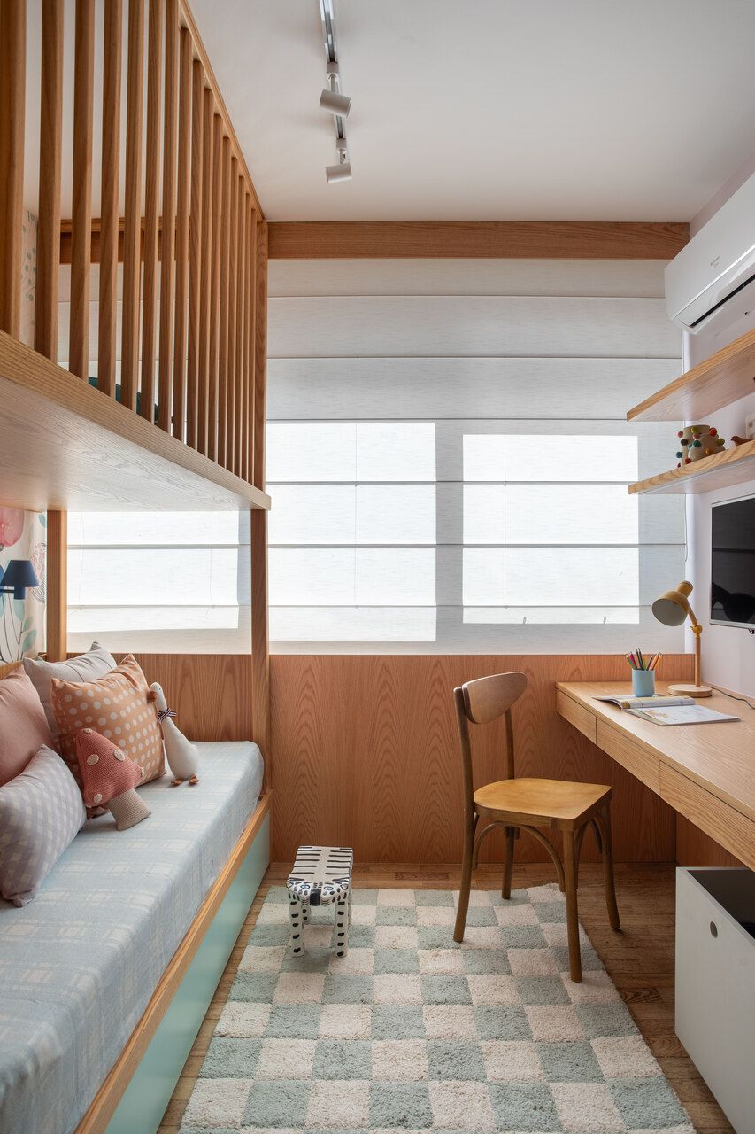 Originalmente, o apartamento tinha três quartos e dois banheiros e a suíte do casal ocupava o local do atual quarto da filha. Com a reforma, a arquiteta transformou os dois quartos dos fundos e o antigo banheiro social em uma suíte com closet para o casal, restando ainda espaço para um escritório de 8m², com sofá-cama para acomodar eventuais hóspedes. Agora ocupado pela filha, o antigo dormitório do casal se tornou amplo, com espaço para uma cama de solteiro, dois armários, mezanino e escrivaninha. Por fim, o banheiro da antiga suíte do casal virou o atual banheiro social.