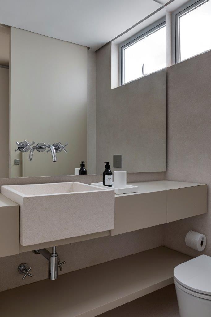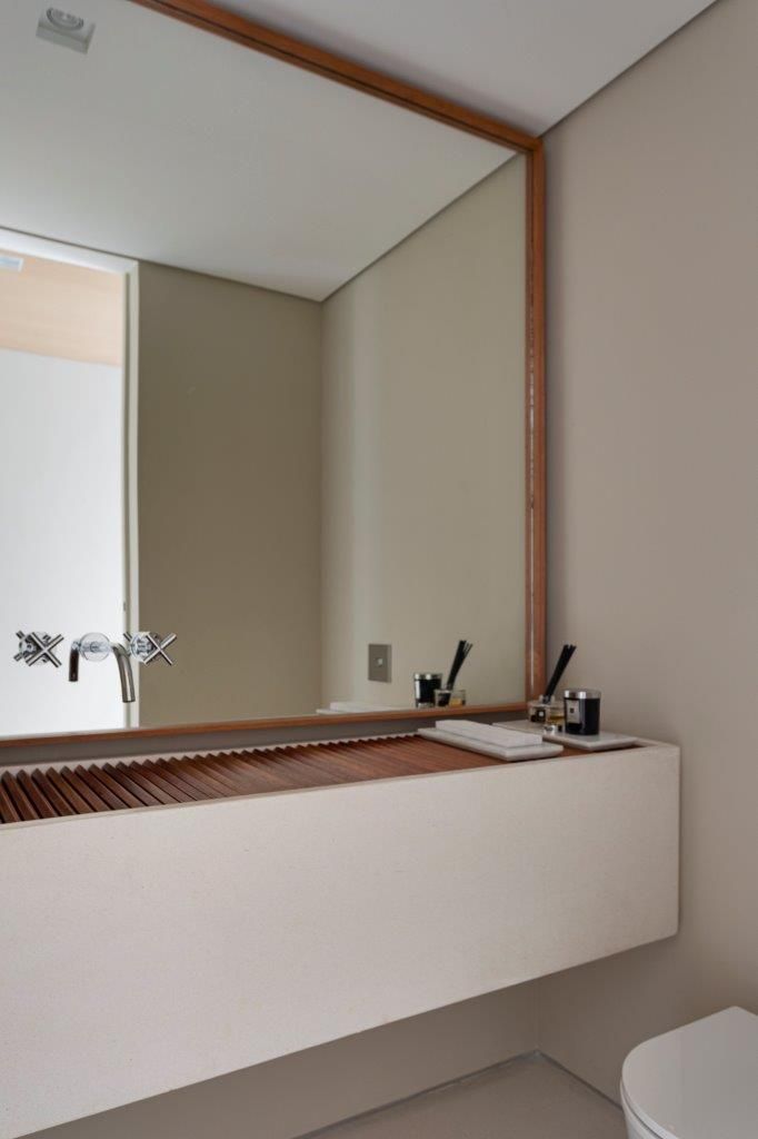 “Queriam um apartamento leve e funcional para receber família e amigos. Como fica na praia, pensamos em ser revestido quase que totalmente com um material único, granilite cor areia. Garantindo aspecto funcional do material e possibilidade de trabalhar com ele tanto em piso, paredes, nichos e bancadas.”