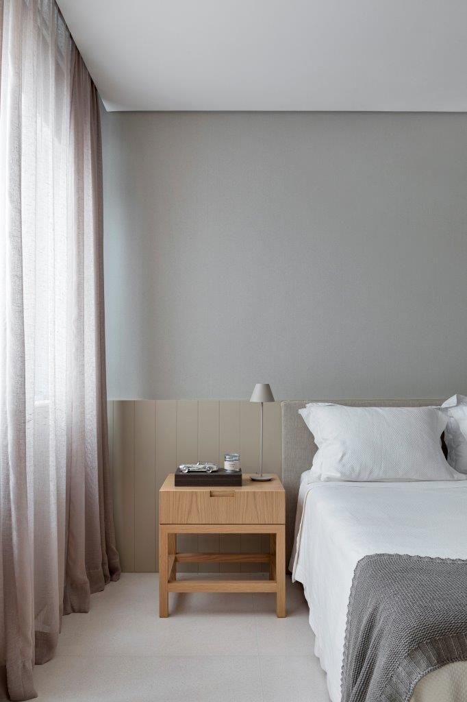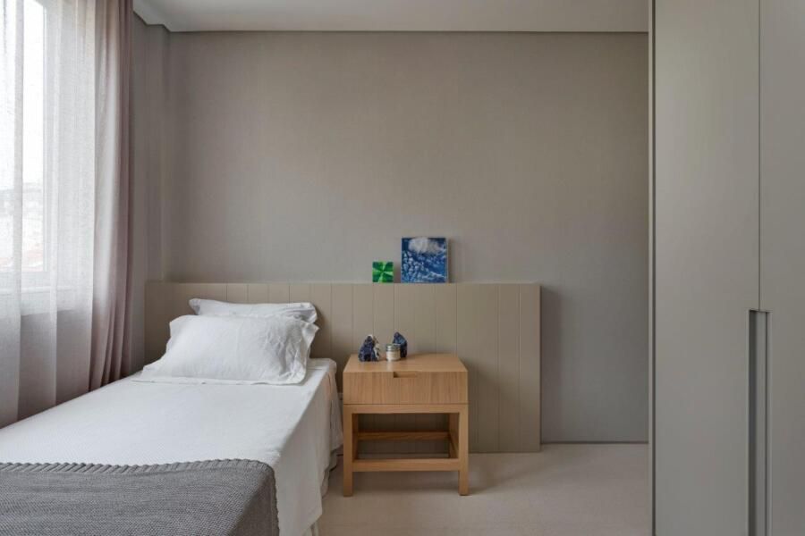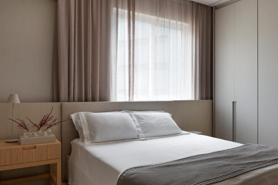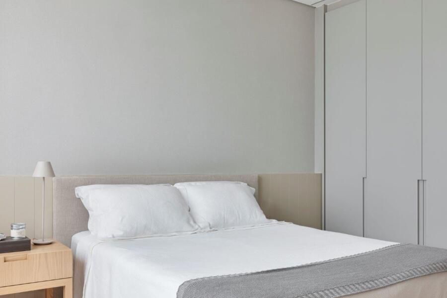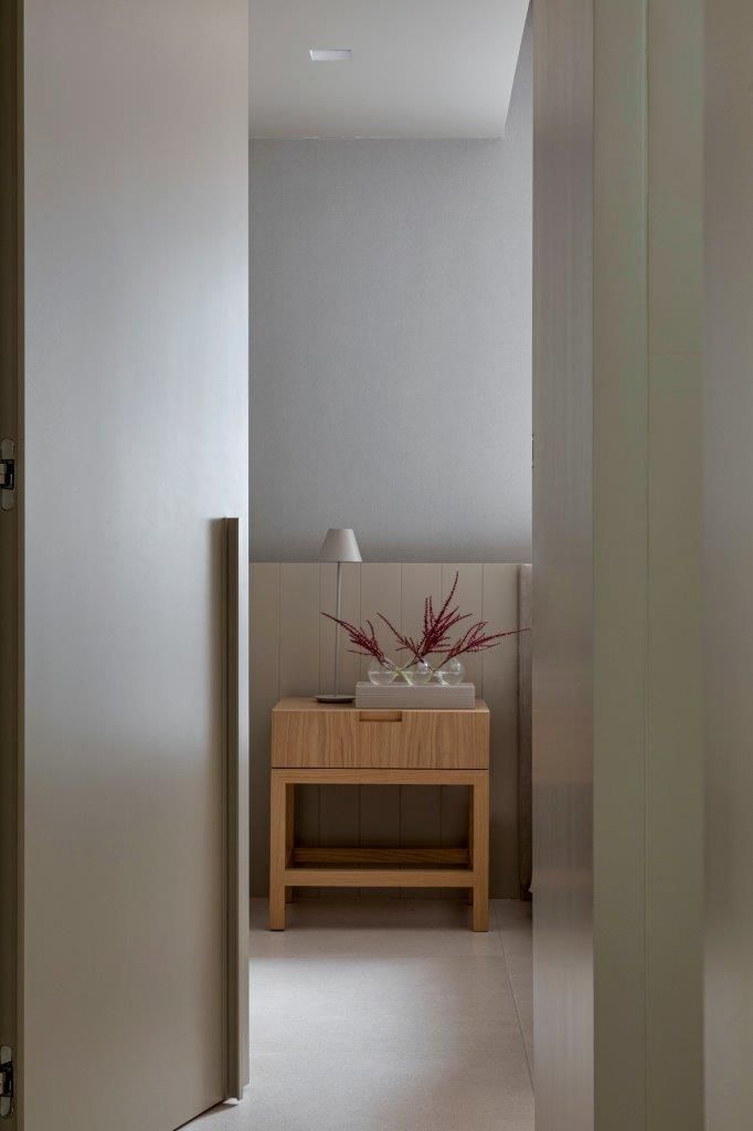 Como a ideia do casal é se mudar definitivamente para o Rio de Janeiro no futuro, foi colocada uma porta na circulação que permite o fechamento e cria privacidade para suíte master, banho master, dormitório 2 e banho 2. Essa solução funcional permite com que, havendo necessidade, a suíte master fique com dois banhos e mais armários.