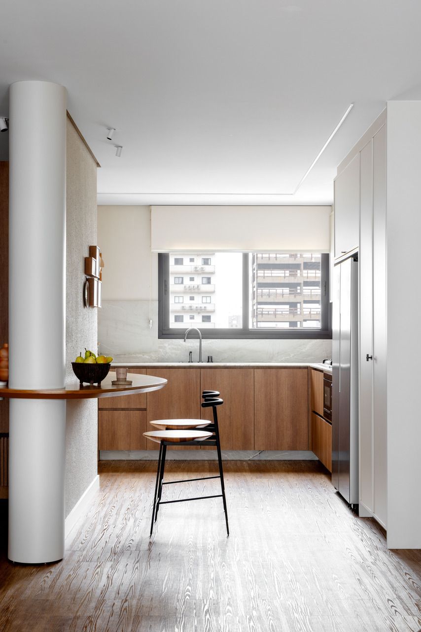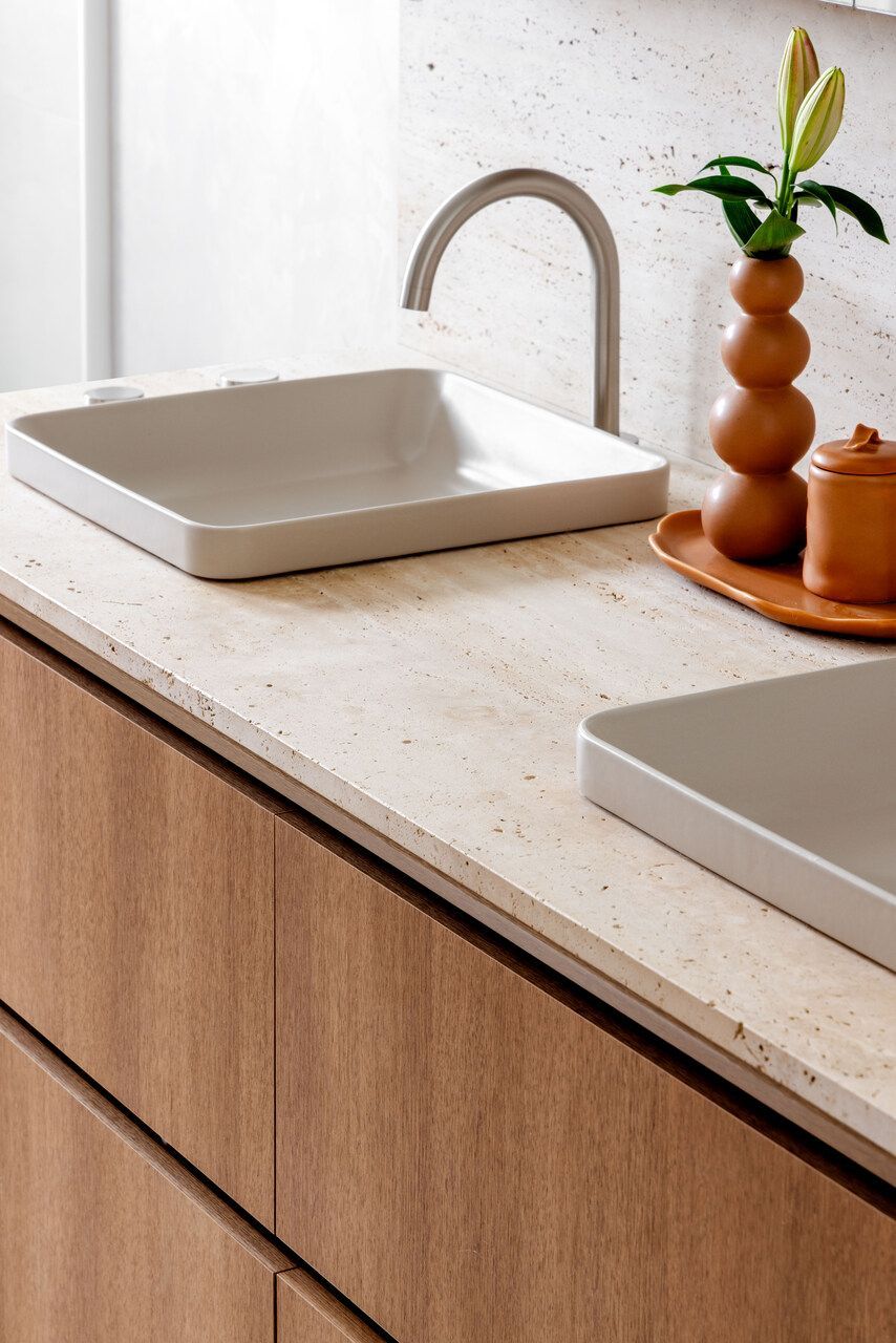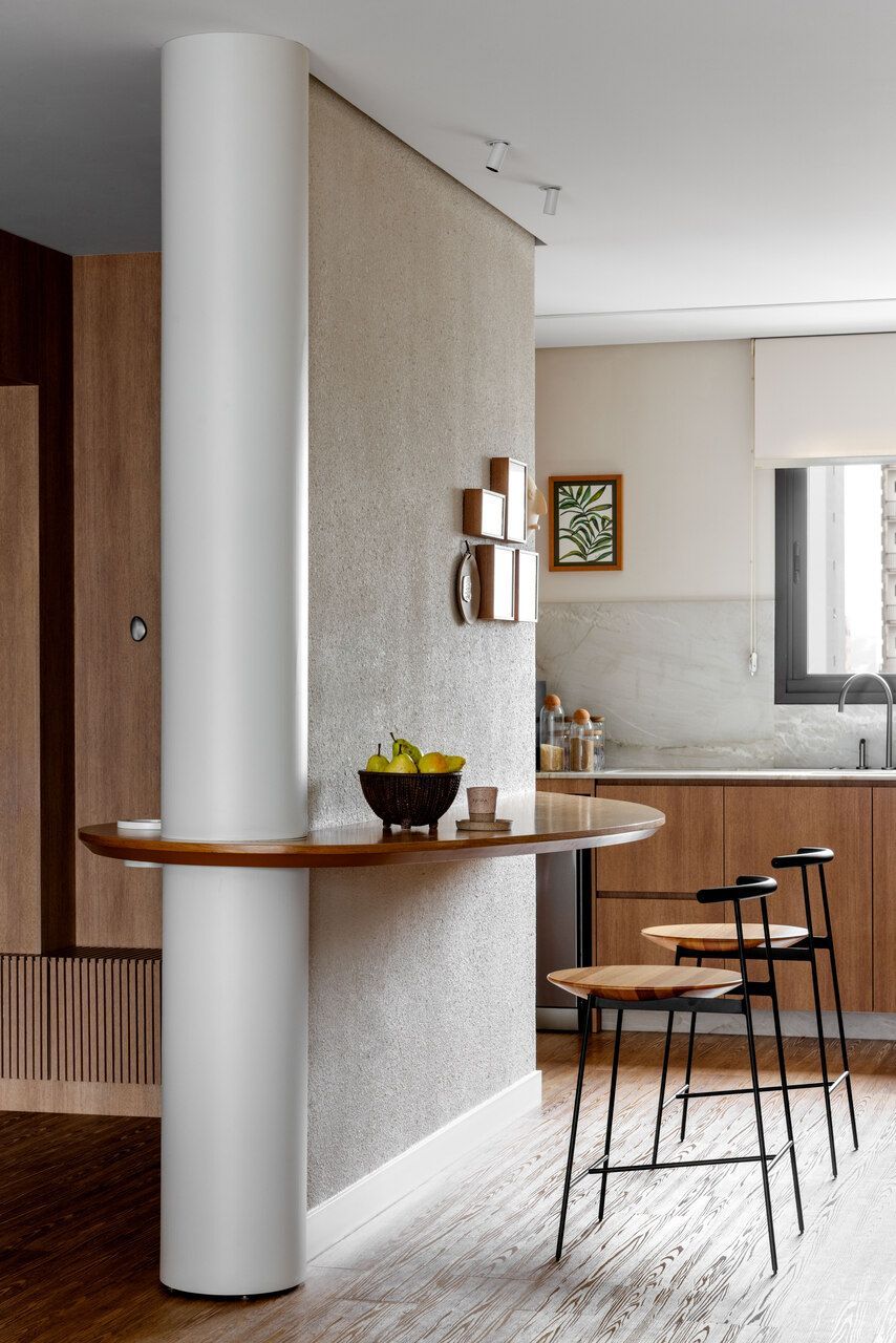 A marcenaria com linhas orgânicas e a paleta suave foram pensadas para integrar os ambientes de maneira fluida. Além disso, o uso de pedra natural, texturas e elementos de paisagismo ajudou a aproximar a natureza da rotina urbana.
