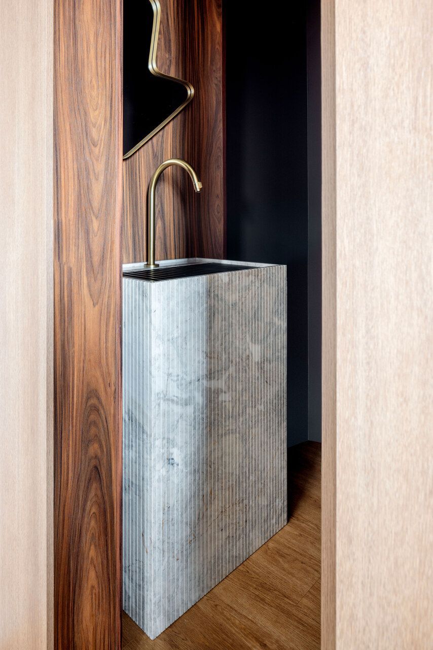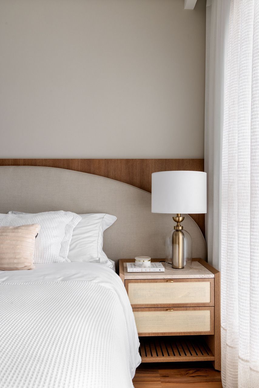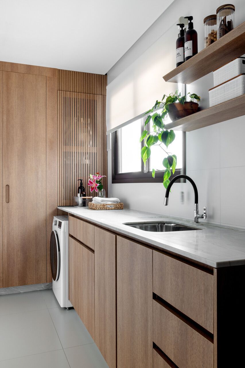 A marcenaria com linhas orgânicas e a paleta suave foram pensadas para integrar os ambientes de maneira fluida. Além disso, o uso de pedra natural, texturas e elementos de paisagismo ajudou a aproximar a natureza da rotina urbana.