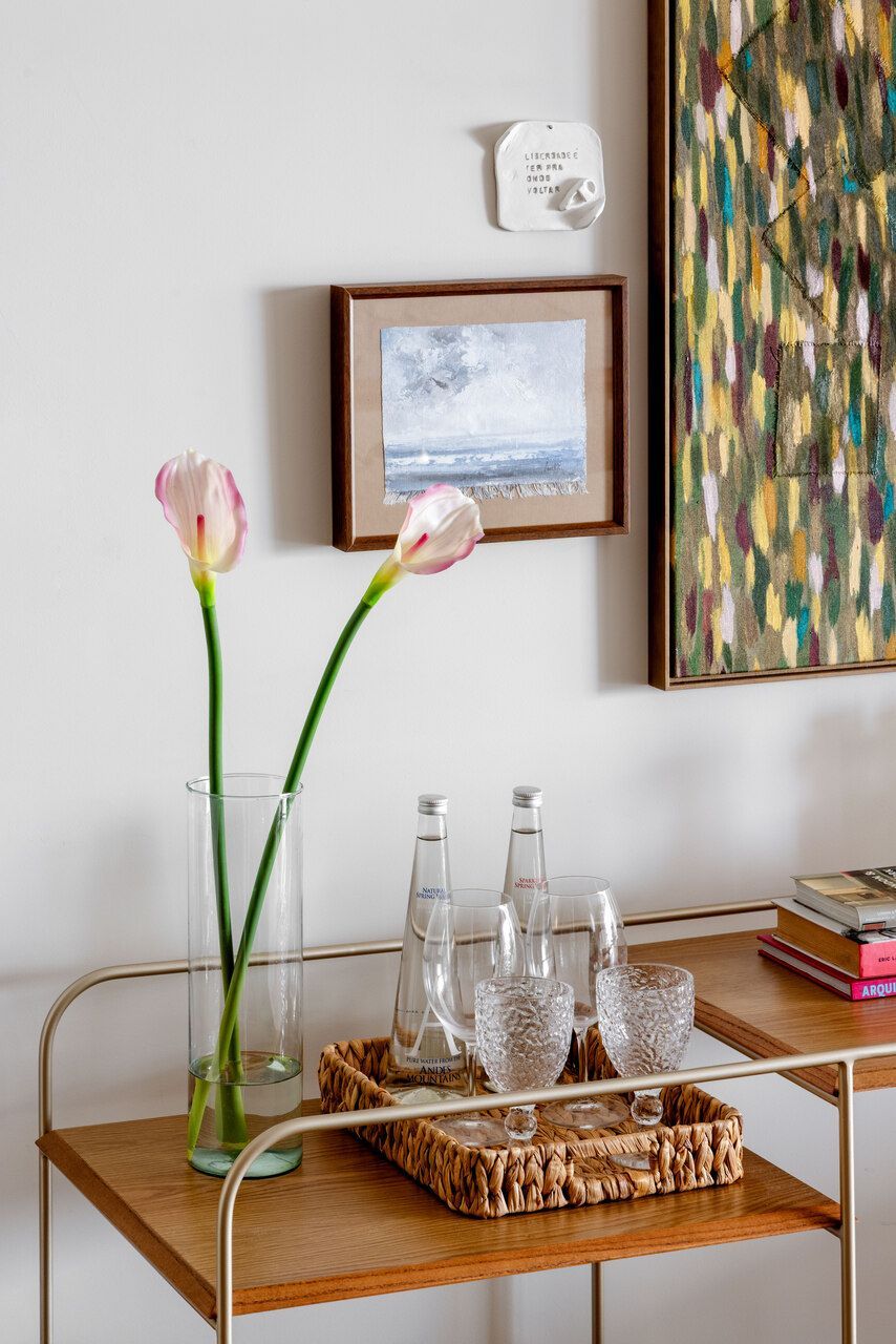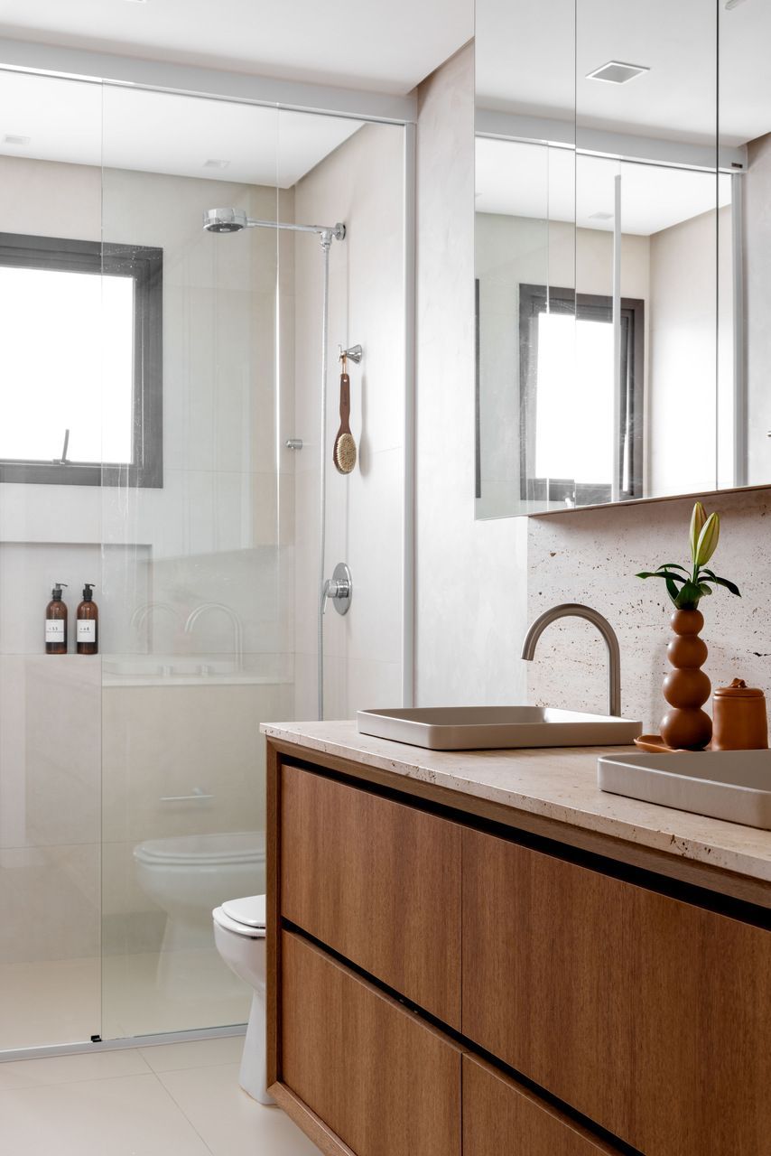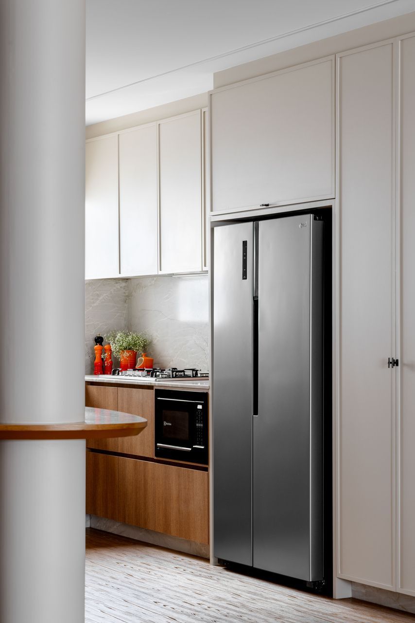 A principal transformação aconteceu na área social. Uma das primeiras ações foi ampliar os espaços de convivência: um dos banheiros foi demolido e o antigo banheiro de serviço deu lugar a um lavabo mais bem posicionado. A escolha por revestimentos mais neutros e naturais foi essencial para criar uma base aconchegante e convidativa.