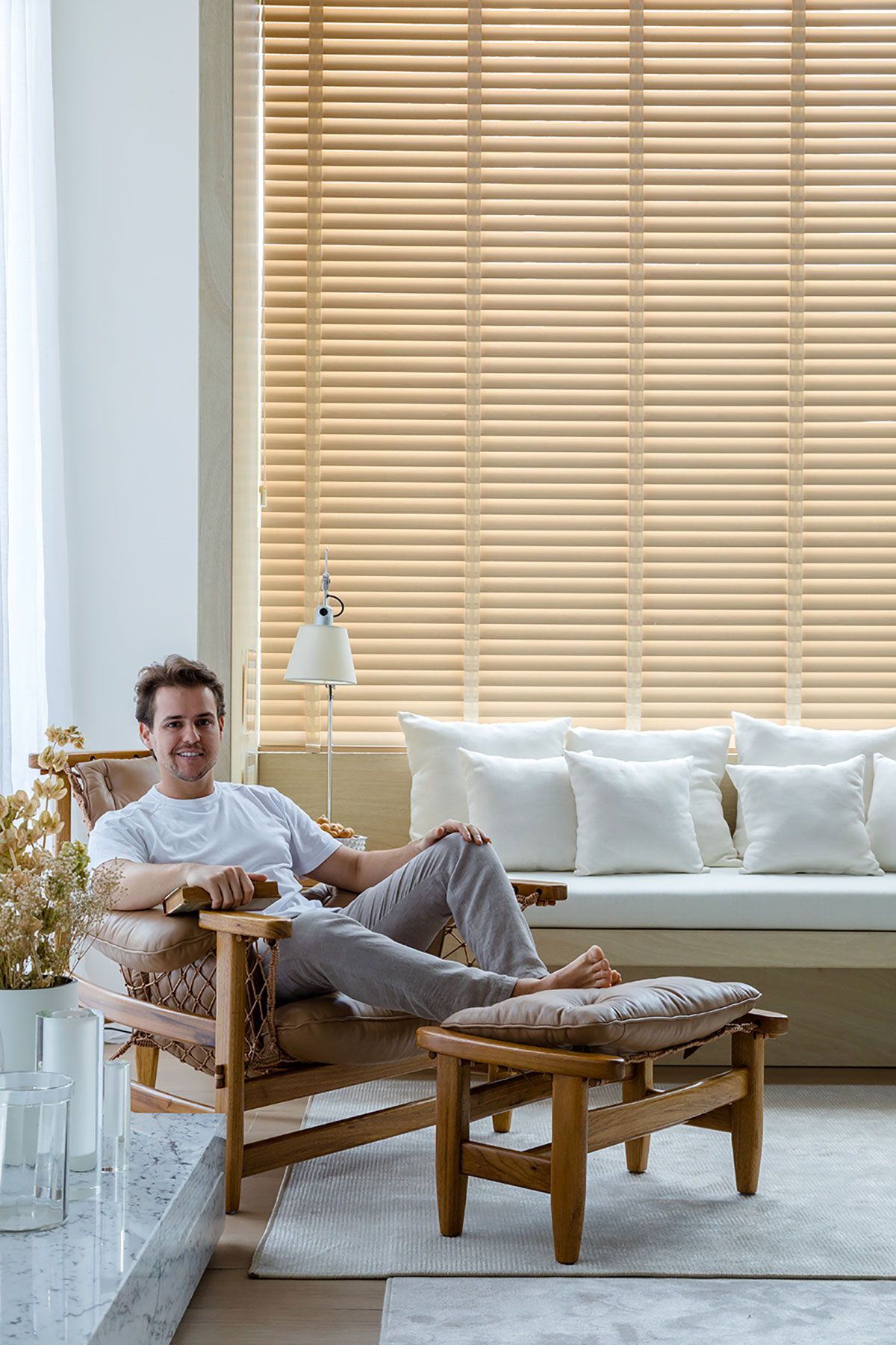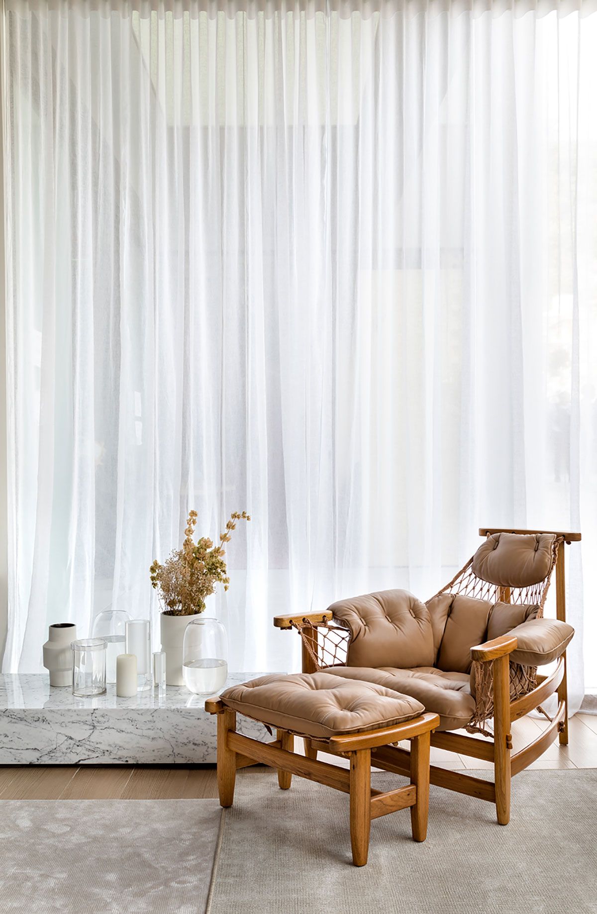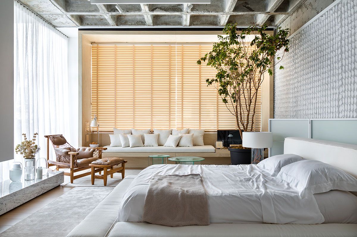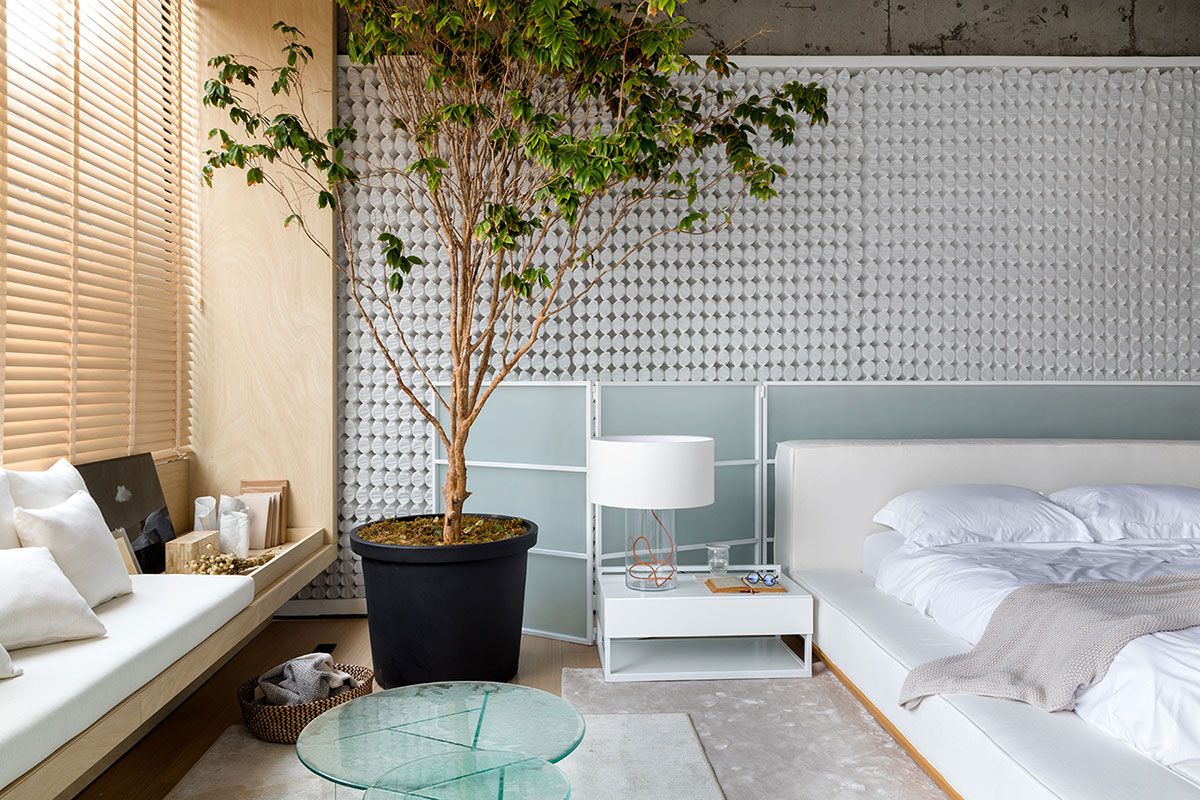 O profissional optou por cores claras, que não fogem dos tons de nude e das escalas de cinza. Dominante, o branco assume o papel de protagonista da paleta, enquanto estratégicos pontos pretos se destacam. Assim como o pórtico amadeirado que emoldura a janela e cria um pequeno living diante do dormitório ofertando a luz necessária à beleza da jabuticabeira.