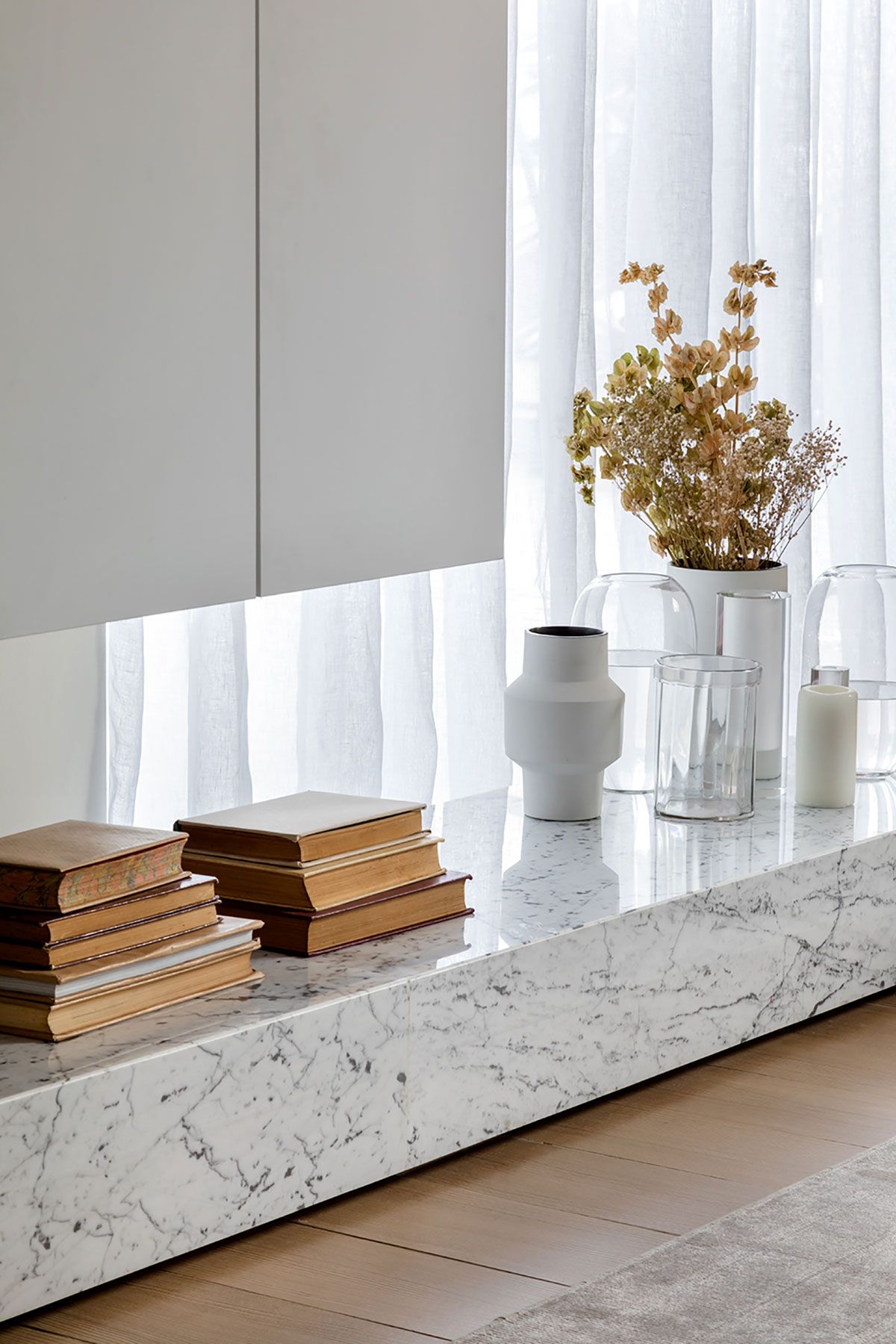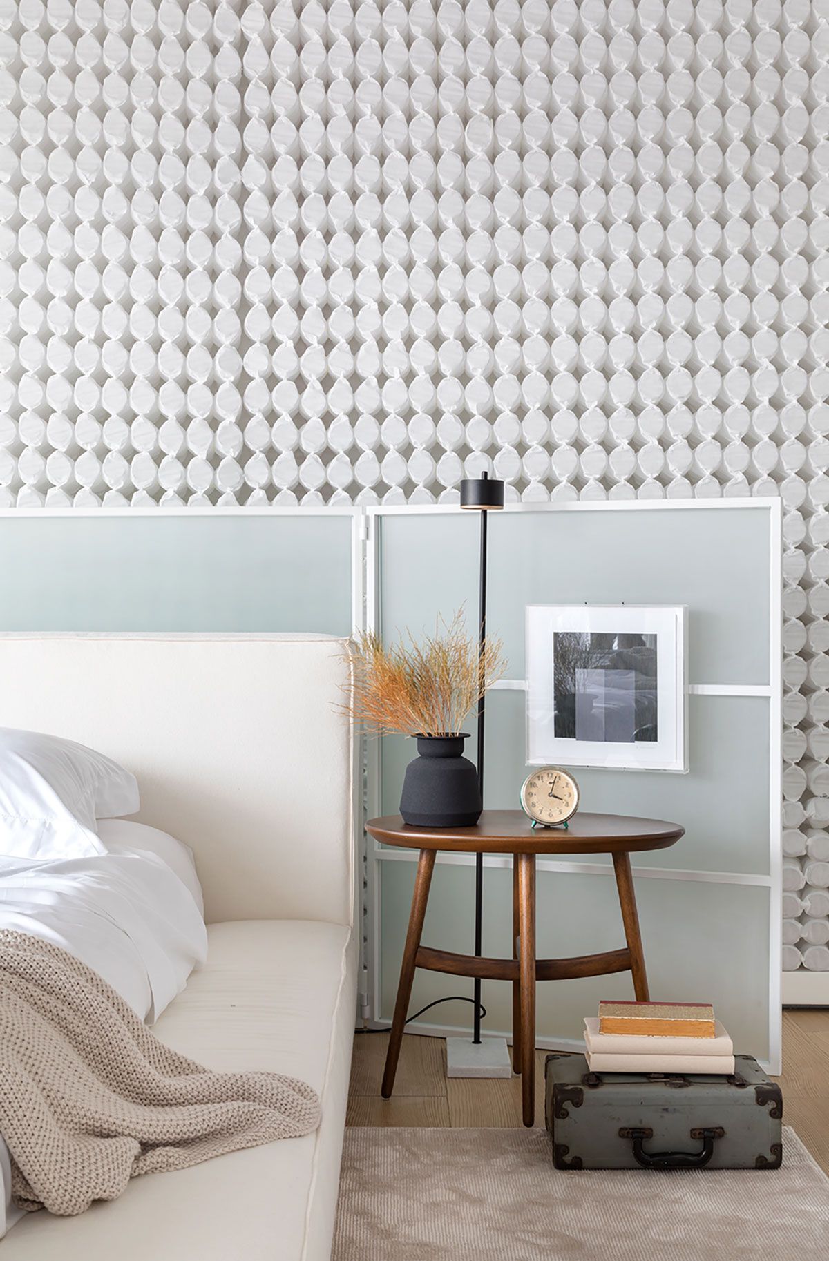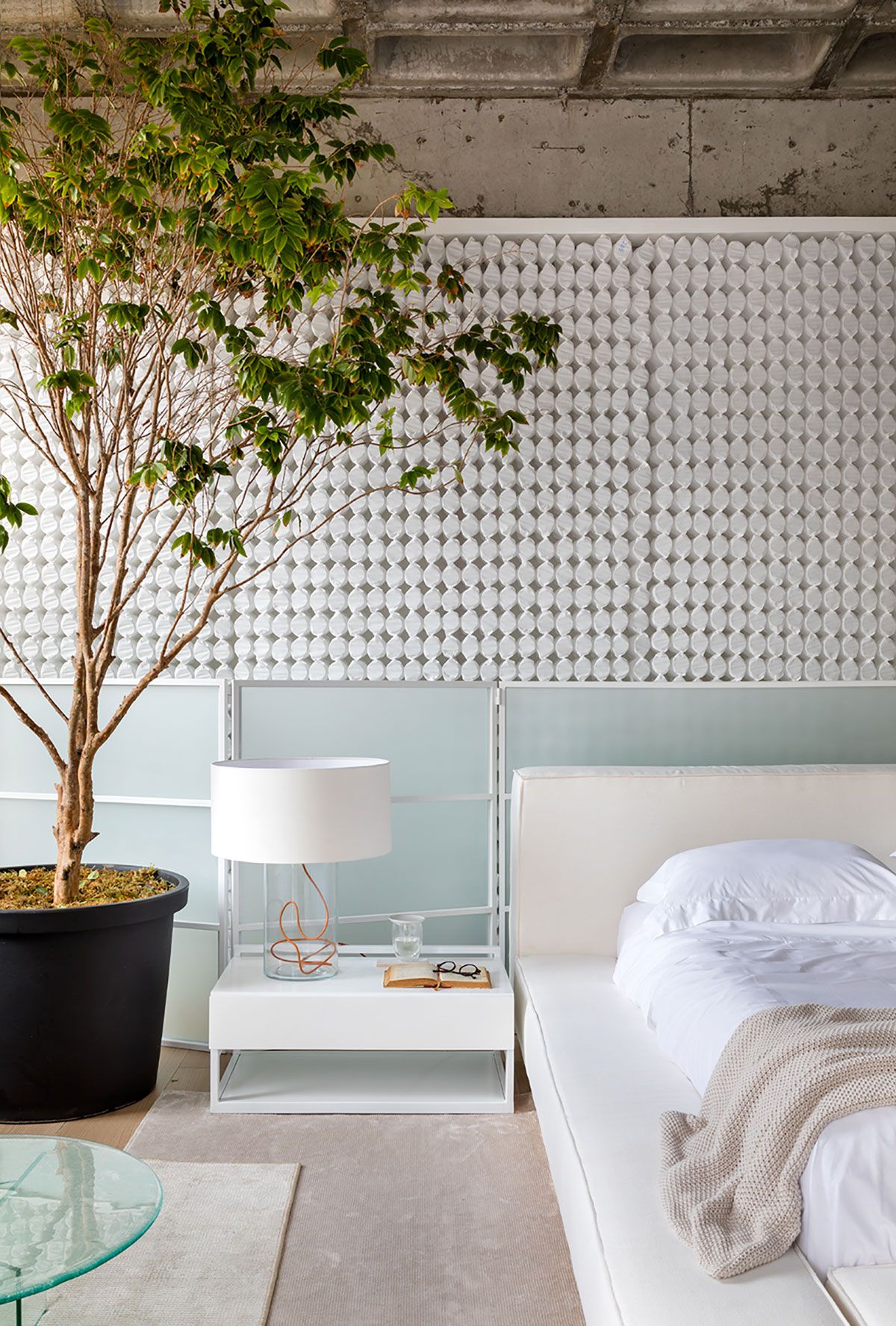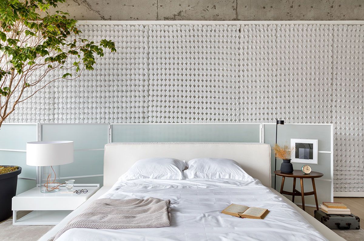 O profissional optou por cores claras, que não fogem dos tons de nude e das escalas de cinza. Dominante, o branco assume o papel de protagonista da paleta, enquanto estratégicos pontos pretos se destacam. Assim como o pórtico amadeirado que emoldura a janela e cria um pequeno living diante do dormitório ofertando a luz necessária à beleza da jabuticabeira.