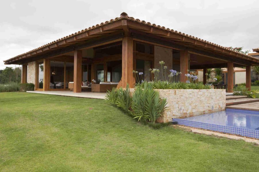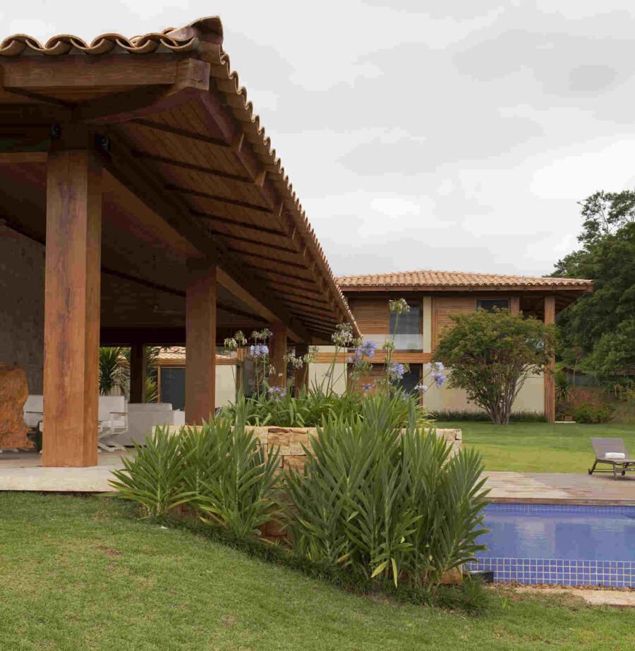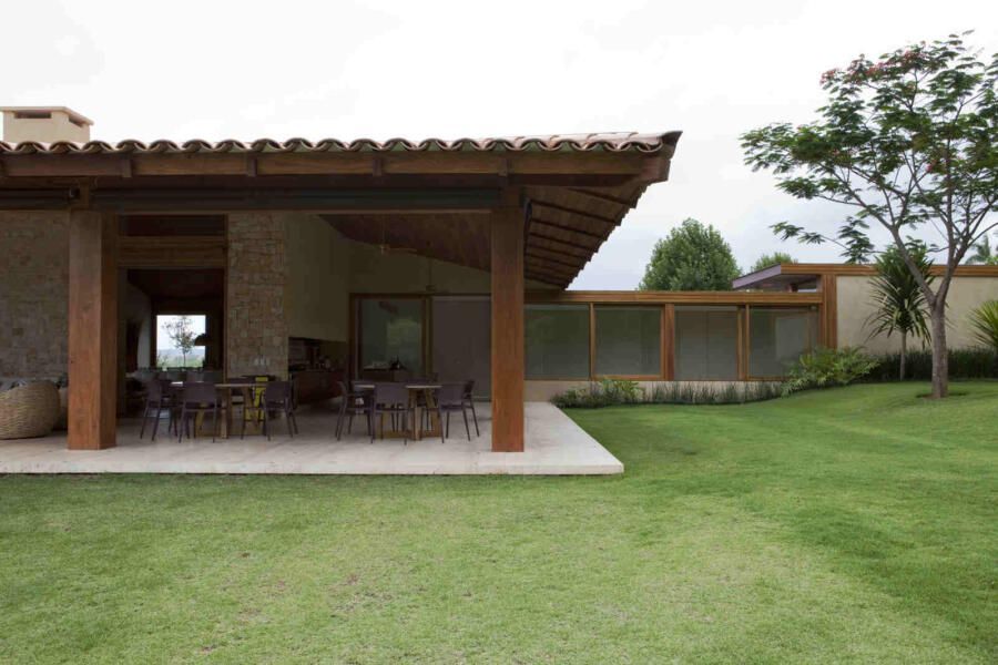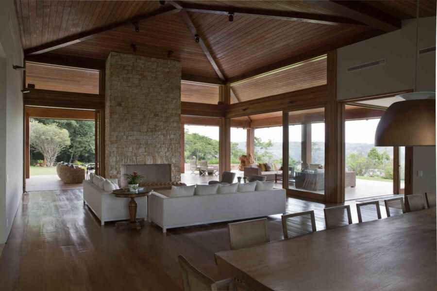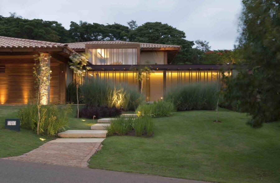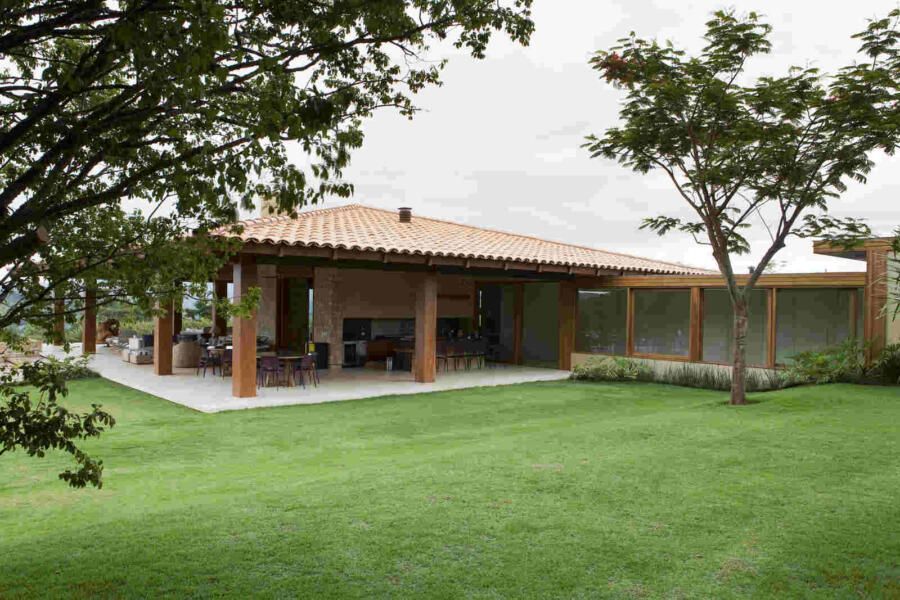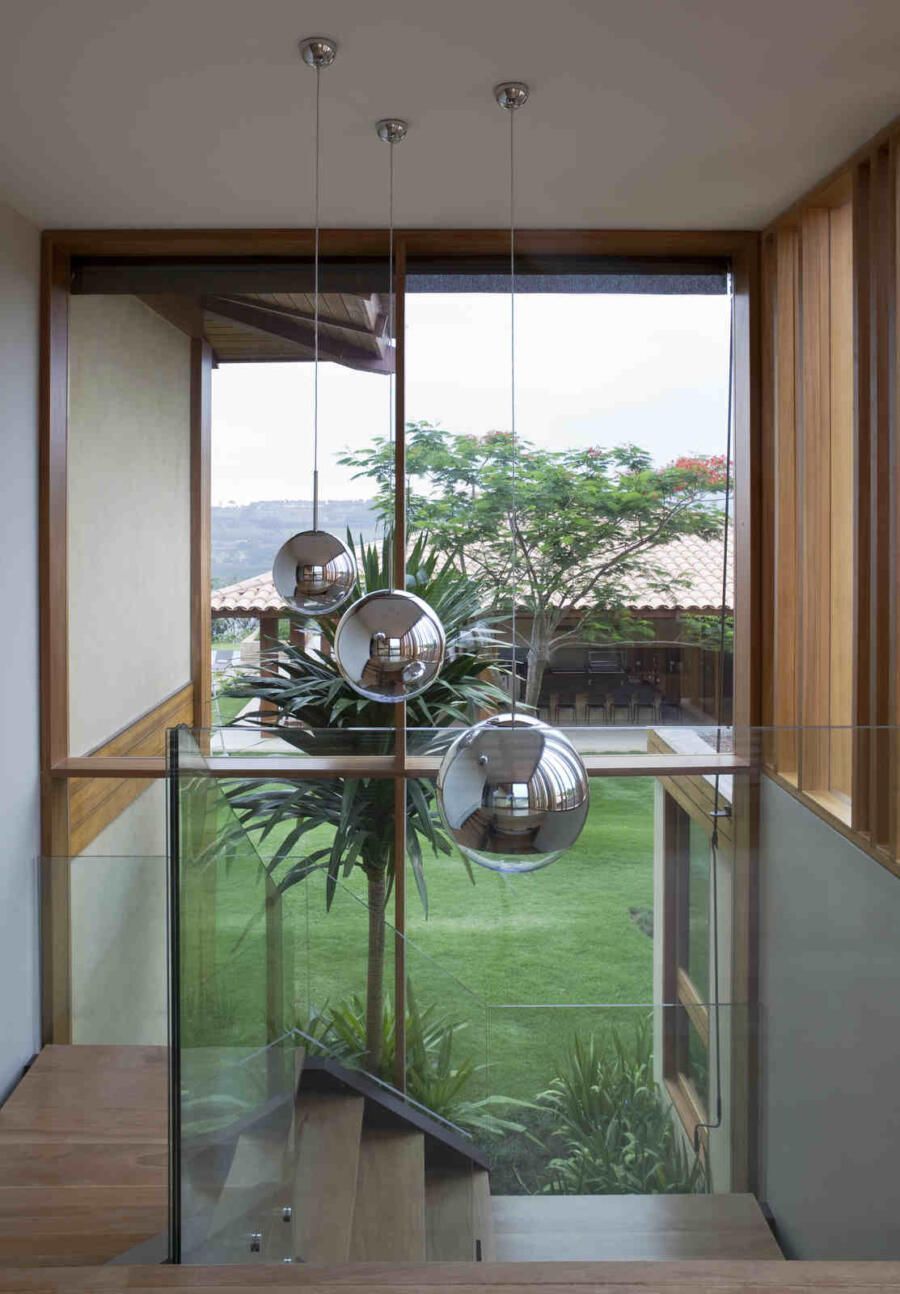 “Materiais que se integram facilmente a natureza foram predominantes no projeto, mantendo o clima de casa de campo. Há madeira nos caixilhos e revestimentos, pedras naturais na fachada, telhas de barro e muito vidro para dar transparência e conectar as áreas internas com áreas externas.”