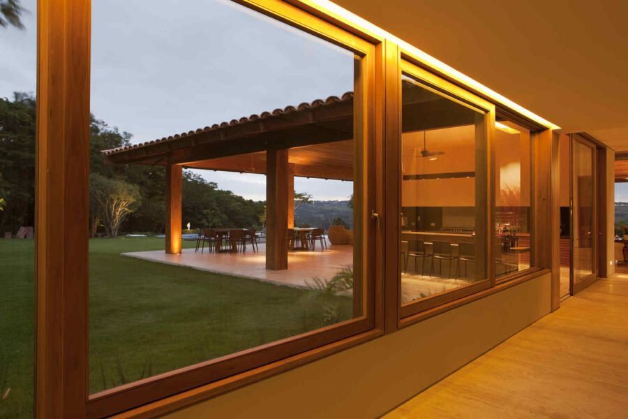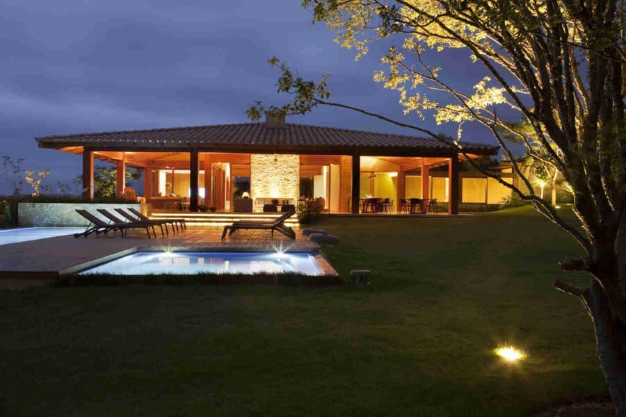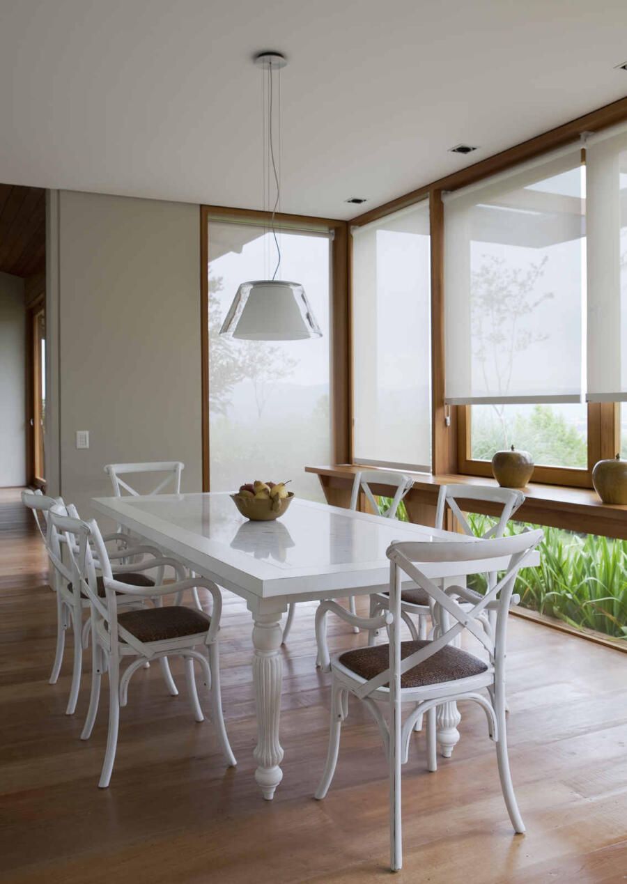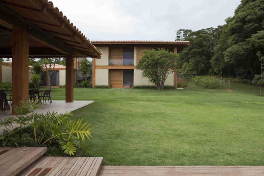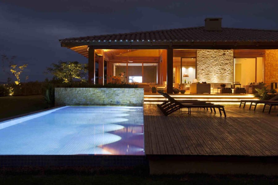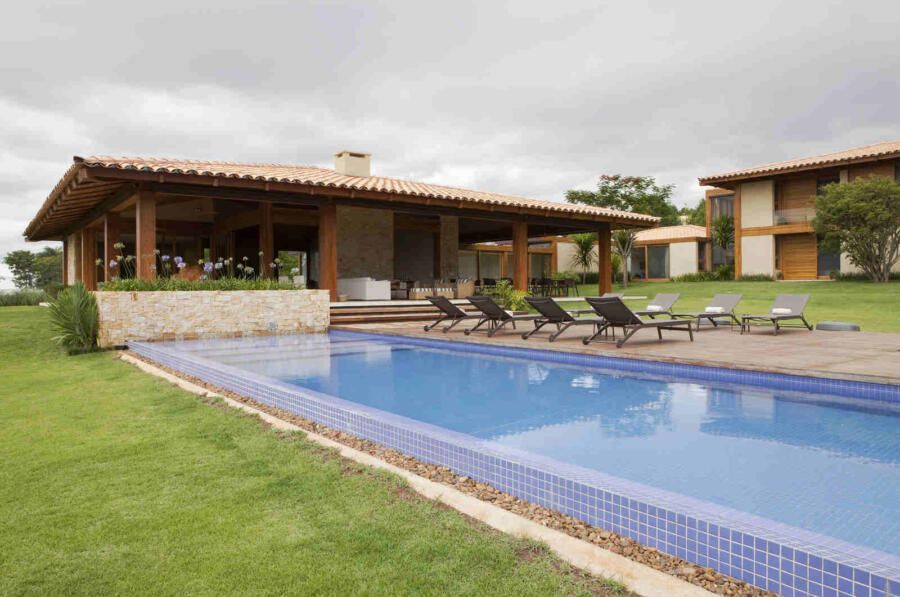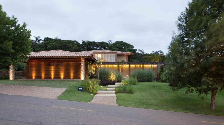 “Materiais que se integram facilmente a natureza foram predominantes no projeto, mantendo o clima de casa de campo. Há madeira nos caixilhos e revestimentos, pedras naturais na fachada, telhas de barro e muito vidro para dar transparência e conectar as áreas internas com áreas externas.”