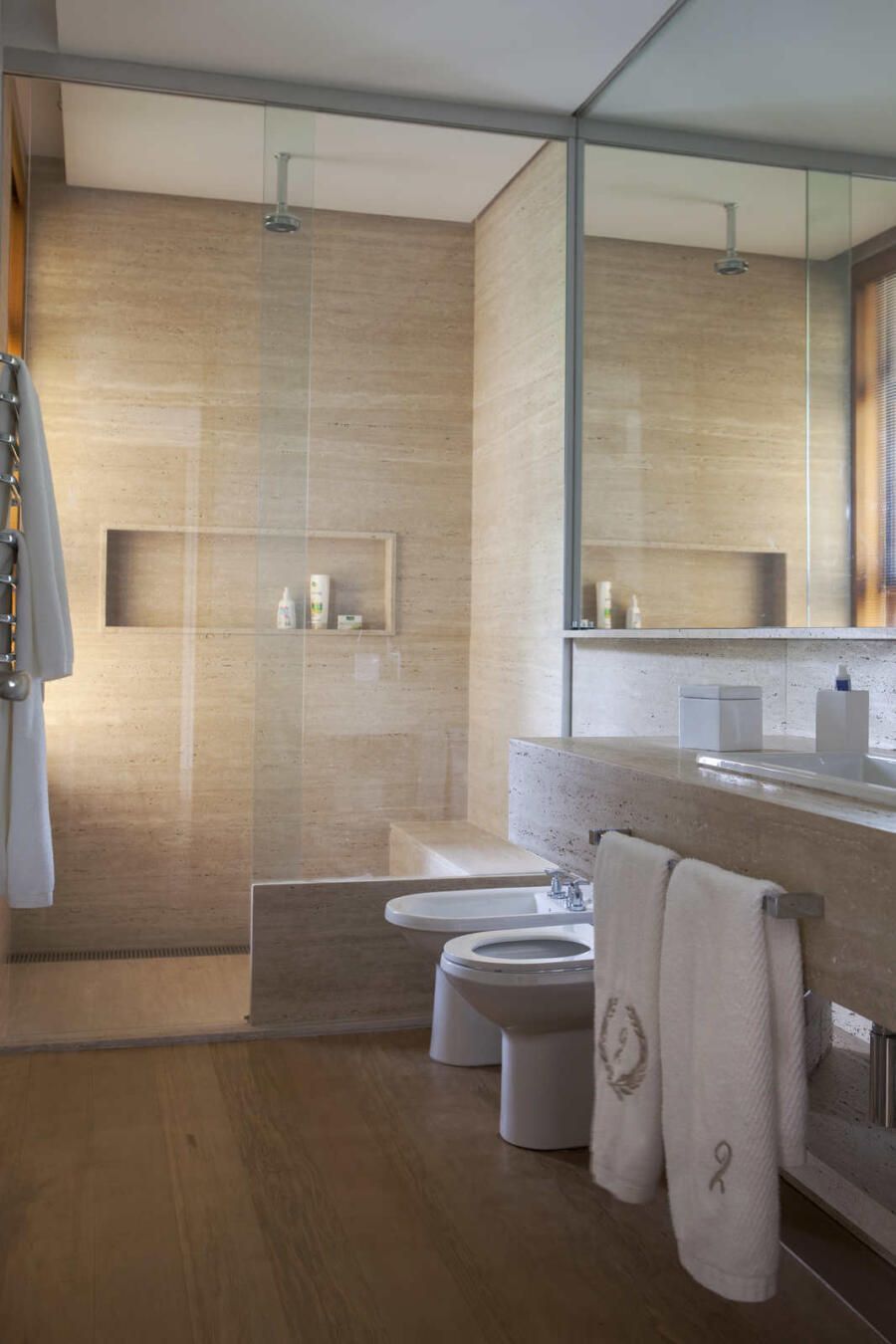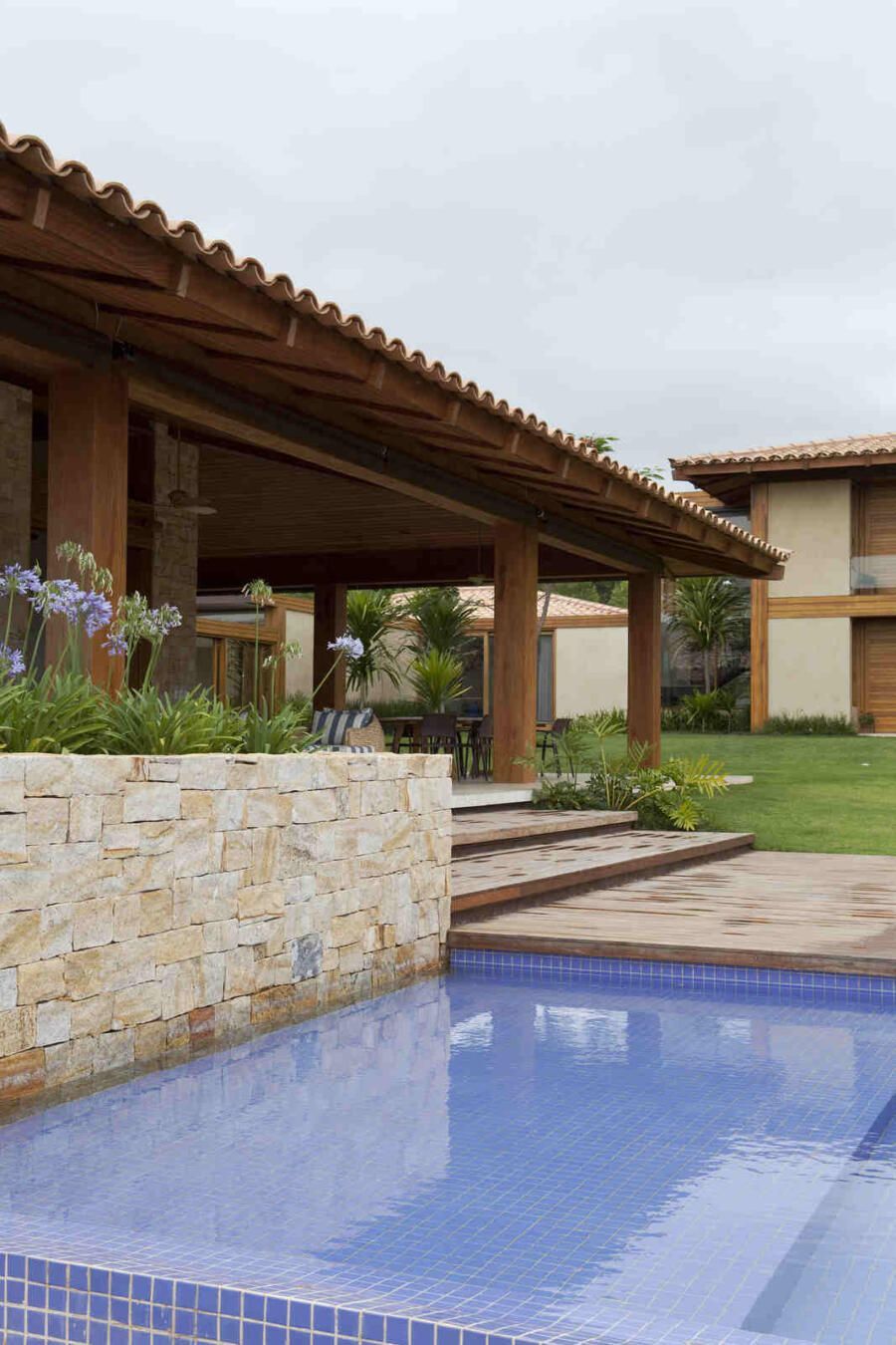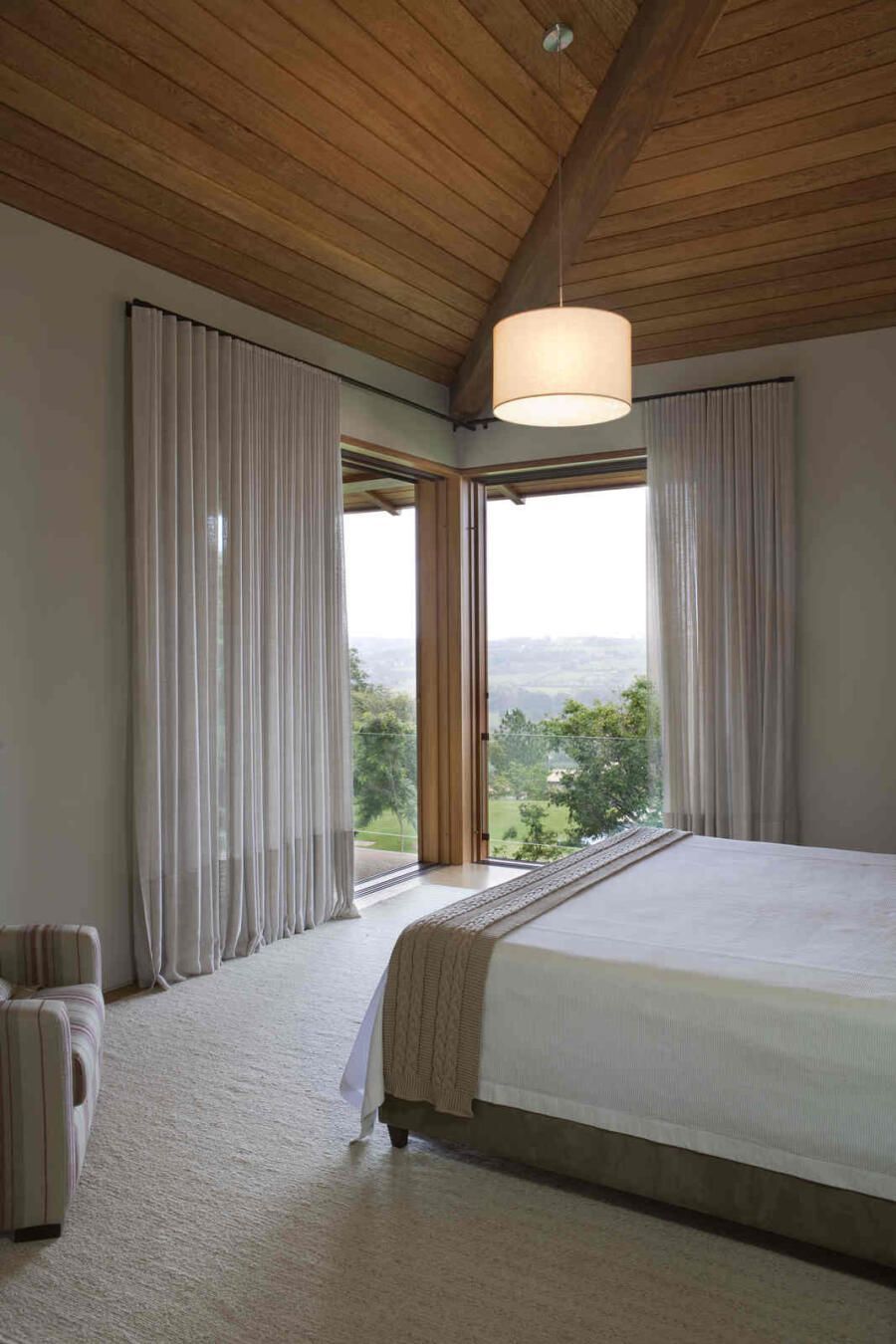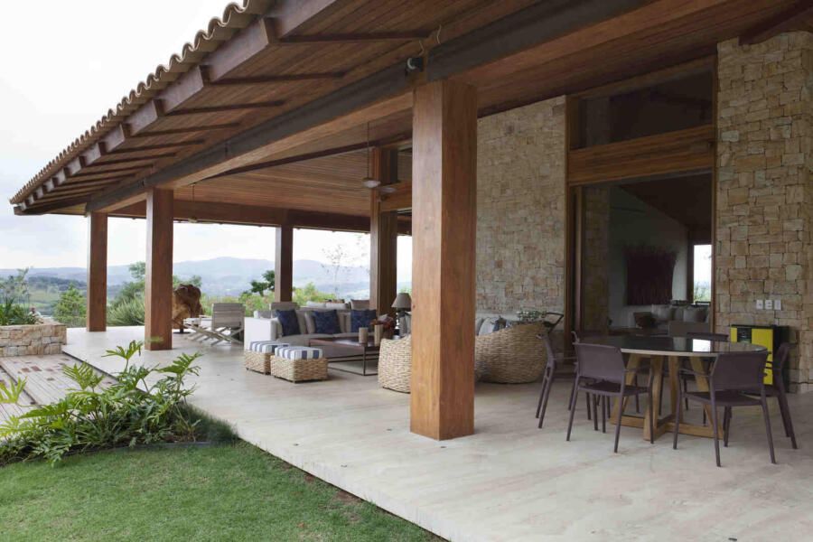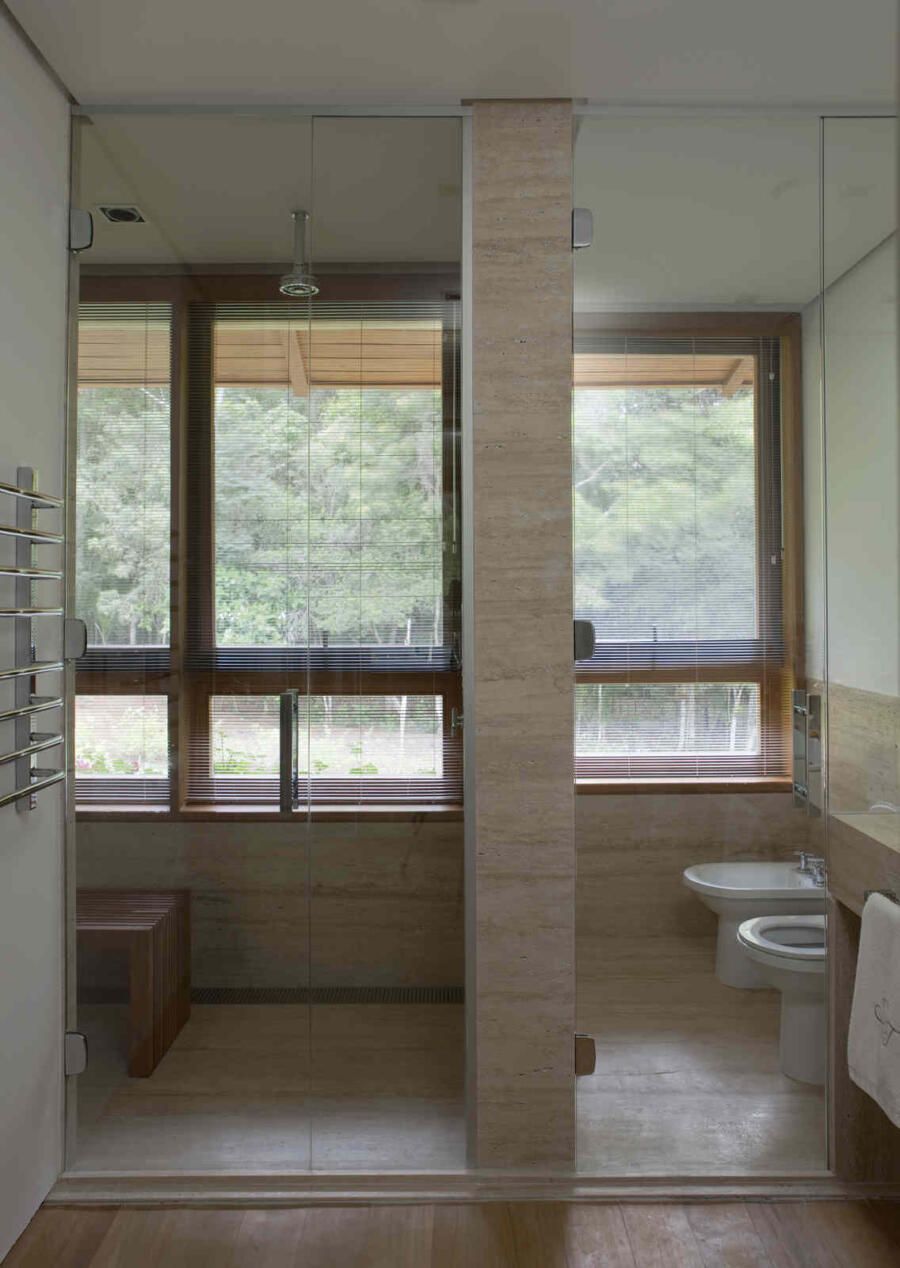 “Materiais que se integram facilmente a natureza foram predominantes no projeto, mantendo o clima de casa de campo. Há madeira nos caixilhos e revestimentos, pedras naturais na fachada, telhas de barro e muito vidro para dar transparência e conectar as áreas internas com áreas externas.”
