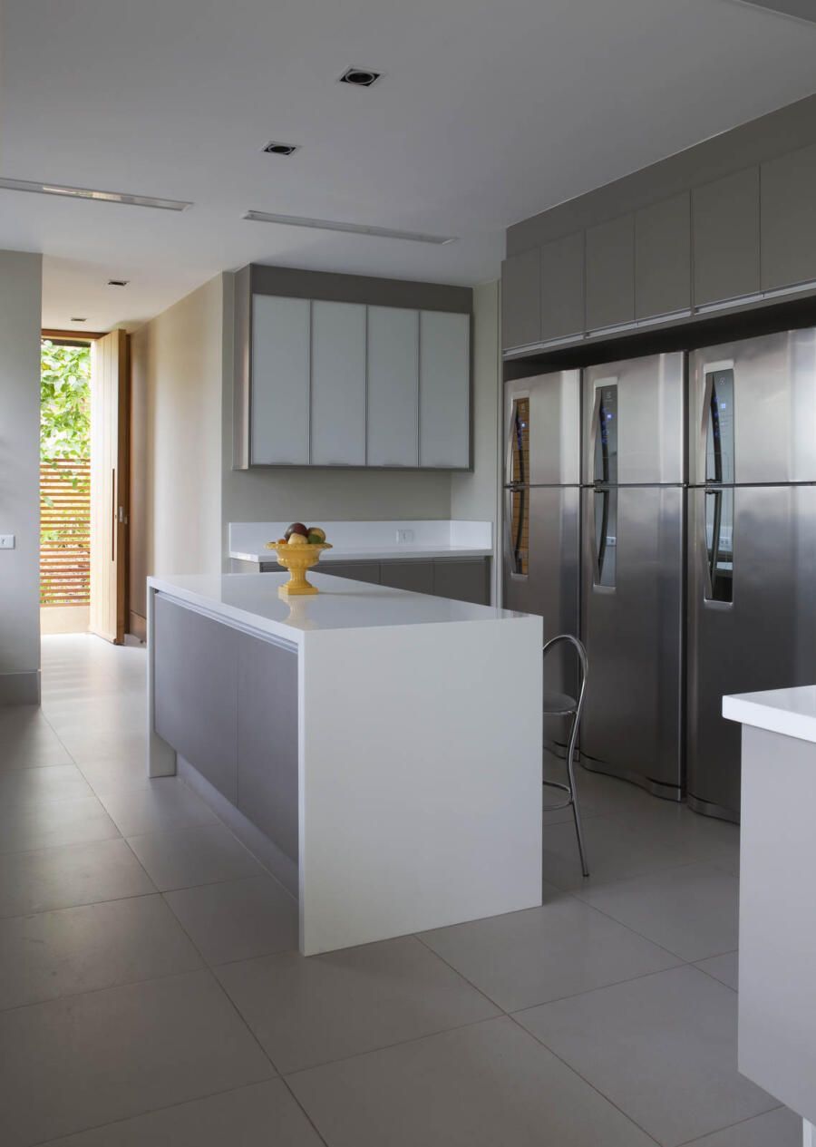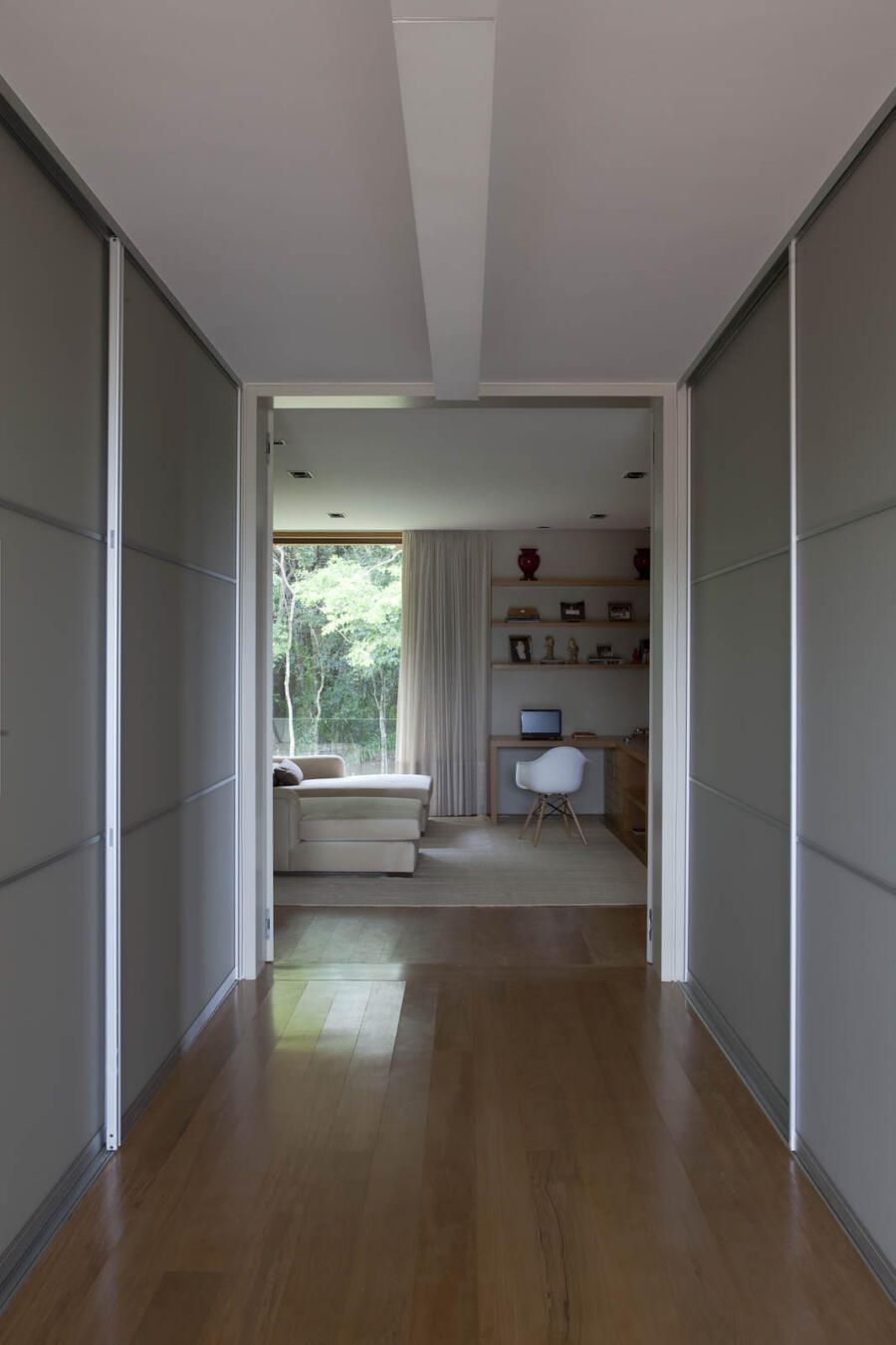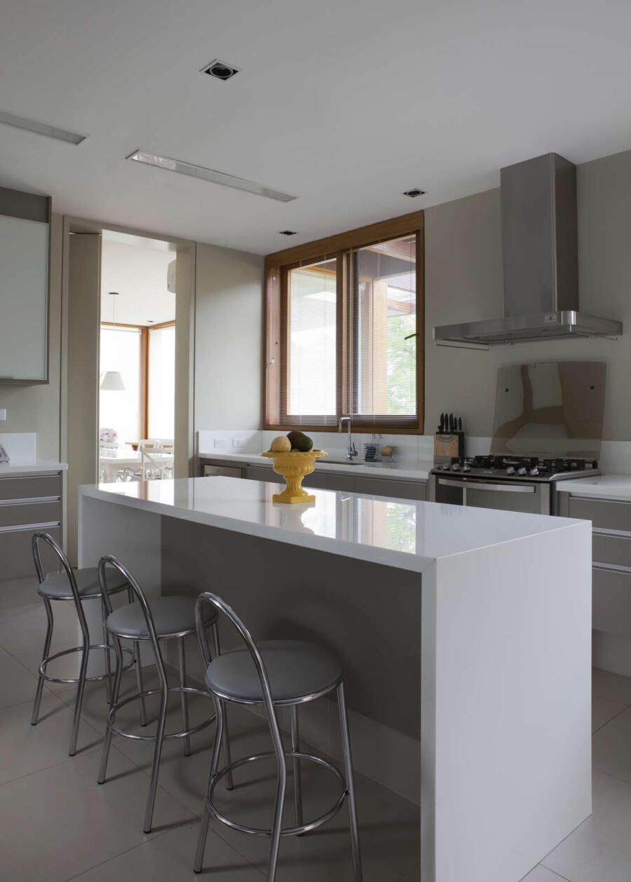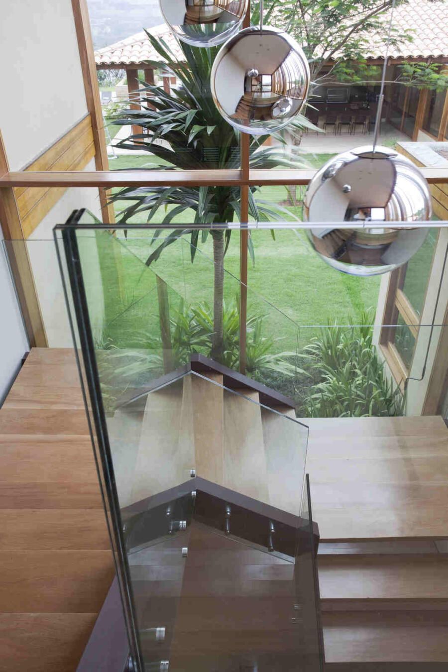 “A localização do imóvel valoriza as duas vistas do terreno, sendo uma delas voltada a uma reserva de mata. Para aproveitar o visual, criamos vários blocos interligados por uma galeria envidraçada que dá vista para o verde em todo o percurso.”