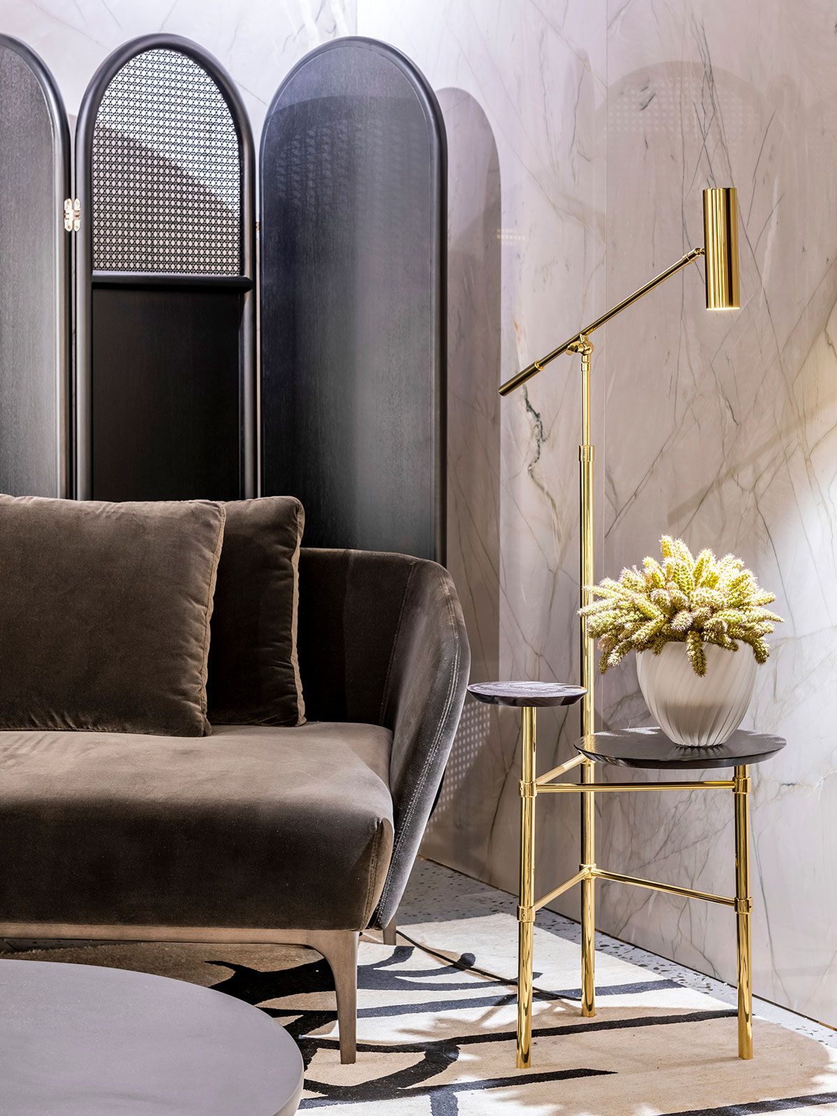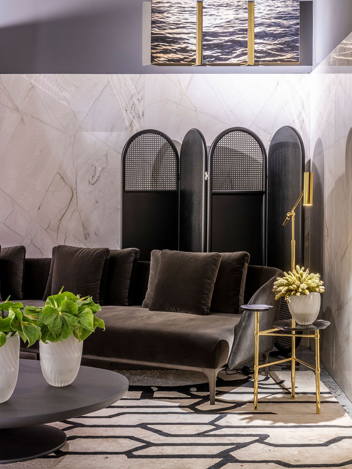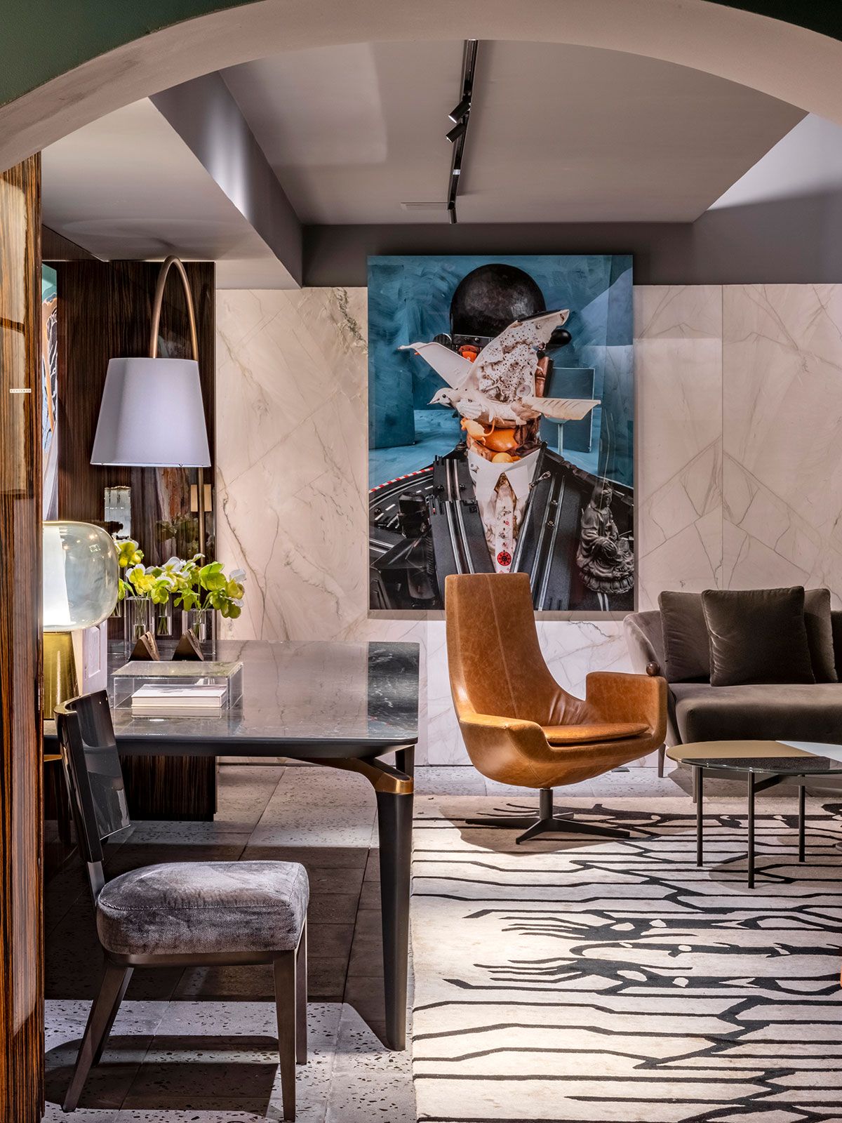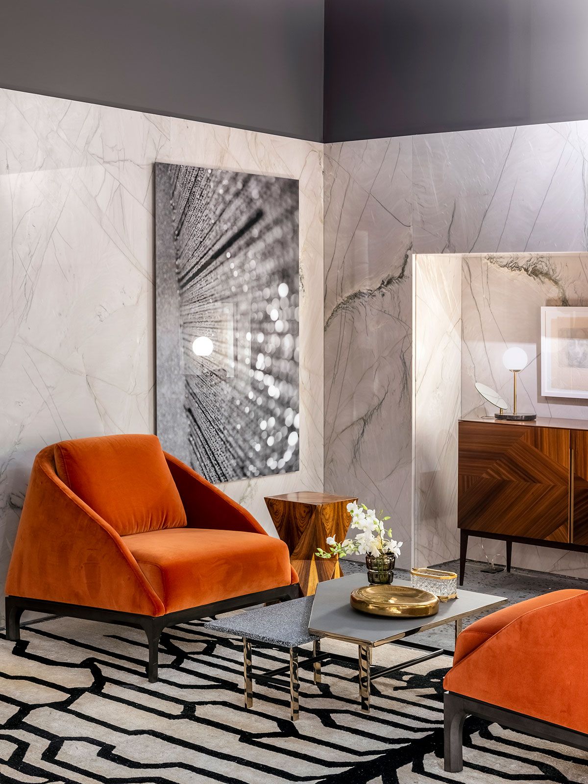 O ambiente assinado pelo Gustavo Martin para a CasaCor SP 2019 é o Les Hérons. O espaço de 49m² é inspirado na art deco que marcou lobbys icônicos dos hotéis do início do século 20 e foi criado para recepcionar os convidados de uma casa, é uma zona de relaxamento onde acontecem pequenos encontros ou curtas esperas.