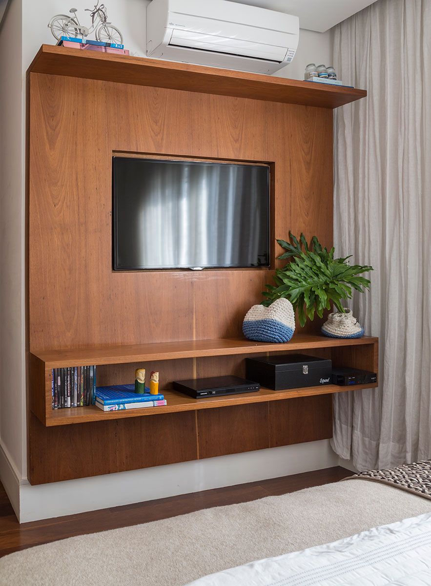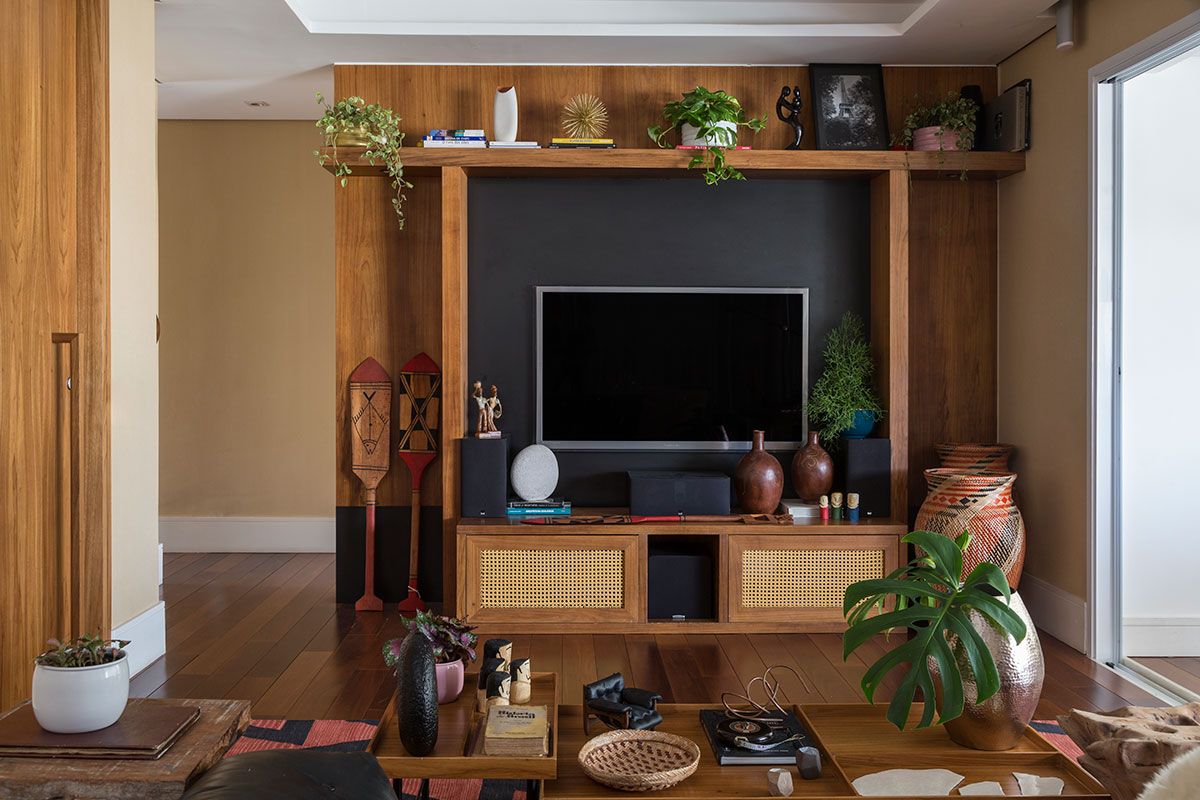 Ao desenhar o móvel do home theater o escritório pensou em revestir as frentes das portas com palha indiana, pois permitem que o sinal do controle remoto passe através delas sem precisar abri-las.