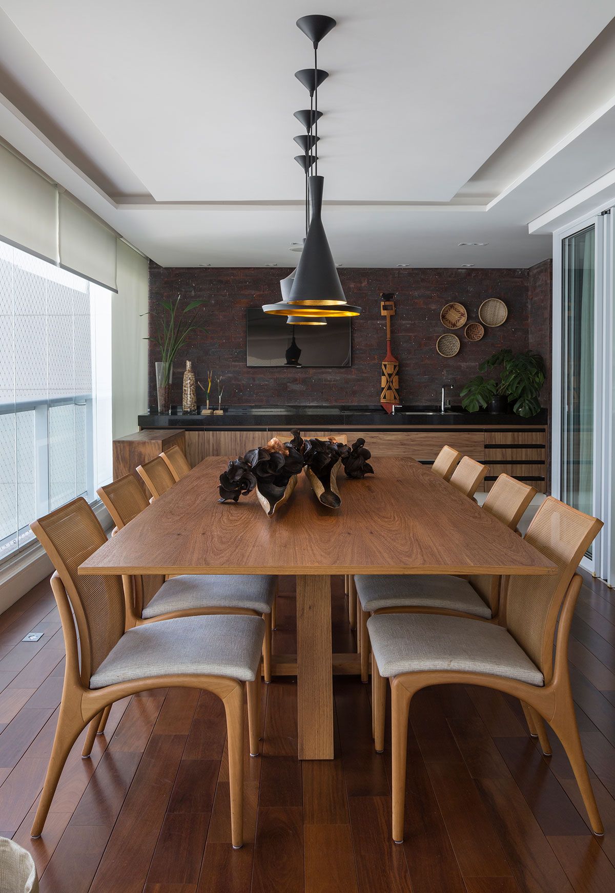 A integração dos espaços da varanda com área social e sala de jantar foi graças ao assoalho de madeira nos dois ambientes. Um dos pedidos especial dos clientes era investir em tecnologia para criar cenas de iluminação, áudio e vídeo.