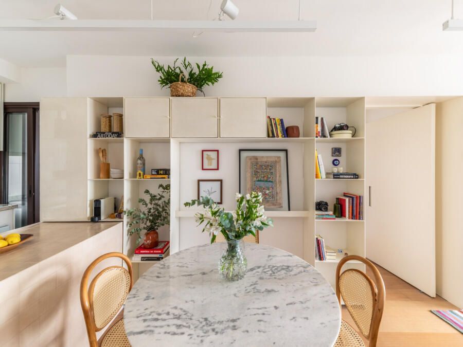 Ao longo do percurso, a estante se adapta às diferentes funções da casa. Na cozinha, incorpora armários para utensílios e se aproxima da área de preparo; na transição para a sala de jantar, se ajusta para conviver com a mesa; já na sala de TV, abriga o nicho para equipamentos e prateleiras que exibem objetos pessoais. Essa mutabilidade reforça a ideia de um espaço vivo, que acompanha as transformações do dia a dia.