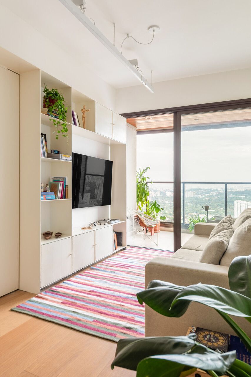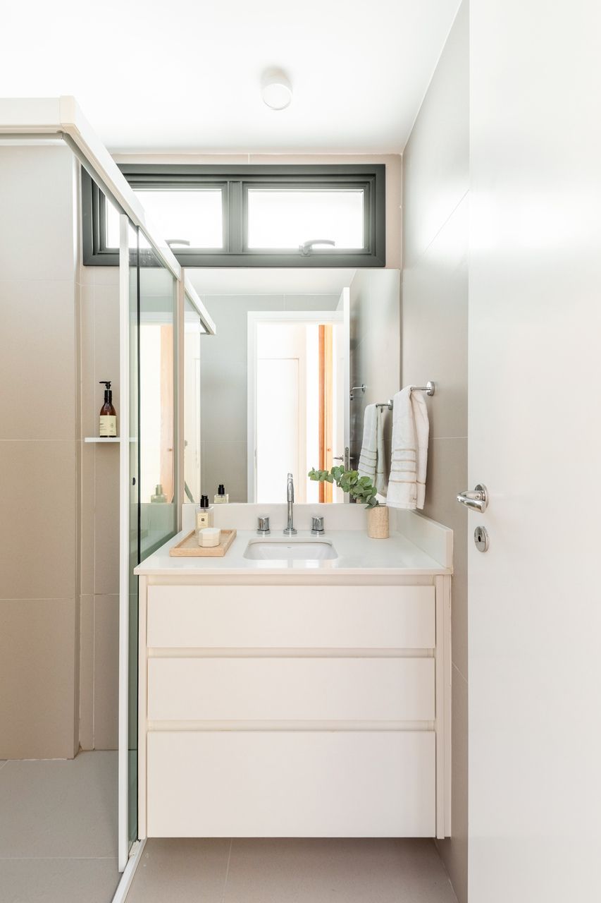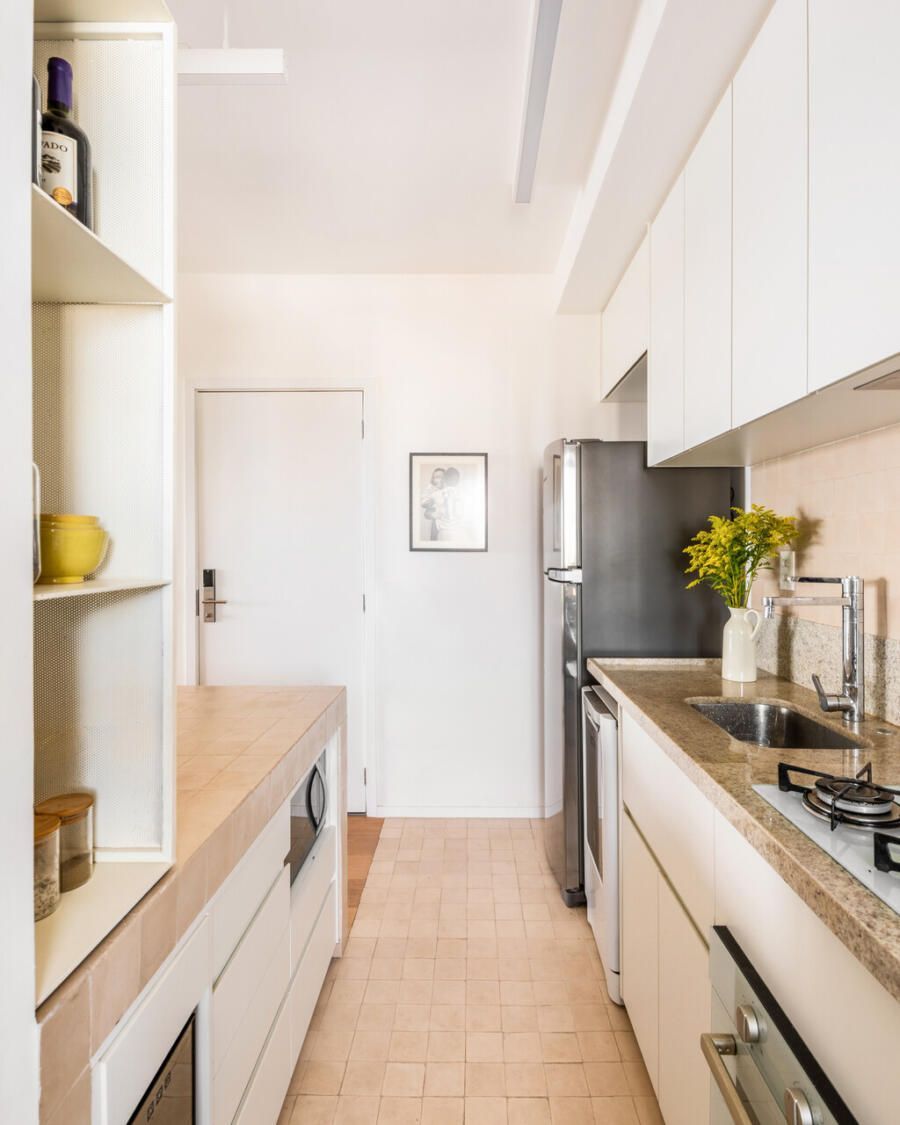 A escolha da serralheria foi estratégica para garantir leveza visual e reduzir a espessura das divisórias, além de permitir soluções como portas em chapa metálica perfurada, que favorecem a ventilação e criam áreas de armazenamento mais reservadas.Em um apartamento compacto, recém-entregue pela construtora, o maior desafio esteve em promover a integração dos ambientes sem abrir mão do resguardo necessário às áreas íntimas. A busca por amplitude na área social caminhou lado a lado com a necessidade de organizar funções distintas de maneira fluida, evitando excessos e garantindo leveza visual. Cada solução foi pensada para potencializar o uso do espaço, concentrando diferentes atividades em elementos versáteis e bem resolvidos.