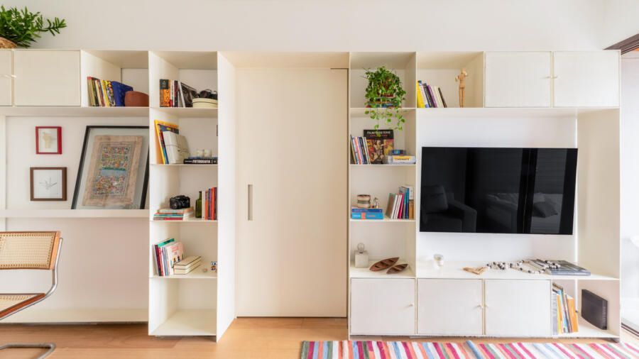 Ao longo do percurso, a estante se adapta às diferentes funções da casa. Na cozinha, incorpora armários para utensílios e se aproxima da área de preparo; na transição para a sala de jantar, se ajusta para conviver com a mesa; já na sala de TV, abriga o nicho para equipamentos e prateleiras que exibem objetos pessoais. Essa mutabilidade reforça a ideia de um espaço vivo, que acompanha as transformações do dia a dia.