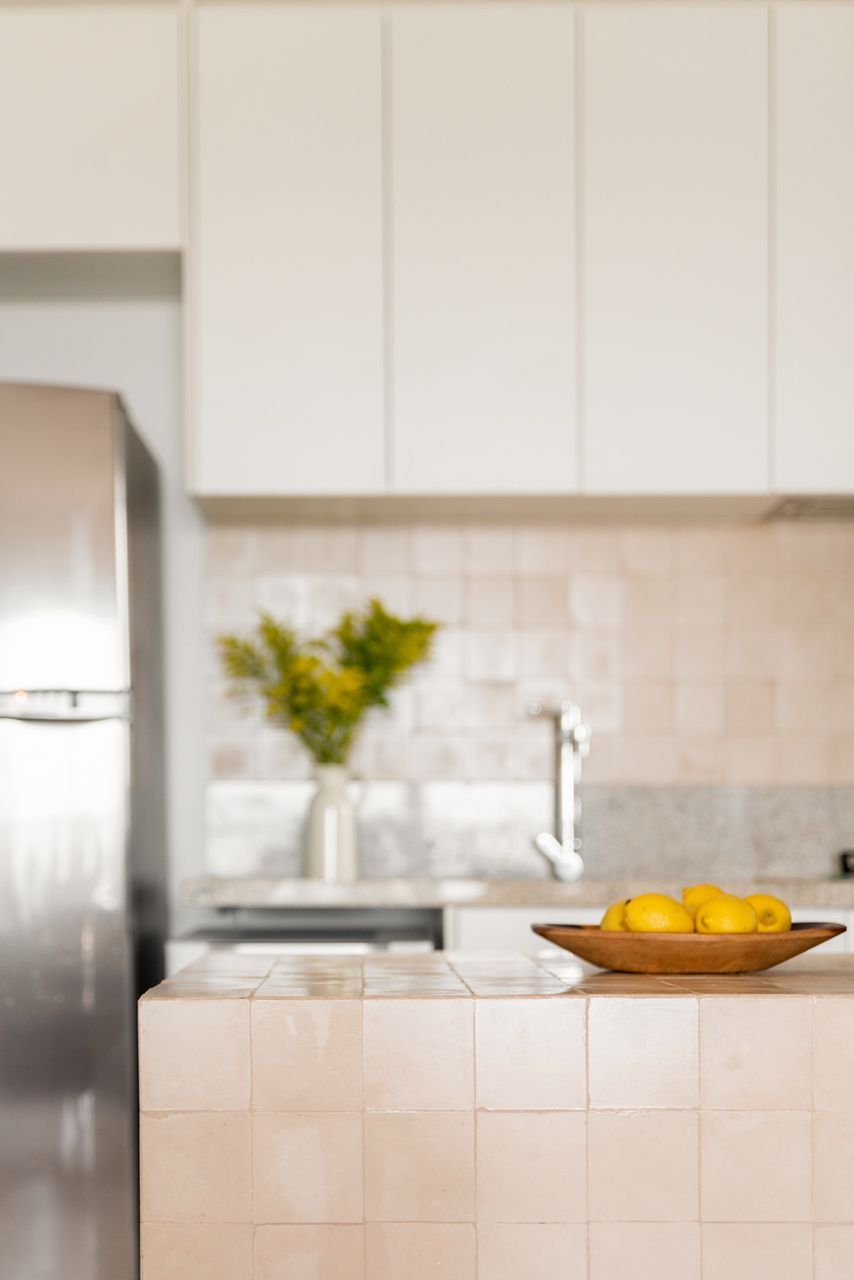 A escolha dos materiais seguiu uma lógica que valoriza tanto a estética quanto o desempenho ao longo do tempo. A preferência por elementos naturais reflete a intenção de criar uma base que envelheça com qualidade, incorporando as marcas do uso de forma positiva. Da mesma maneira, o ladrilho hidráulico aparece como protagonista na cozinha, aplicado no piso, na parede e também na superfície da bancada em ilha, reforçando a sensação de continuidade e contribuindo para o conforto térmico do ambiente. Já nas demais áreas do apartamento, o assoalho de carvalho foi eleito pela sua durabilidade e sofisticação, conferindo unidade e aconchego aos espaços.