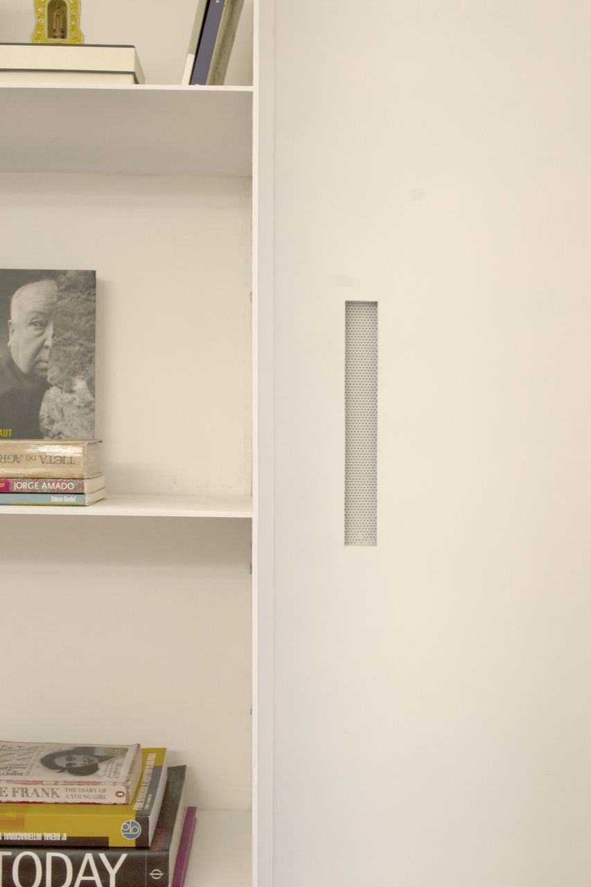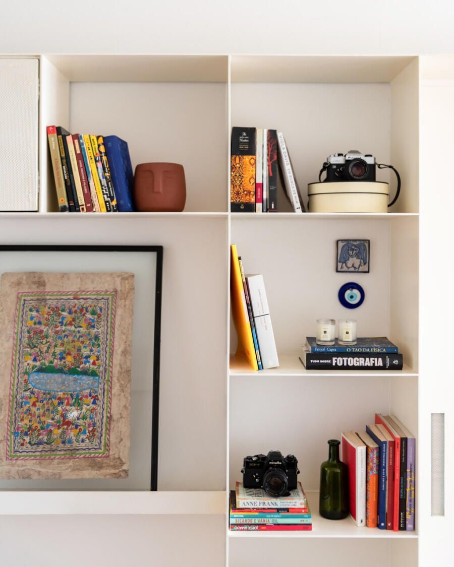 O grande protagosnista do projeto é a estante de serralheria com seis metros de extensão, que percorre o apartamento como um eixo organizador. Mais do que um elemento funcional, ela estrutura o layout e conecta os ambientes, ao mesmo tempo em que abriga uma solução engenhosa: portas camufladas que levam aos quartos e banheiros, garantindo discrição e continuidade visual.