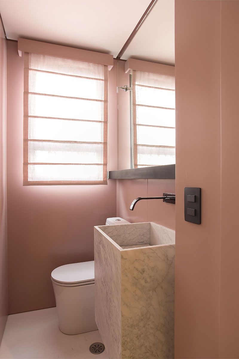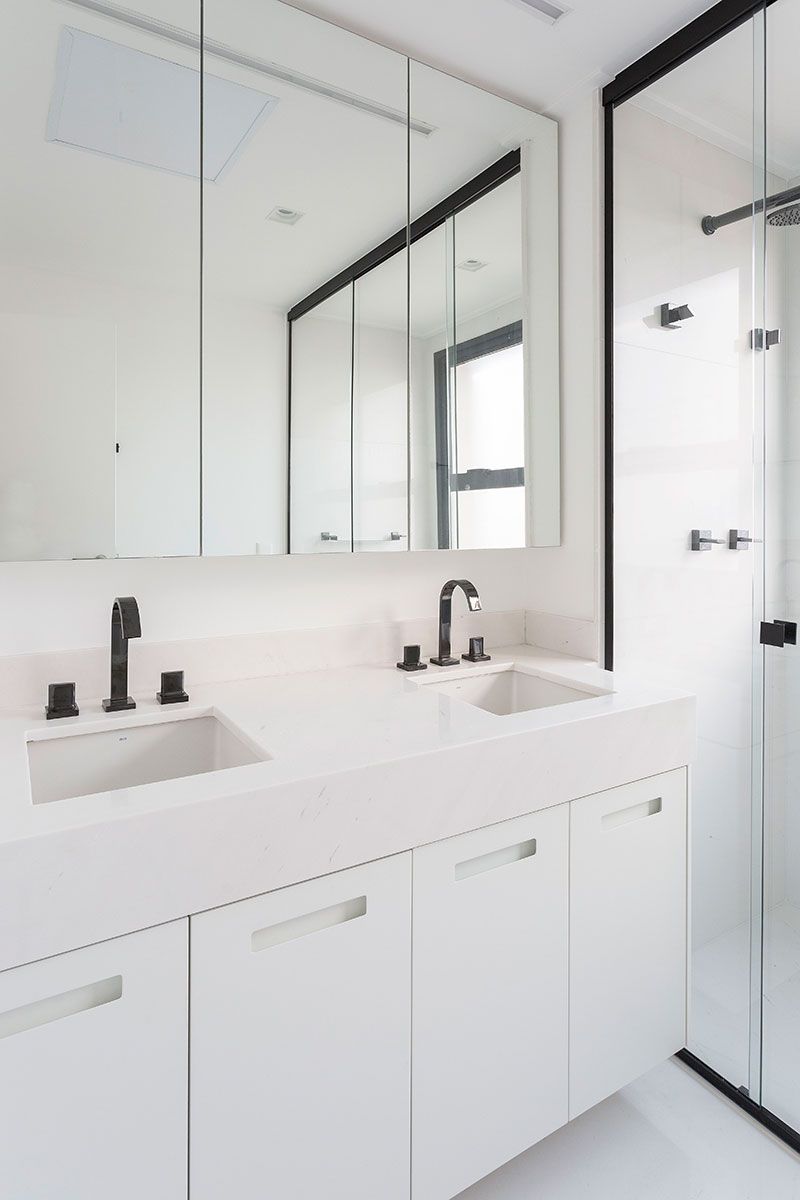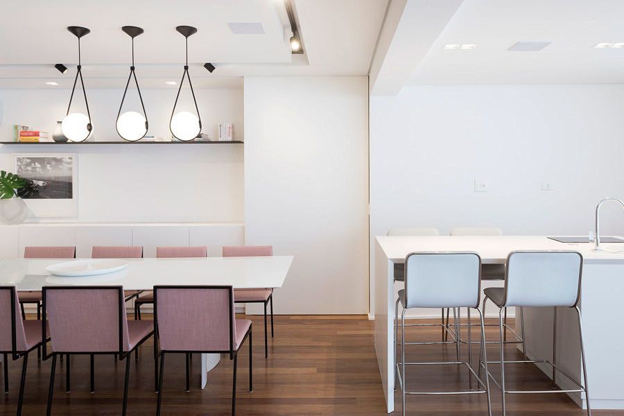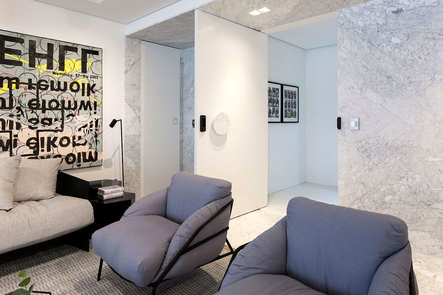 A marcenaria tem desenho clean e discreto, pois a intenção era de que ficasse quase invisível. Com isso, móveis e peças assinadas ganham ainda mais destaque.