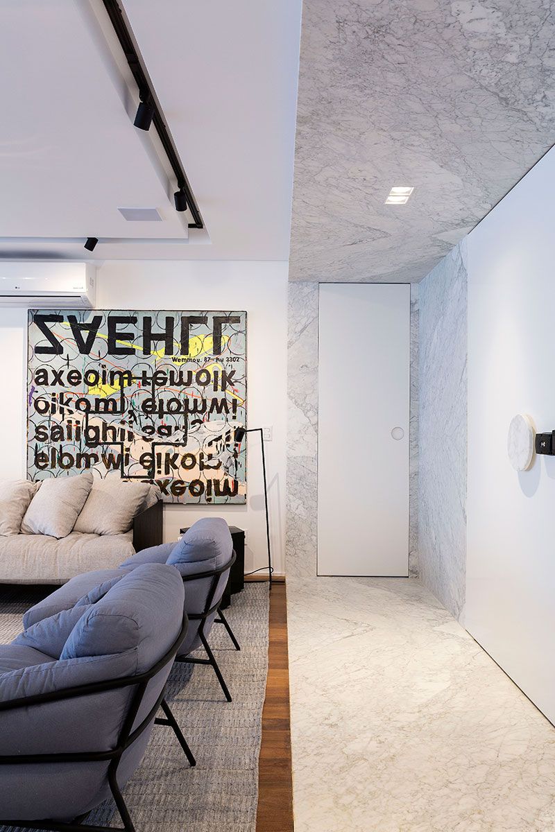 A partir da porta do hall, há uma galeria, de onde são visualizados praticamente todos os ambientes da área social. A galeria é o eixo de distribuição do apartamento, conduzindo ao hall e ao lavabo e dando acesso aos quartos. Com piso, teto e paredes revestidos em mármore.