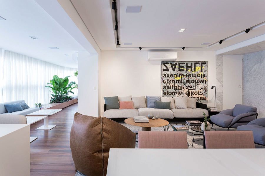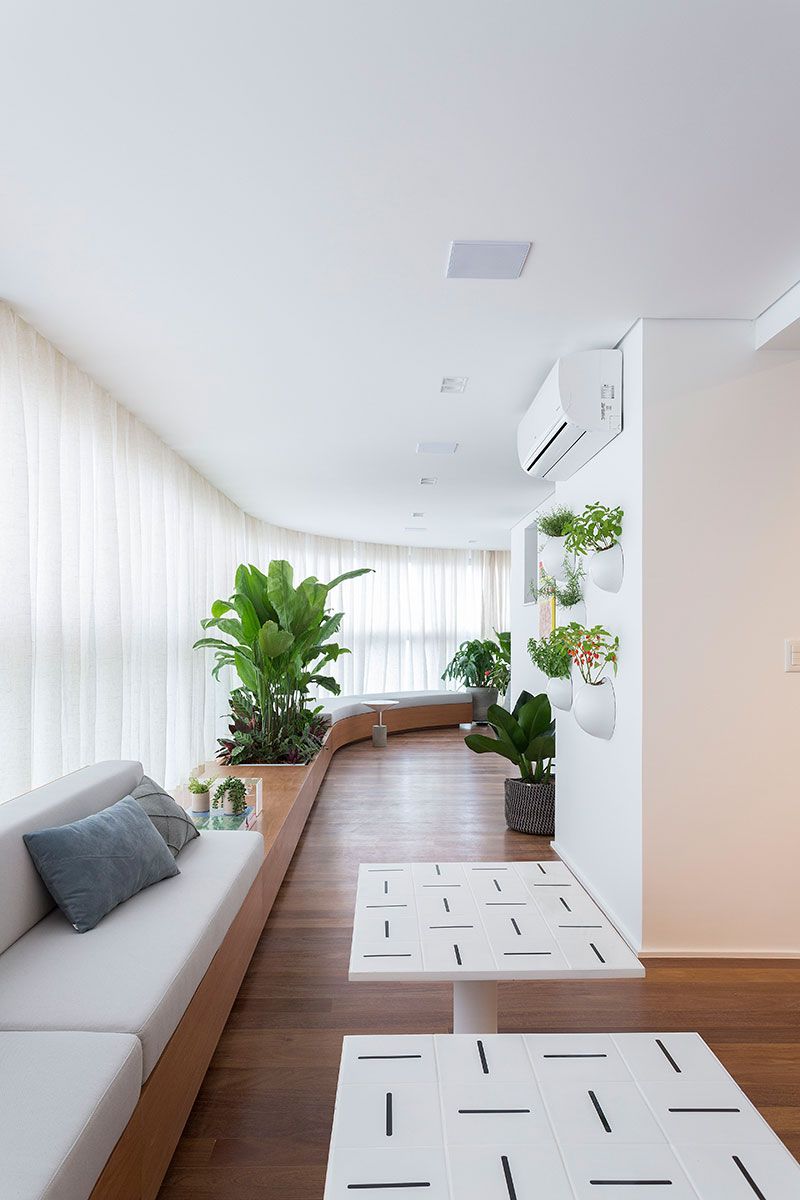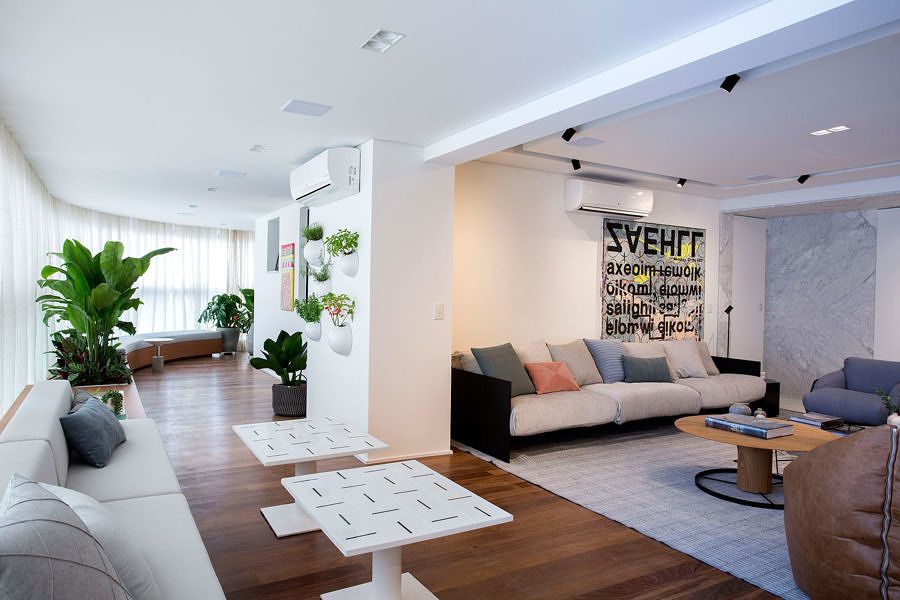 Outro destaque do projeto é o terraço, integrado ao estar e ao jantar, é uma faixa alongada, com um banco que serve como extensão da área de estar, acompanhando o envidraçamento do terraço. Ele tem múltiplas funções: além de compor o estar, é utilizado para refeições, uma vez que a mesa de centro tem altura ajustável, abrigando também cachepôs com plantas.