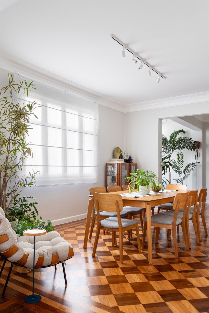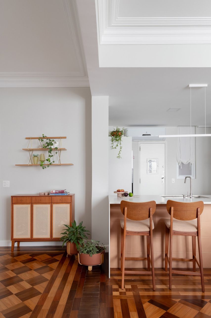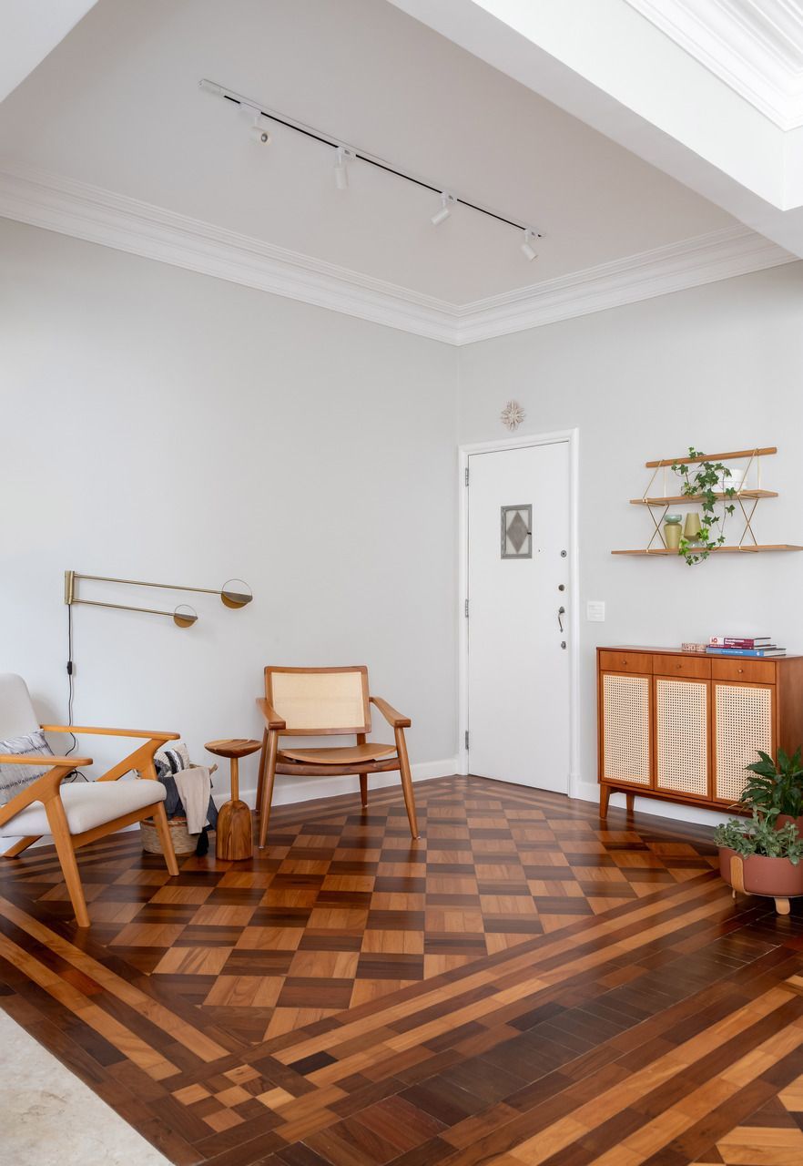 Na paleta cromática do décor, a designer conta que quis fugir do branco, mas manter o apartamento claro. Por isso, buscou um tom entre cinza e verde para deixar os espaços mais acolhedores com o mobiliário existente e contrastar com as portas, janelas e sancas de gesso brancos. No quesito materiais e acabamentos, a madeira está presente em todos os cômodos, tanto no piso original em taco como no mobiliário e nas marcenarias, que combinam acabamento em freijó natural com branco.