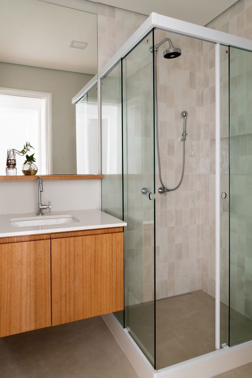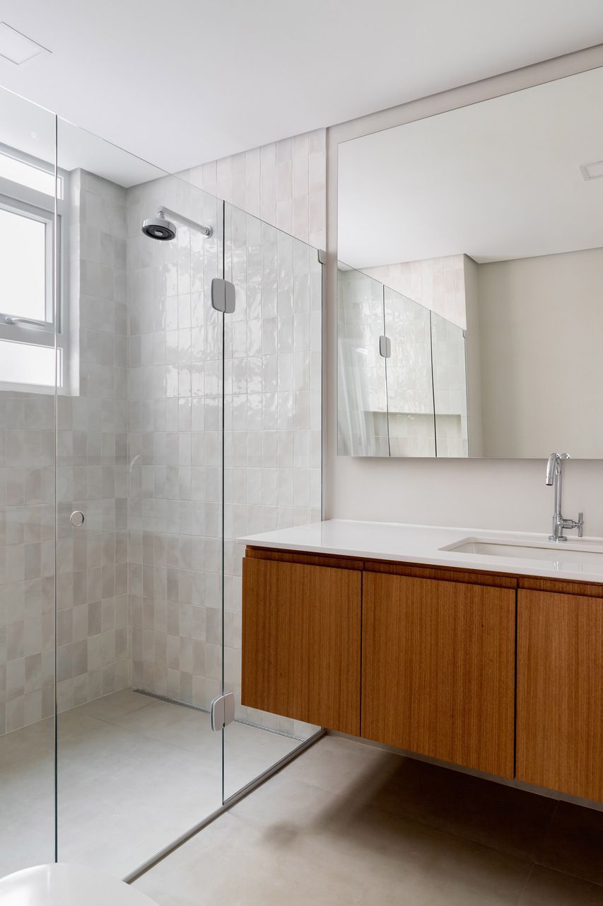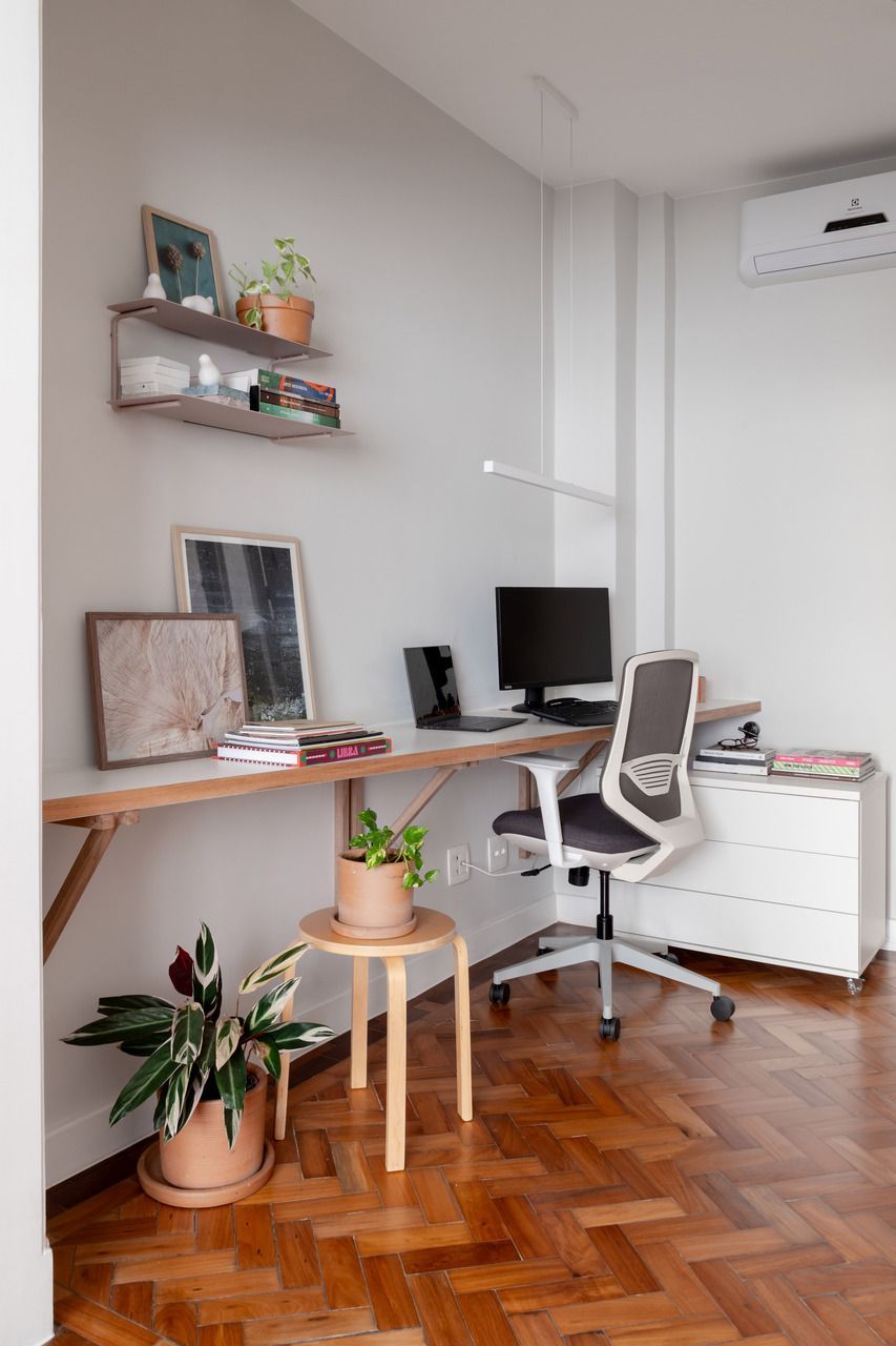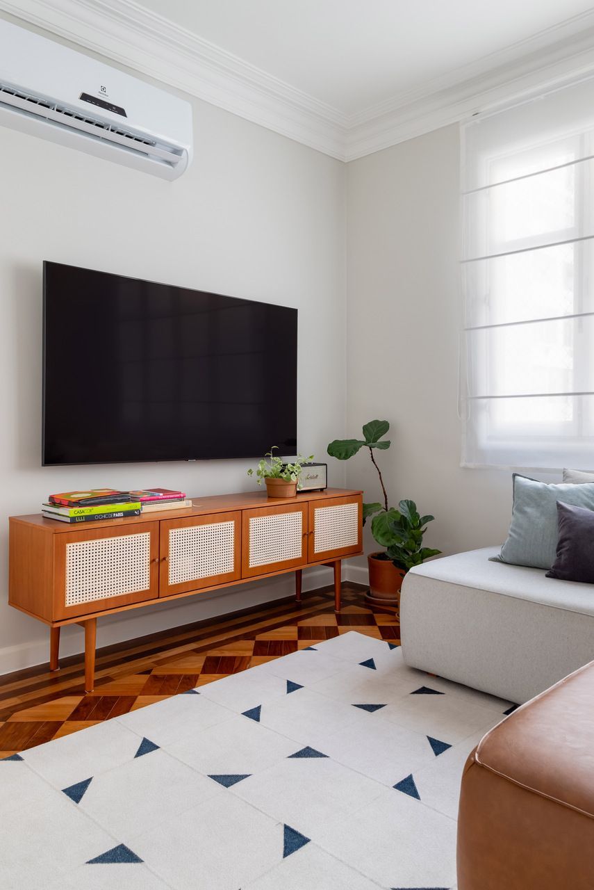 Na paleta cromática do décor, a designer conta que quis fugir do branco, mas manter o apartamento claro. Por isso, buscou um tom entre cinza e verde para deixar os espaços mais acolhedores com o mobiliário existente e contrastar com as portas, janelas e sancas de gesso brancos. No quesito materiais e acabamentos, a madeira está presente em todos os cômodos, tanto no piso original em taco como no mobiliário e nas marcenarias, que combinam acabamento em freijó natural com branco.