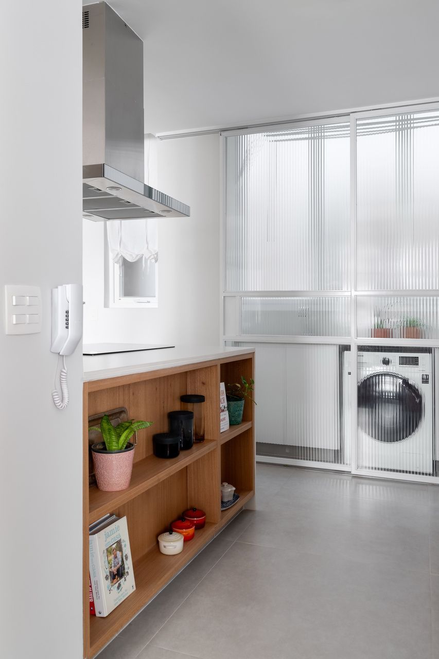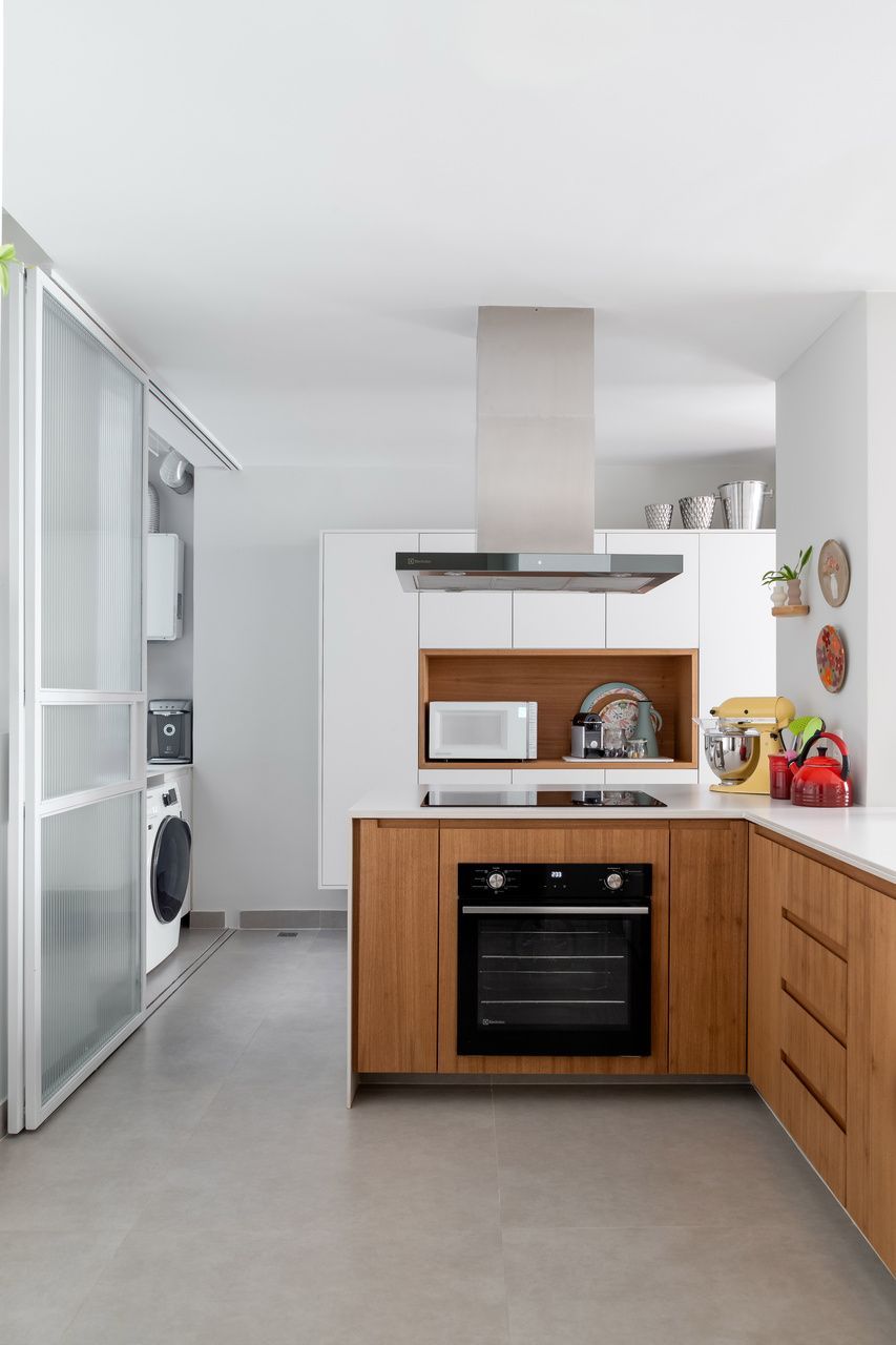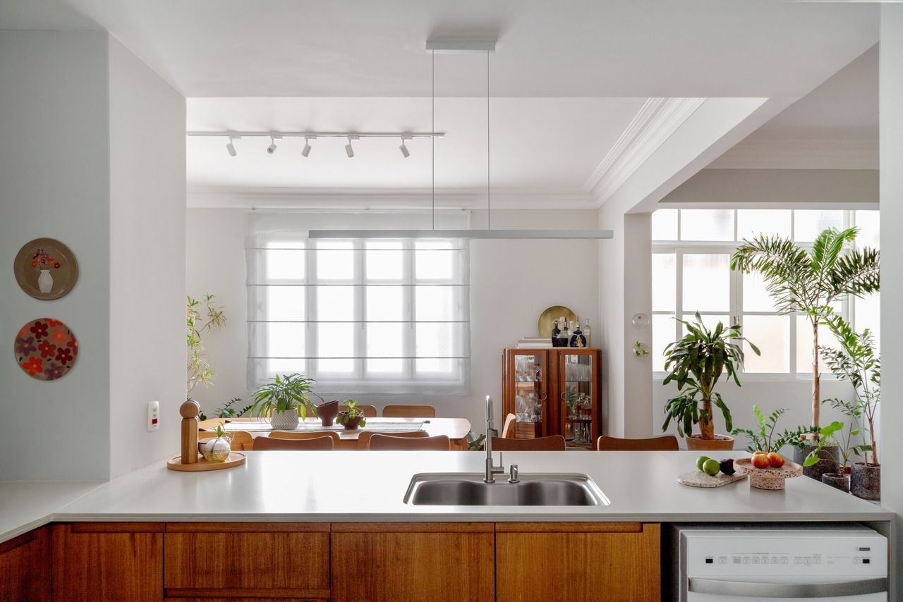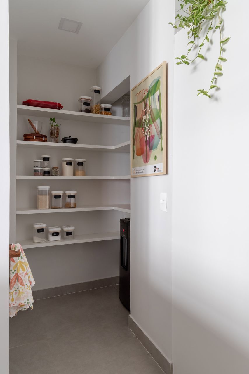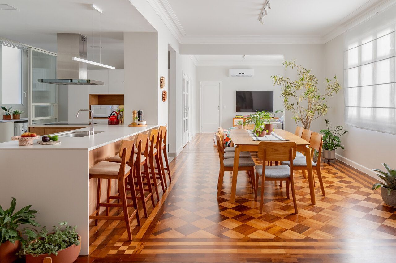 O imóvel apresentava marcas de infiltração, piso muito danificado e a família não tinha a intenção de usar as dependências de serviço. Como a ideia era fazer uma reforma completa para garantir ambientes amplos e confortáveis, a designer integrou o hall de entrada, a sala de jantar, o living e a cozinha e reaproveitou uma porta dupla que dividia duas salas no acesso ao novo escritório, antes ocupado pelo quarto de serviço e uma parte do corredor íntimo. No outro lado do corredor foi criado um lavabo que não existia e o antigo banheiro de serviço foi incorporado ao banheiro social para torna-lo maior.