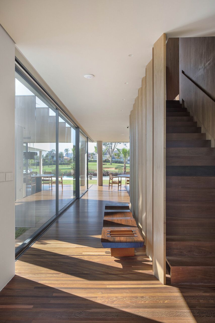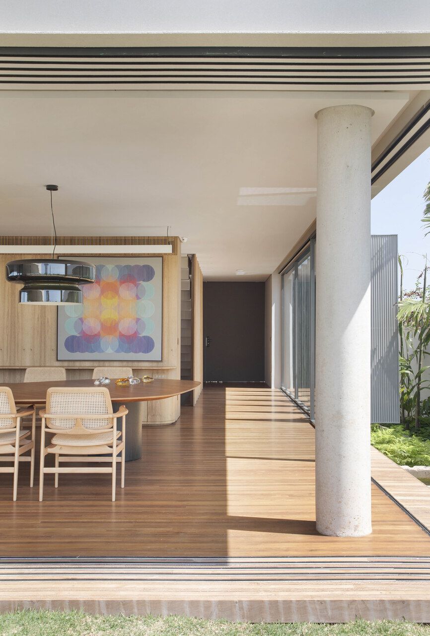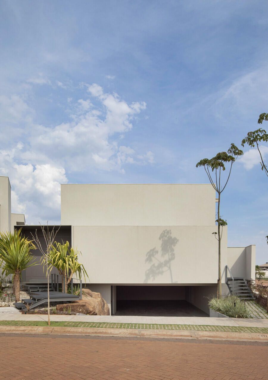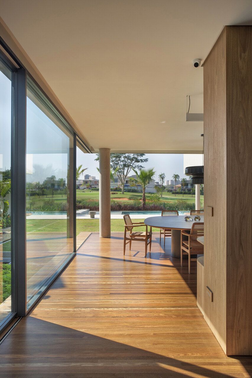 Com 797m² distribuídos em dois andares, a casa foi construída com concreto, vidro e madeira, combinando linhas retas e tons neutros. No térreo, ficam a área social, a cozinha e os espaços de serviço. No andar de cima, estão três suítes e um escritório que também pode ser usado como quarto de hóspedes. A parte superior da casa fica suspensa sobre pilotis aparentes, criando um visual leve.